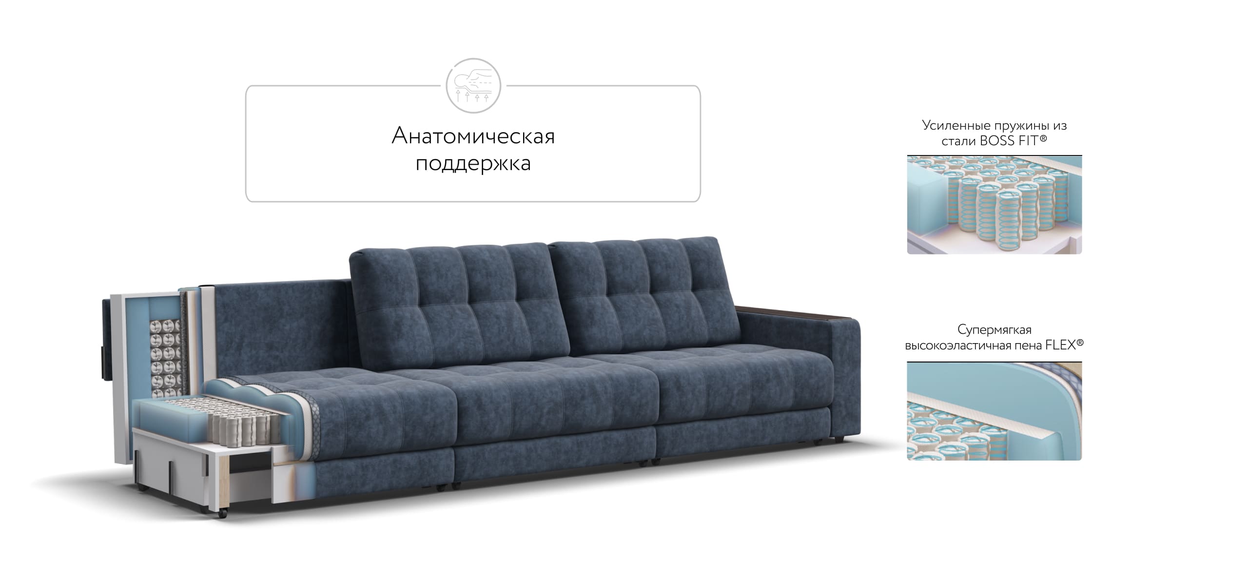 Диван BOSS GRAND - большой, стильный и комфортный диван, предназначенный для просторной комнаты. Продуманный до мелочей диван BOSS сочетает в себе надежный каркас, мягкие ткани, многофункциональность и быструю сборку за 1 минуту без инструментов - ощутите комфорт у себя дома!