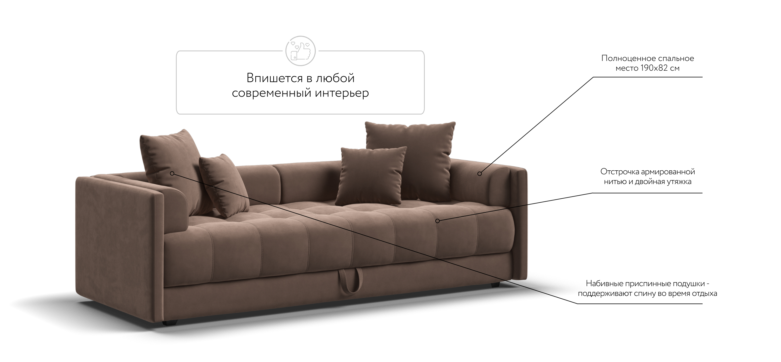 Тахта отлично сочетает в себе две функции: днем – уютное место для отдыха и работы в качестве дивана, а ночью полноценное спальное место. Формованные подушки-спинки помогут расслабиться во время отдыха, поддерживая голову в комфортном положении.