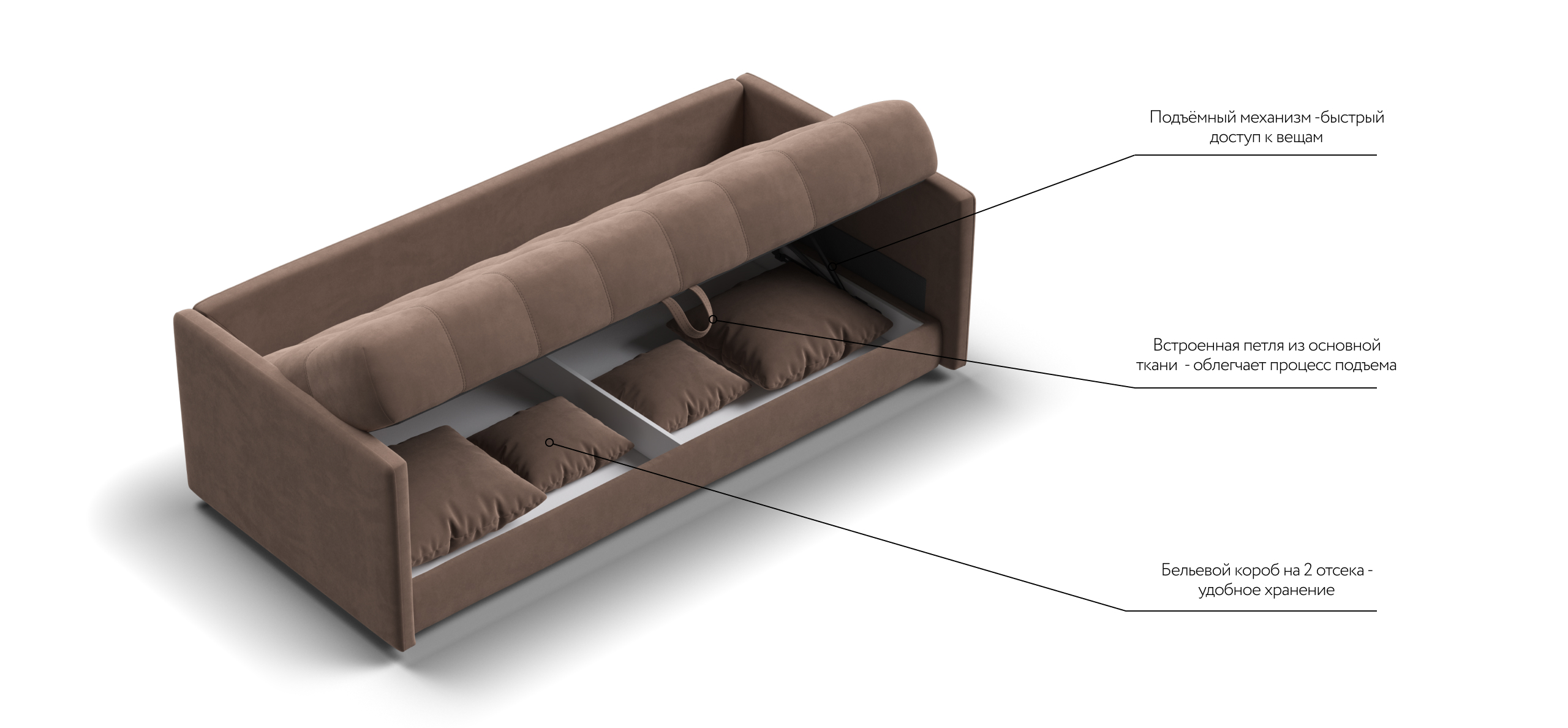 Вместительный бельевой короб в основании позволит Вам убрать на ночь приспинные подушки, а днем хранить постельные принадлежности.