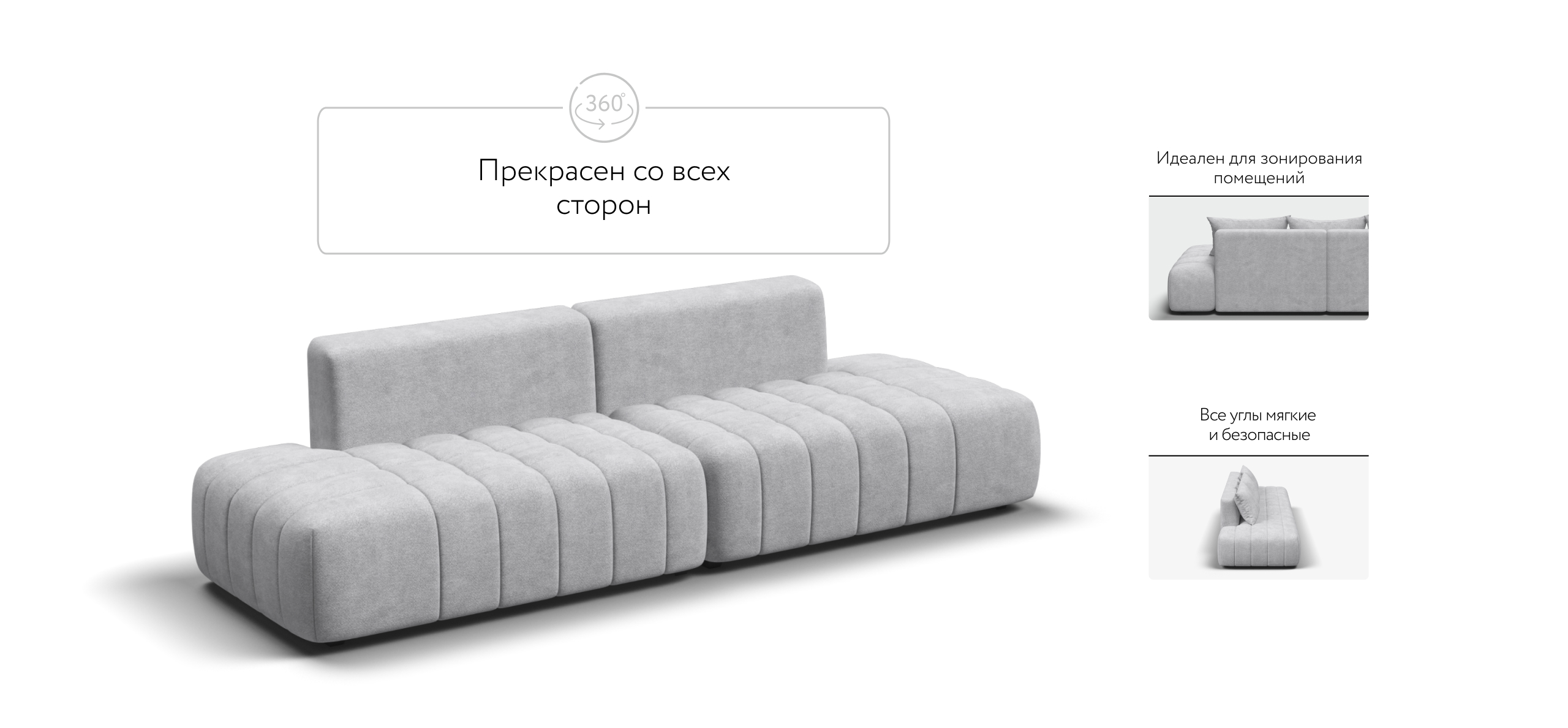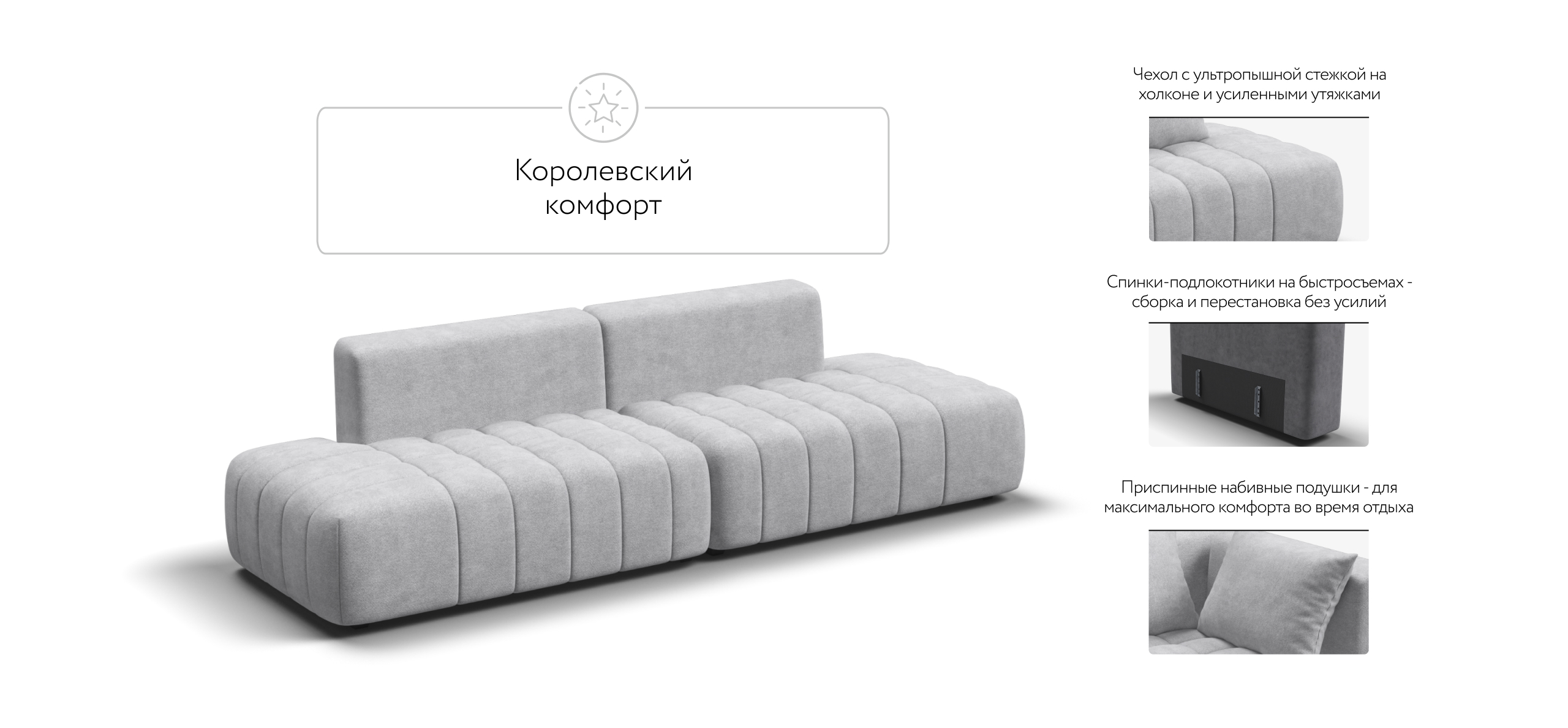Благодаря инновационной системе креплений и быстросъёмным элементам Вы с лёгкостью можете поменять конфигурацию и адаптировать диван под новое пространство.
