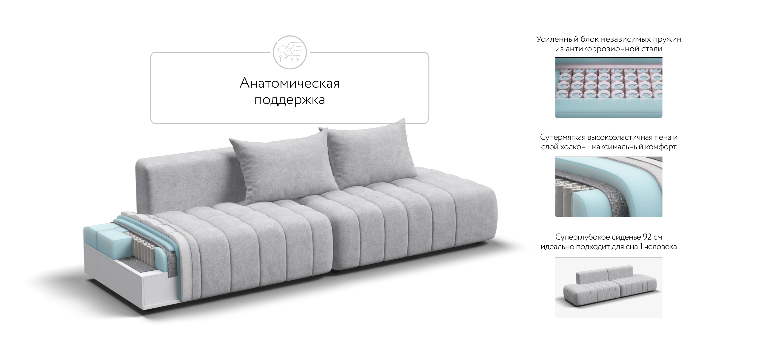 Глубокое сиденье и независимые пружины в основании словно созданы для полного расслабления, а мягкие спинки обеспечивают комфорт без лишних подушек.