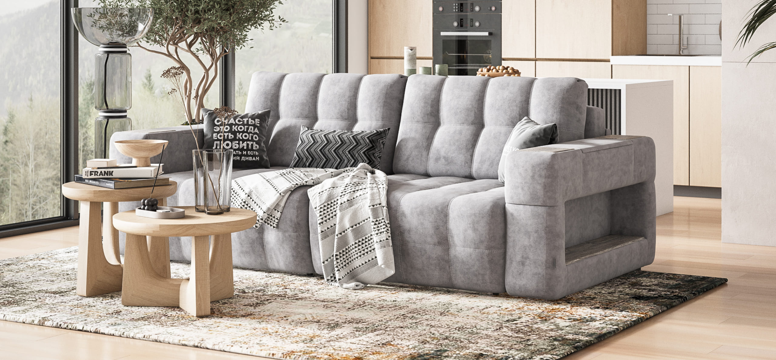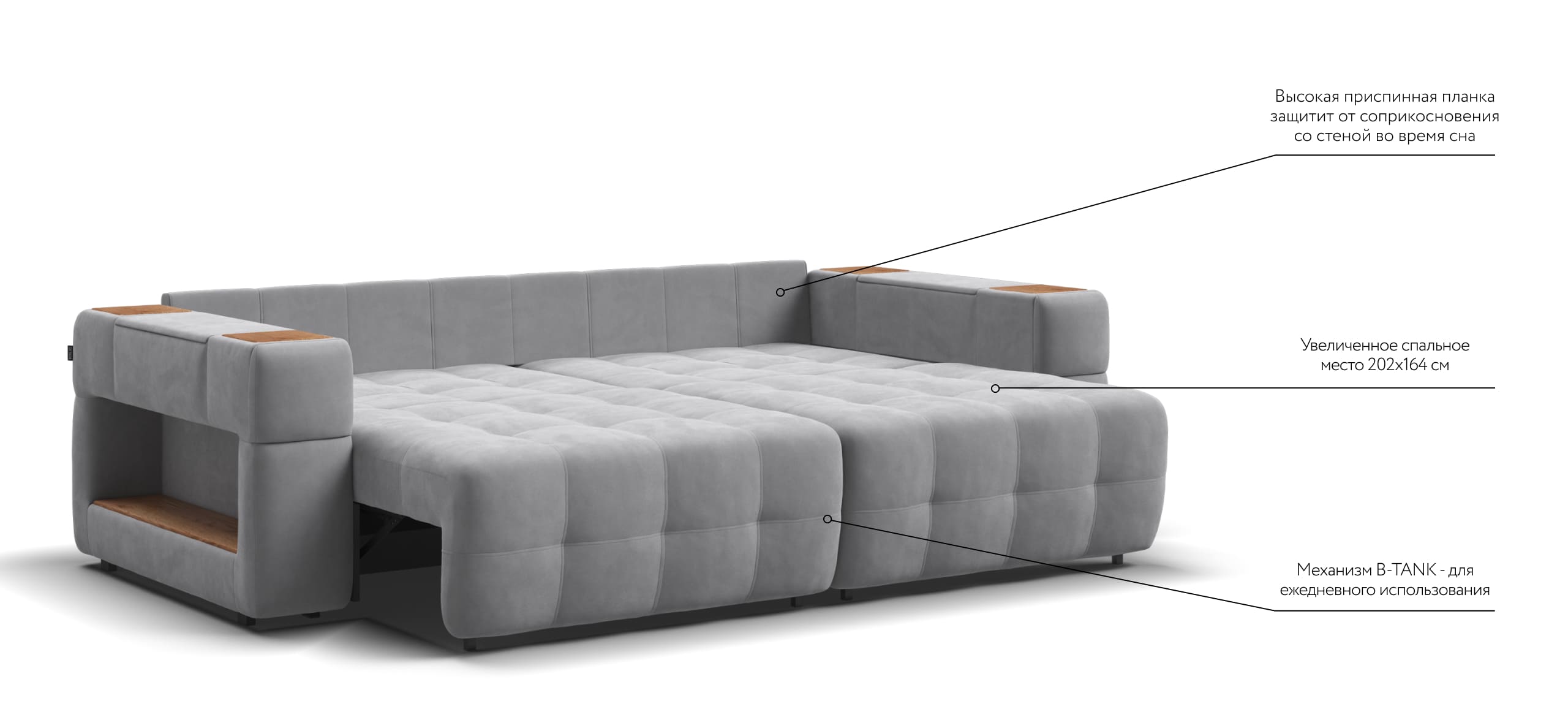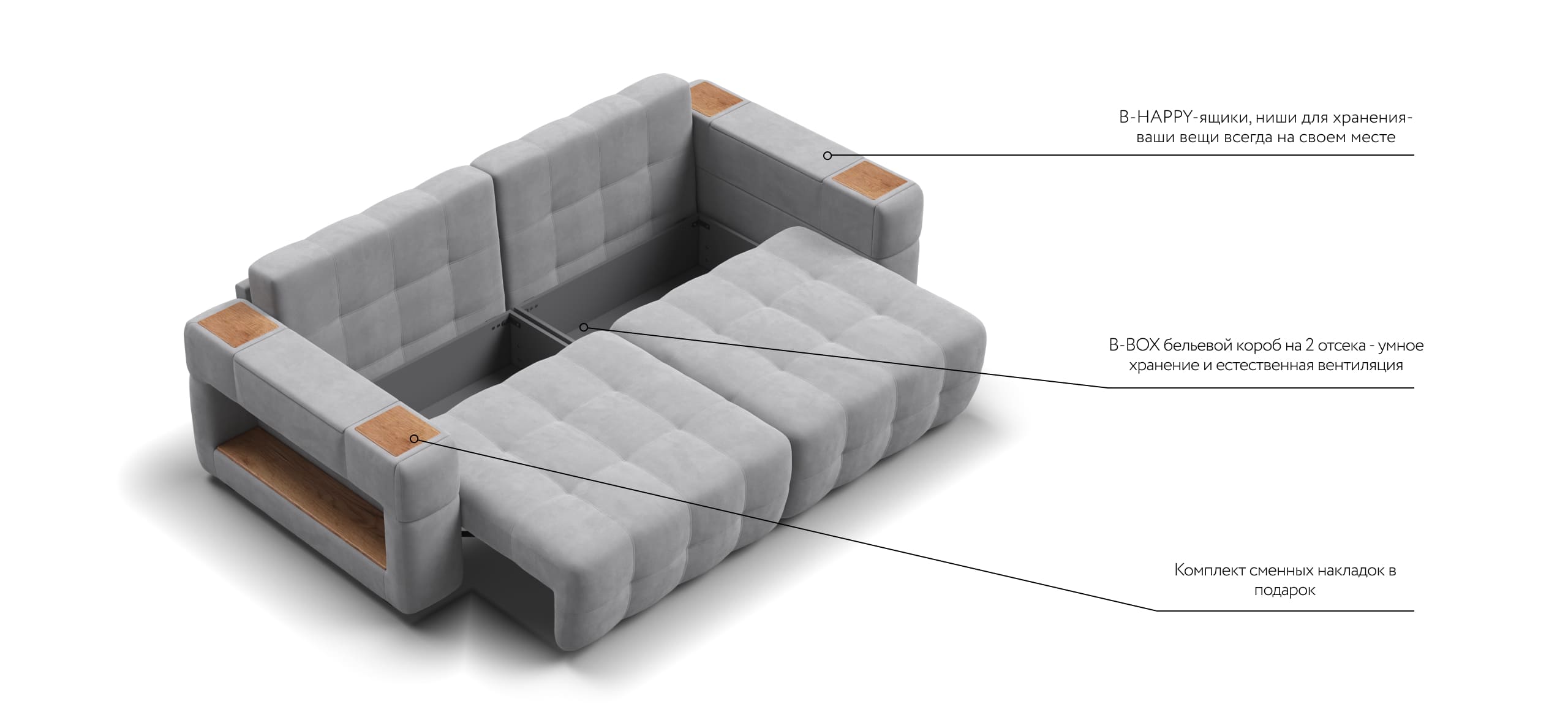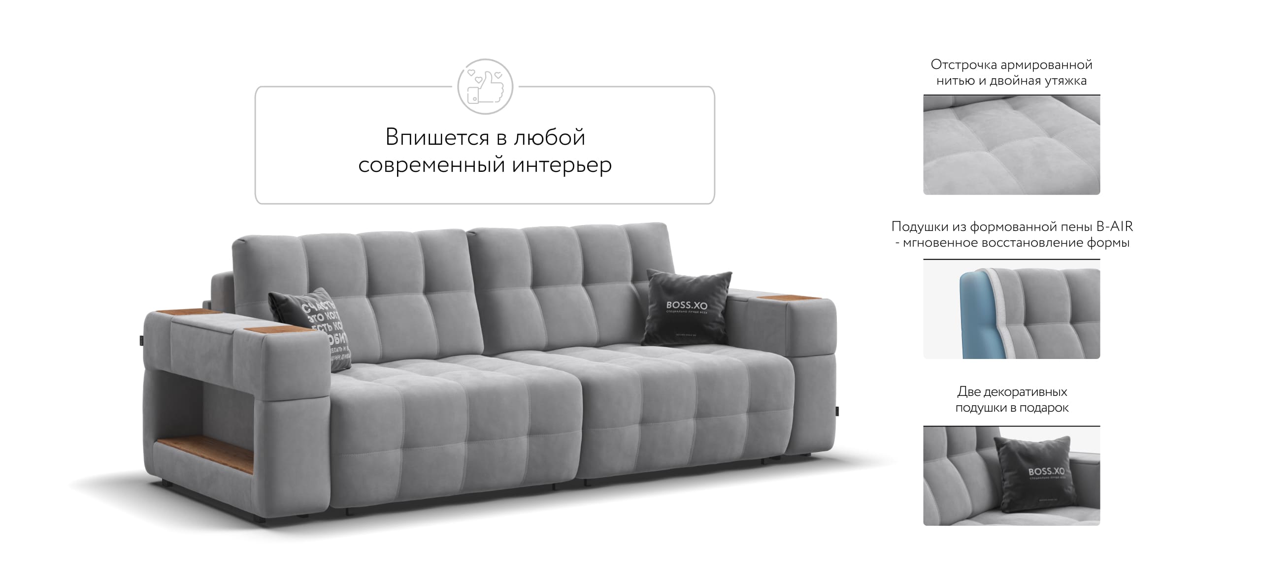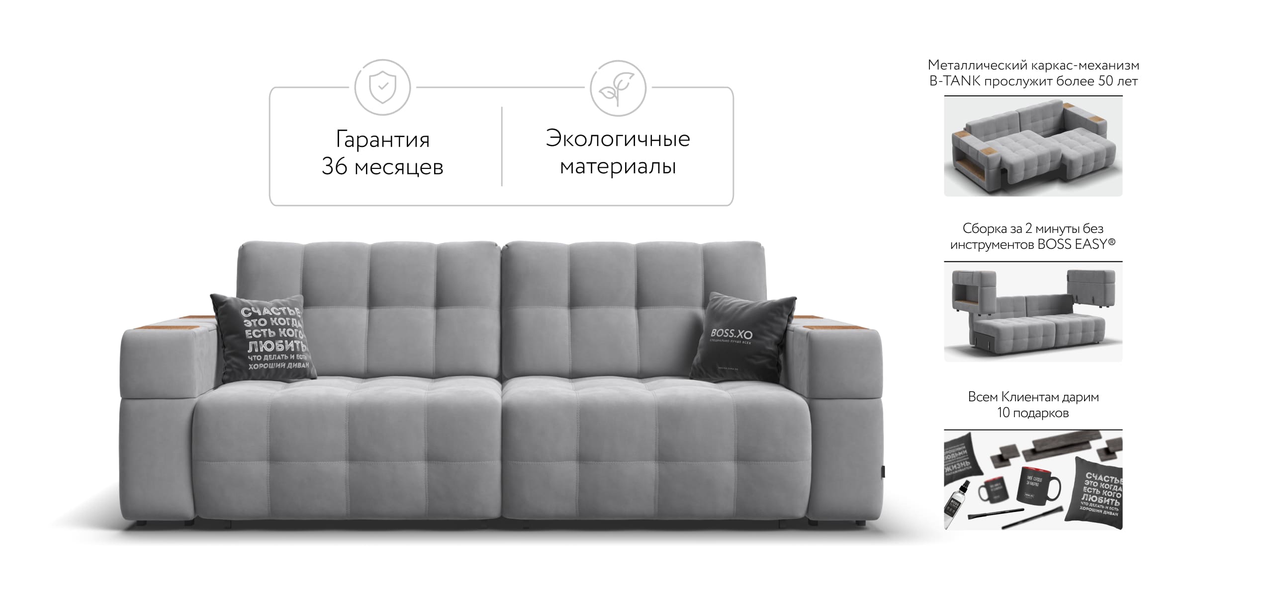 Покупая диван BOSS.XO вы становитесь обладателем уникальных подарков: быстрая зарядка для смартфона, 2 стильных кружки, 2 удобных столика для ноутбука, 2 подушки, комплект запасных накладок на подлокотники B-HAPPY®️, экоручки и средство для чистки BOSS Clean.Характеристики