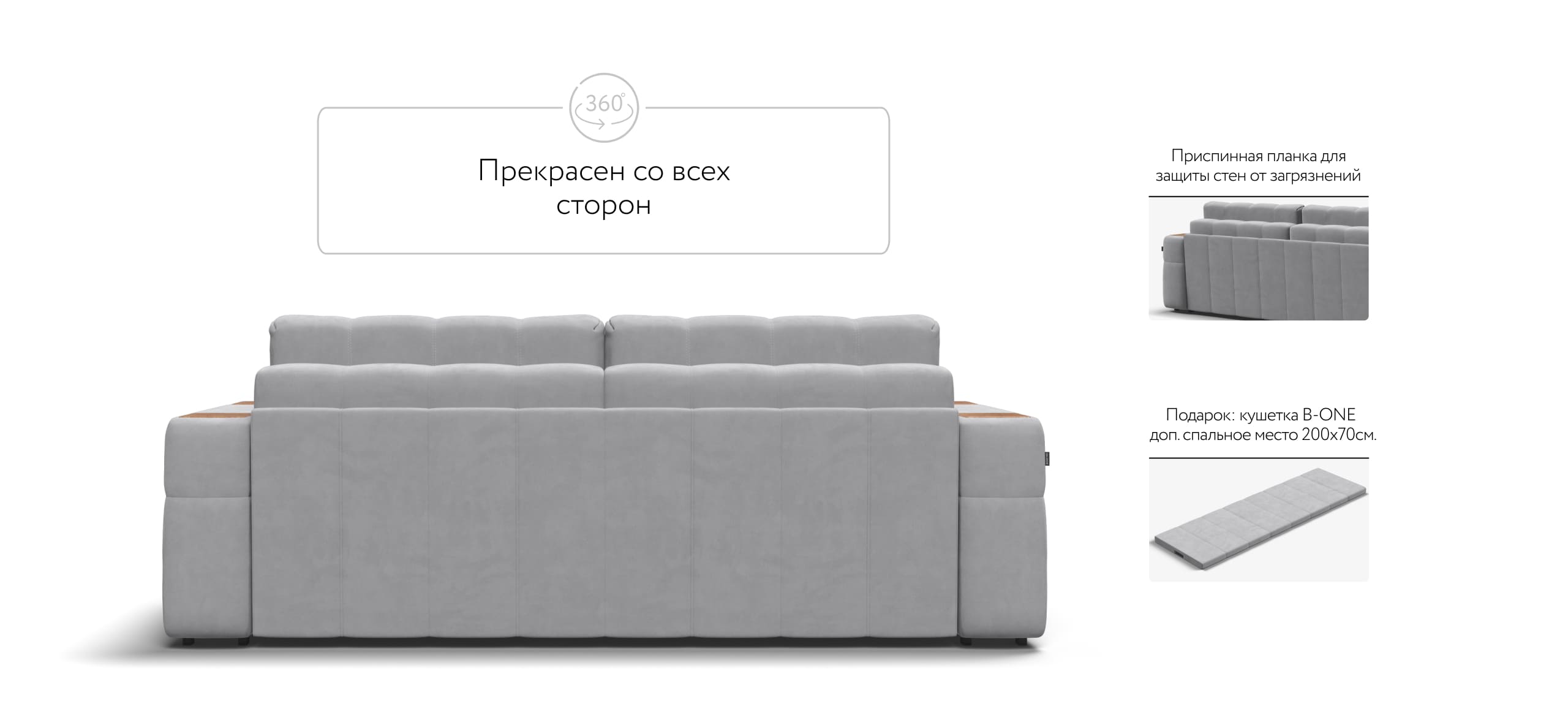 Покупая диван BOSS.XO вы становитесь обладателем уникальных подарков: быстрая зарядка для смартфона, 2 стильных кружки, 2 удобных столика для ноутбука, 2 подушки, комплект запасных накладок на подлокотники B-HAPPY®️, экоручки и средство для чистки BOSS Clean.Преимущества материала