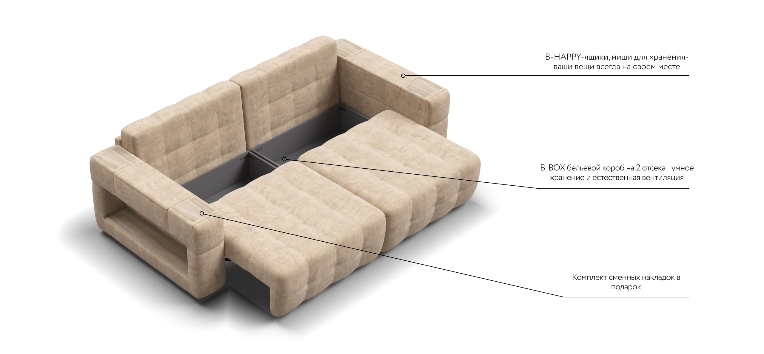 Функциональные подлокотники B-HAPPY: ящики и ниши для хранения, ваши вещи всегда на своем месте.