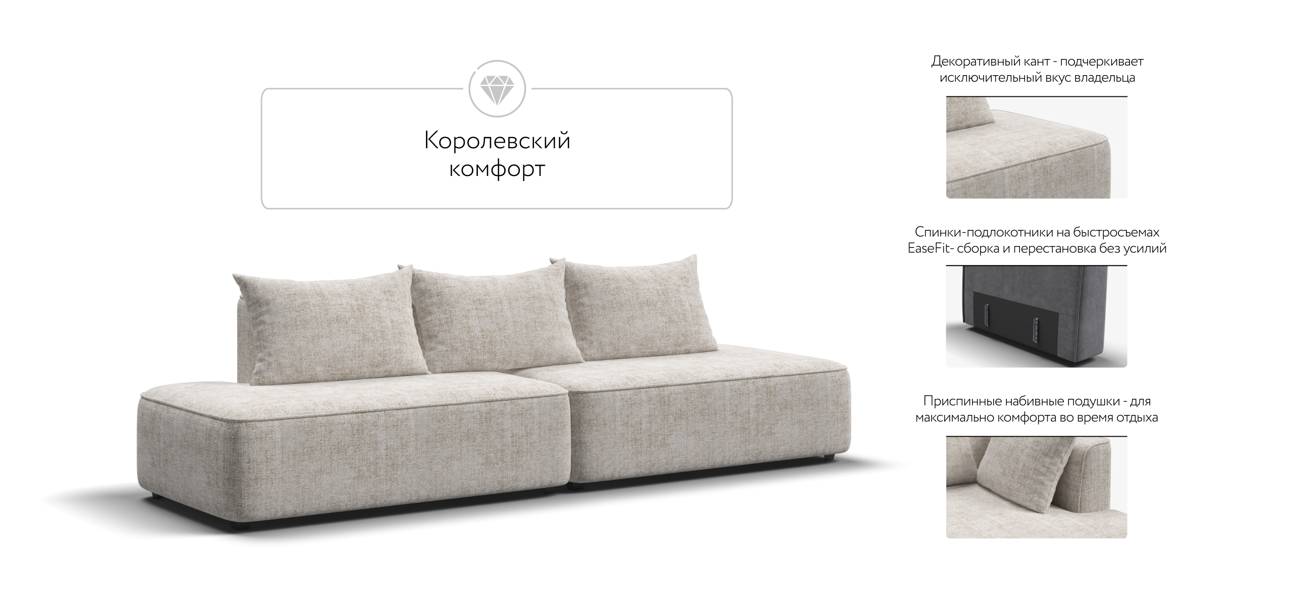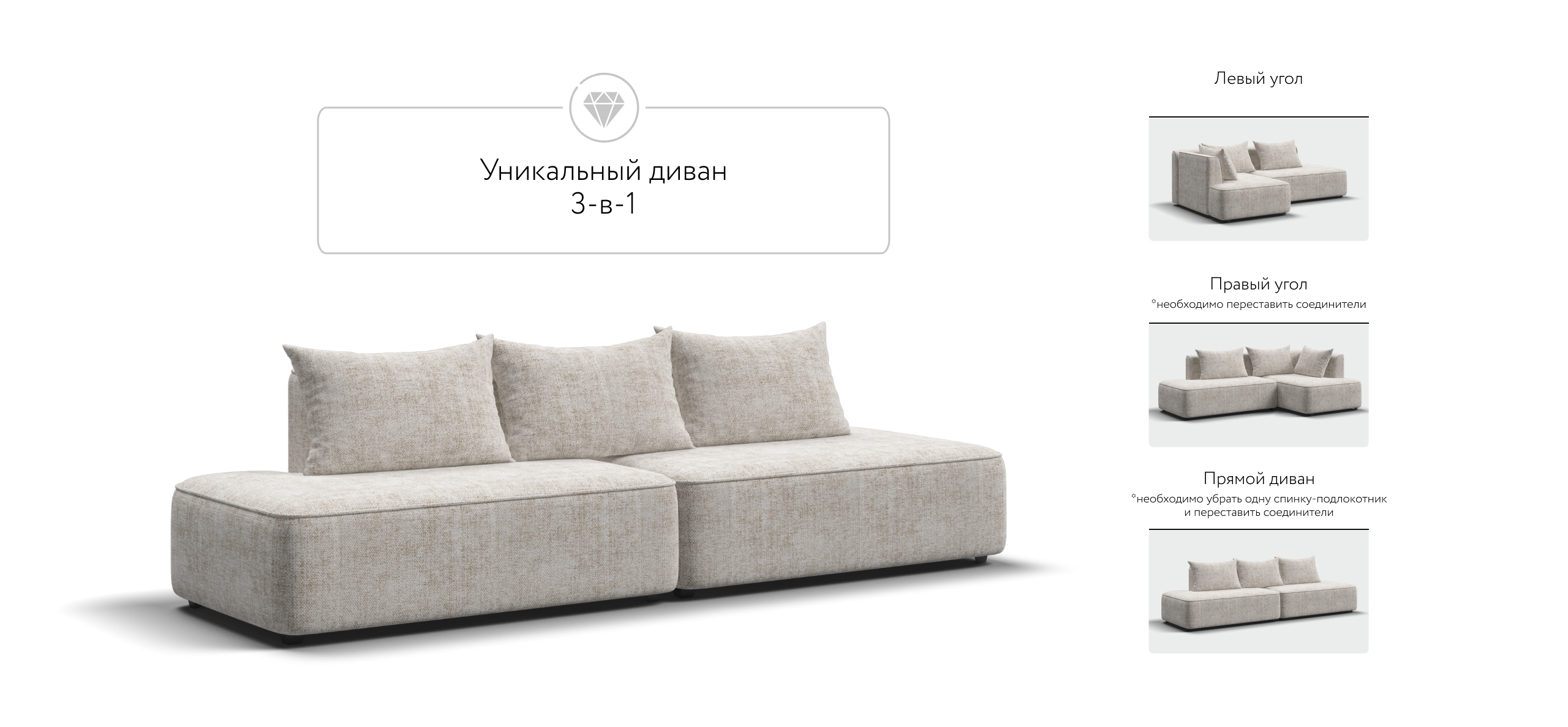 Благодаря инновационной системе креплений и быстросъёмным элементам Вы с лёгкостью можете поменять конфигурацию и адаптировать диван под новое пространство.