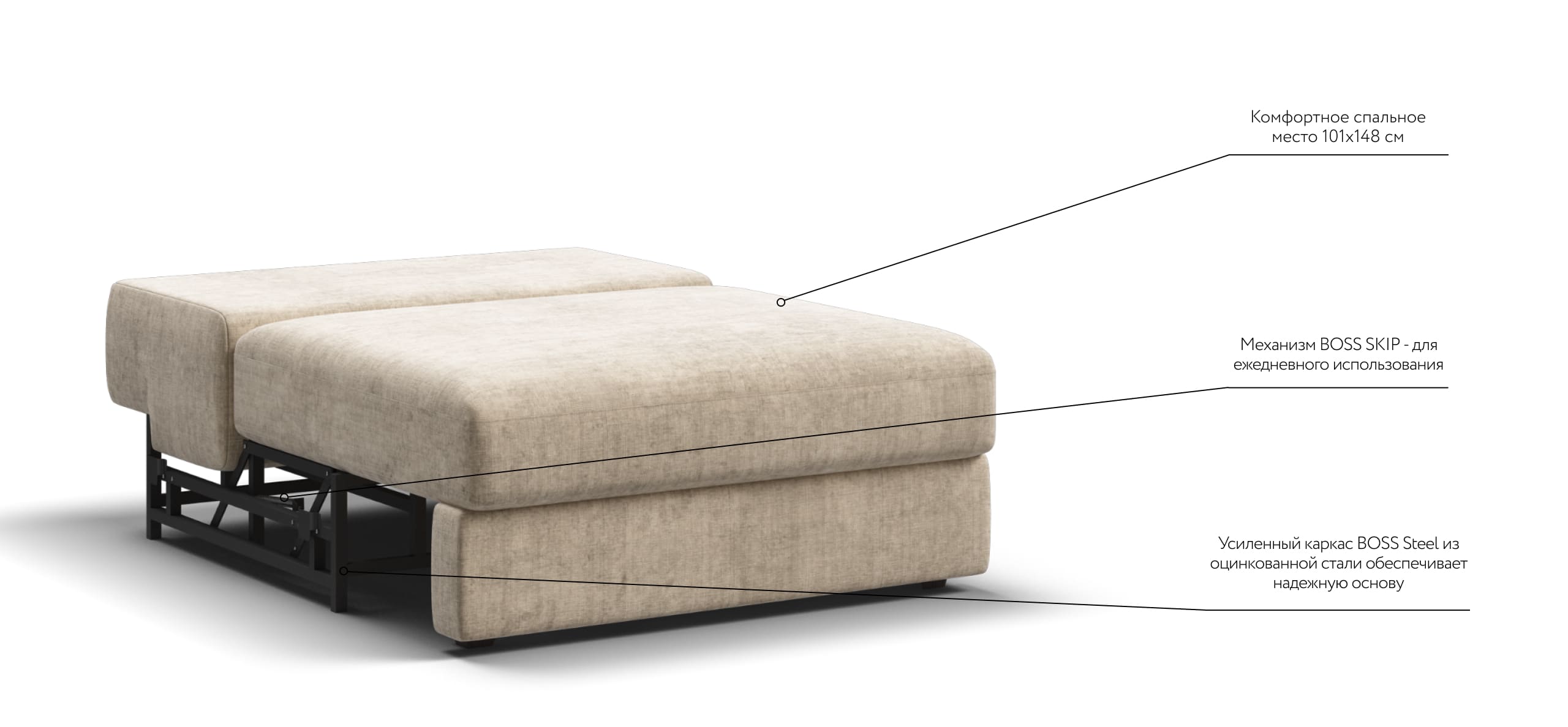 Boss skip – механизм трансформации, легко превращает модульную систему в комфортную просторную кровать. Тип механизма «пантограф» позволяет сохранить мягкую утопающую посадку, в отличие от более дешевых аналогов.