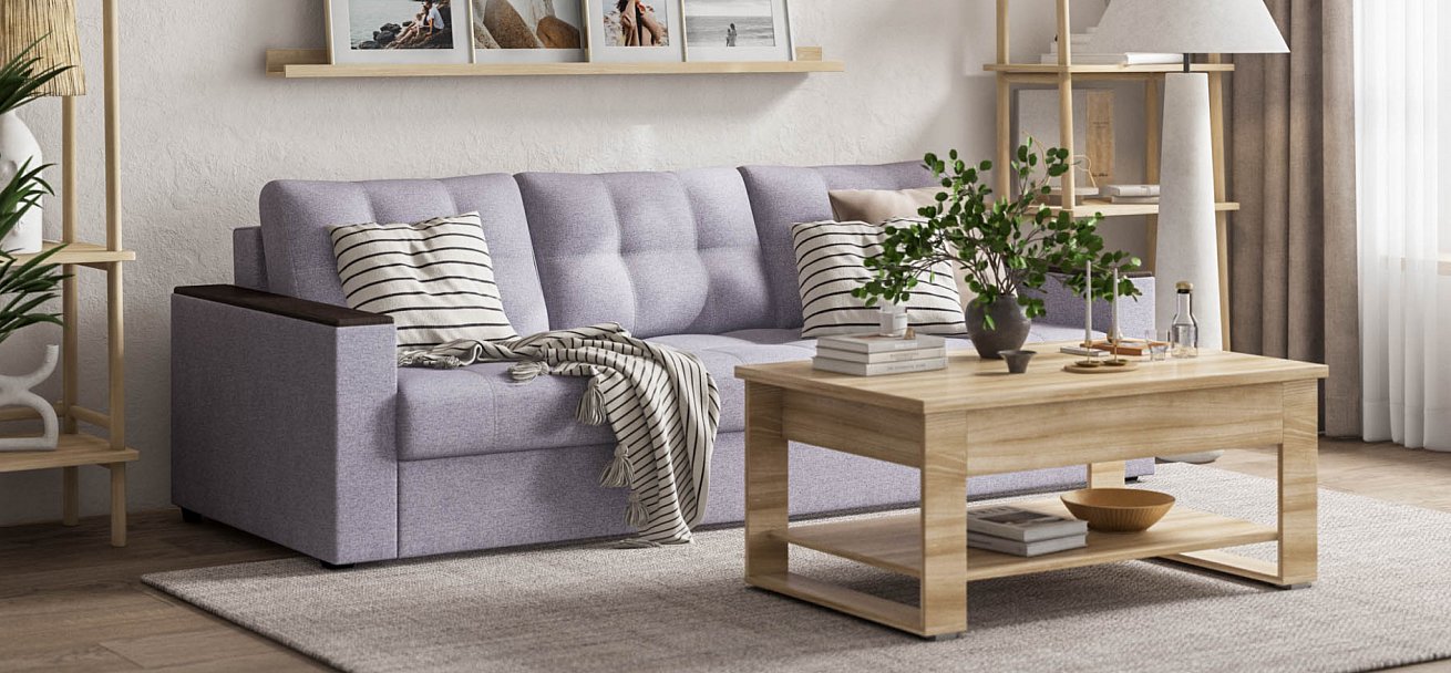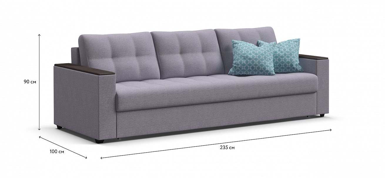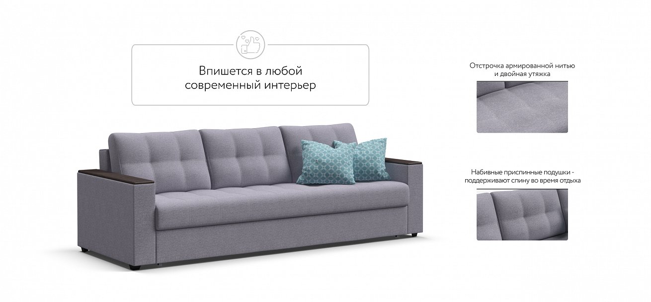 Диван имеет удобные подлокотники из МДФ, которые можно использовать в качестве столика. Элегантная прострочка на посадочной части украшает внешний вид дивана и дает возможность сохранить обивку от растяжения.