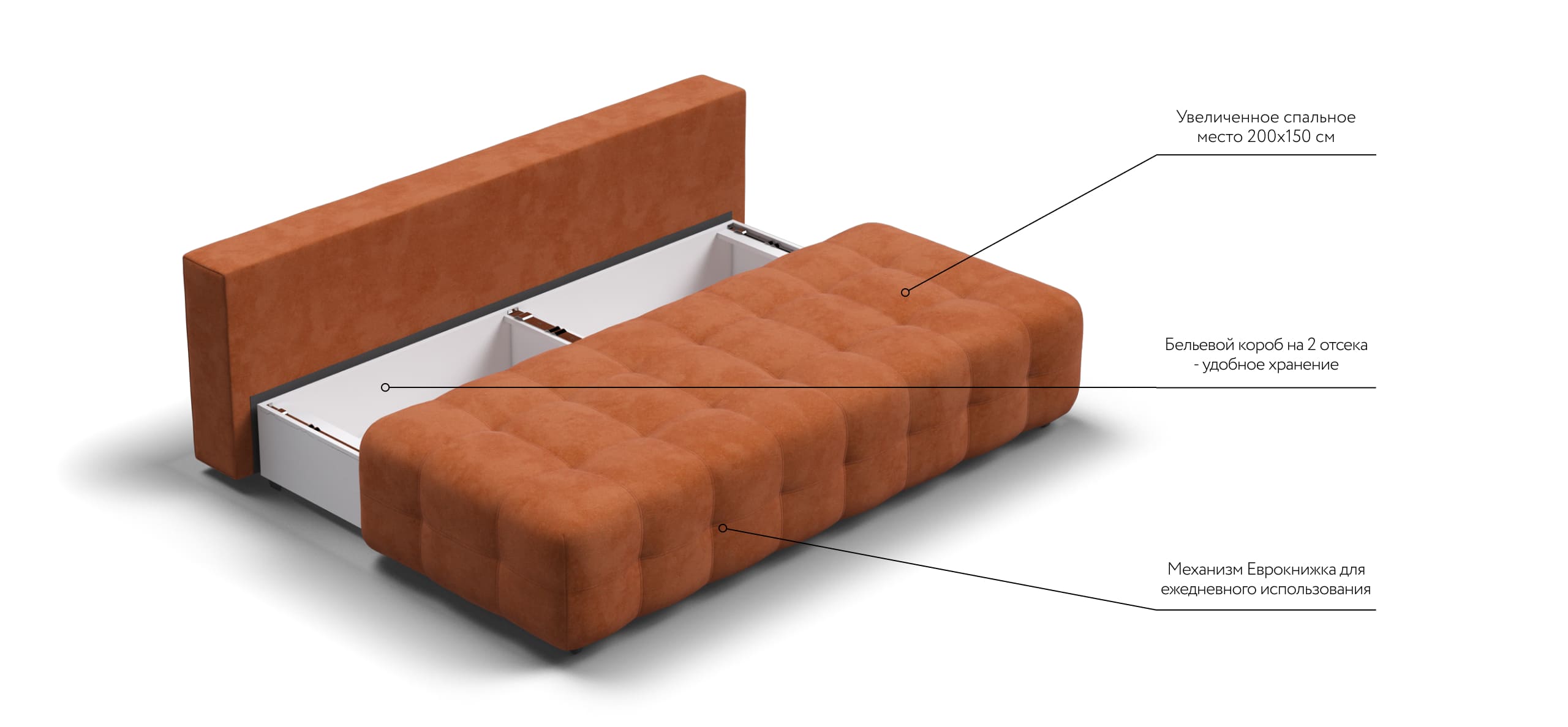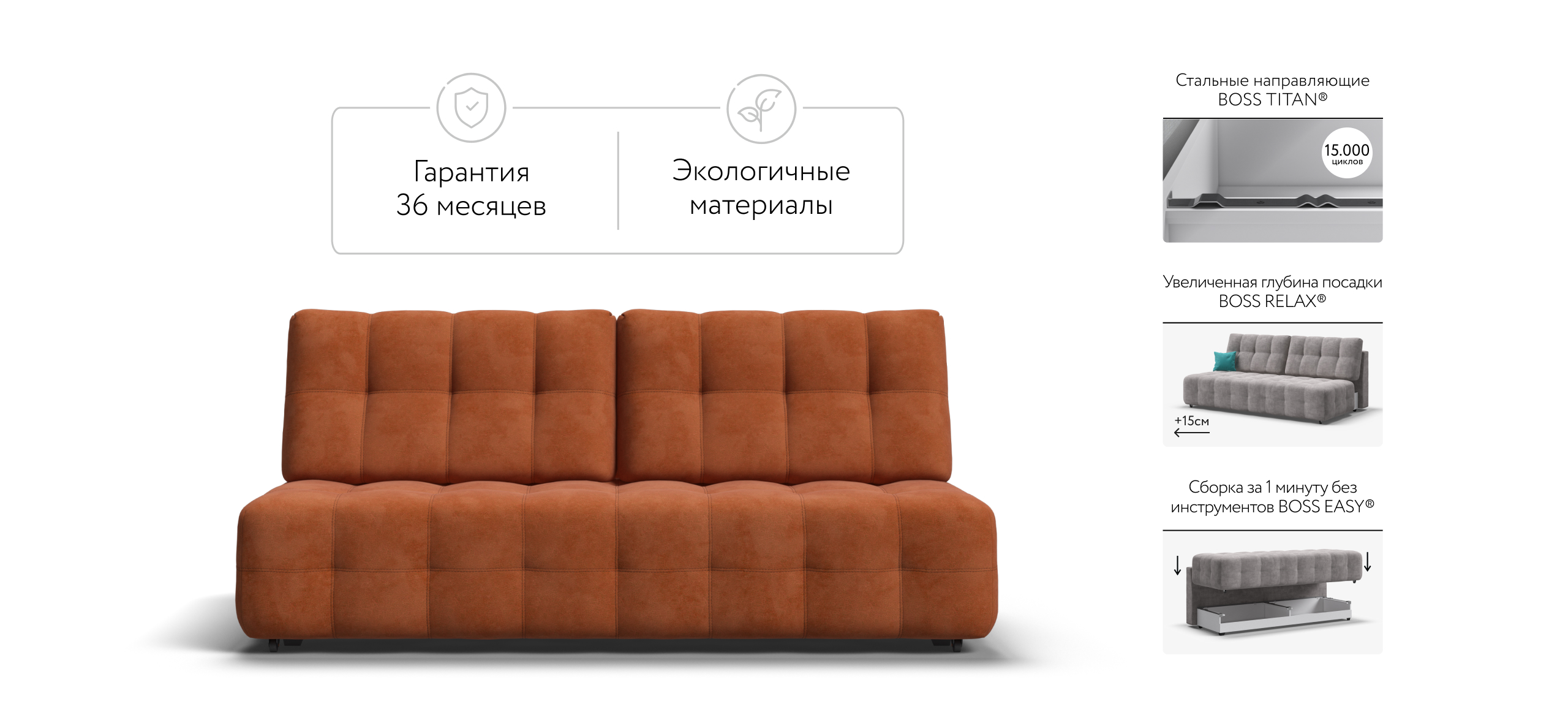 Диван BOSS MINI - отсутствие подлокотников и минималистичный дизайн. Надежный механизм трансформации благодаря стальным направляющим BOSS TITAN. 2 режима раскладки: RELAX позволяет увеличить глубину сиденья на 30% для большего комфорта, а полная раскладка обеспечивает большое и ровное спальное место. Ощутите истинный комфорт у себя дома!