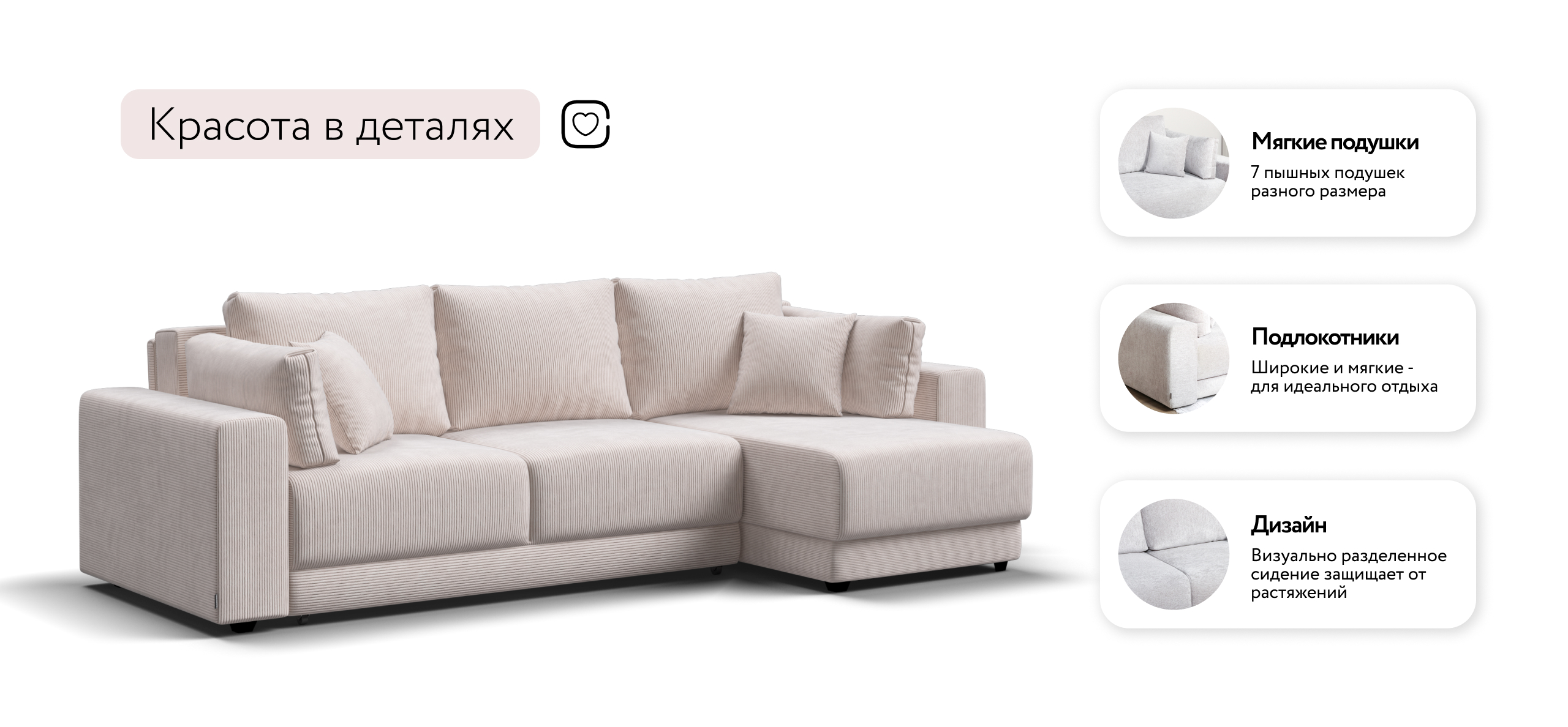 Угловой диван Босс Прайм ХЛ - это сочетание современного дизайна и продуманной эргономики, создающее уютную атмосферу в любом интерьере. Визуально разделённое сиденье, широкие мягкие подлокотники и пышные подушки разного размера обеспечивают не только эстетическую привлекательность, но и максимальный комфорт.
