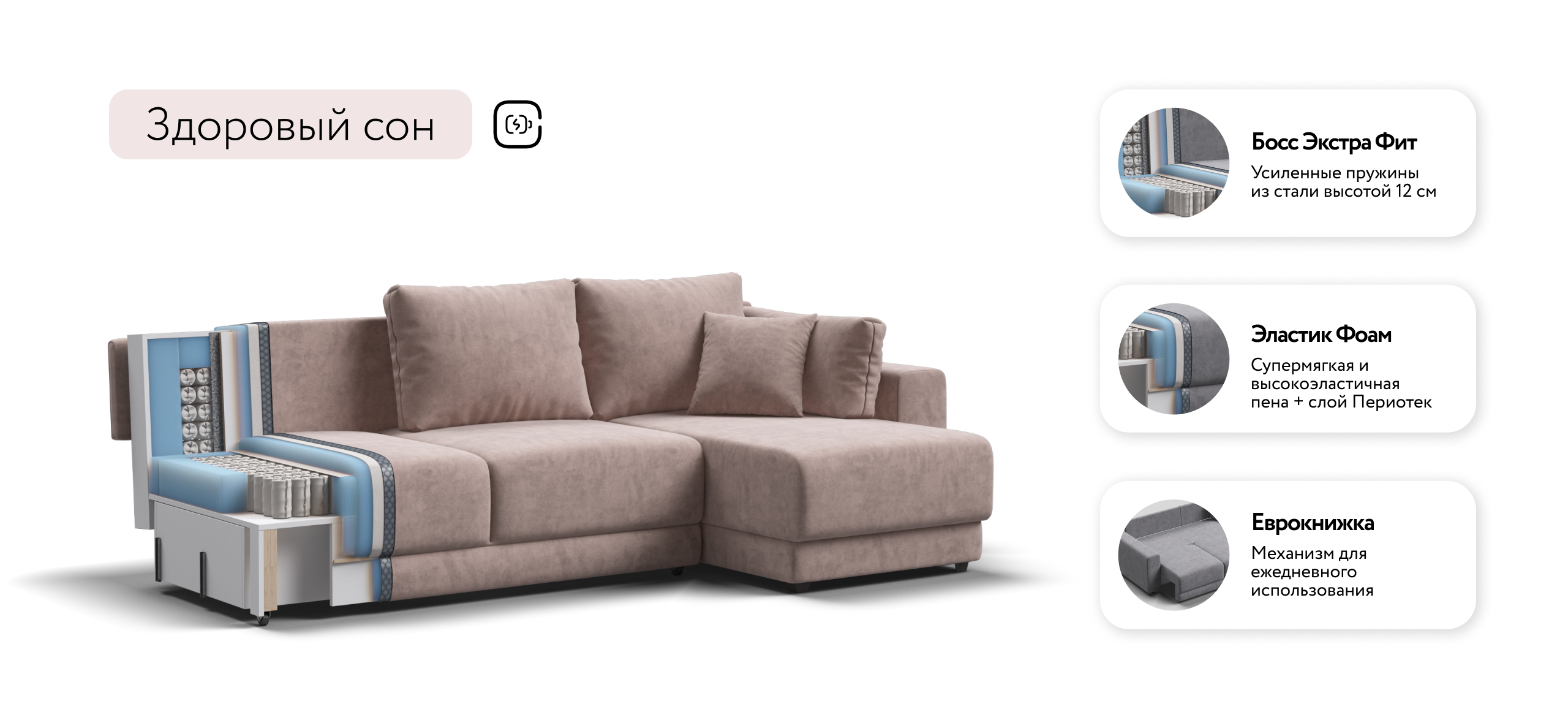Оснащённый независимым пружинным блоком и высокоэластичной пеной Эластик Фоам с дополнительным слоем периотека, диван гарантирует анатомическую поддержку и комфортный сон. Простой и надёжный механизм трансформации «еврокнижка» позволяет легко преобразовать диван в просторное спальное место.​ Универсальный угол позволит Вам переставить оттоманку и поменять положение угла при необходимости.