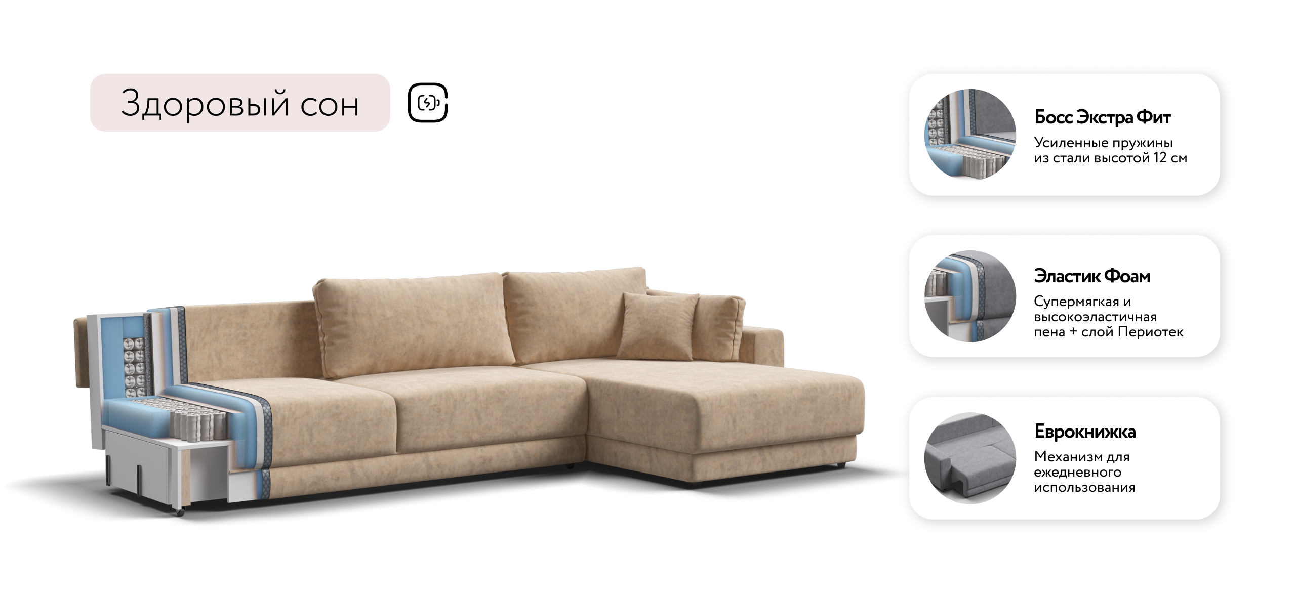 Оснащённый независимым пружинным блоком и высокоэластичной пеной Эластик Фоам с дополнительным слоем периотека, диван гарантирует анатомическую поддержку и комфортный сон. Простой и надёжный механизм трансформации «еврокнижка» позволяет легко преобразовать диван в просторное спальное место.​ Универсальный угол позволит Вам переставить оттоманку и поменять положение угла при необходимости.