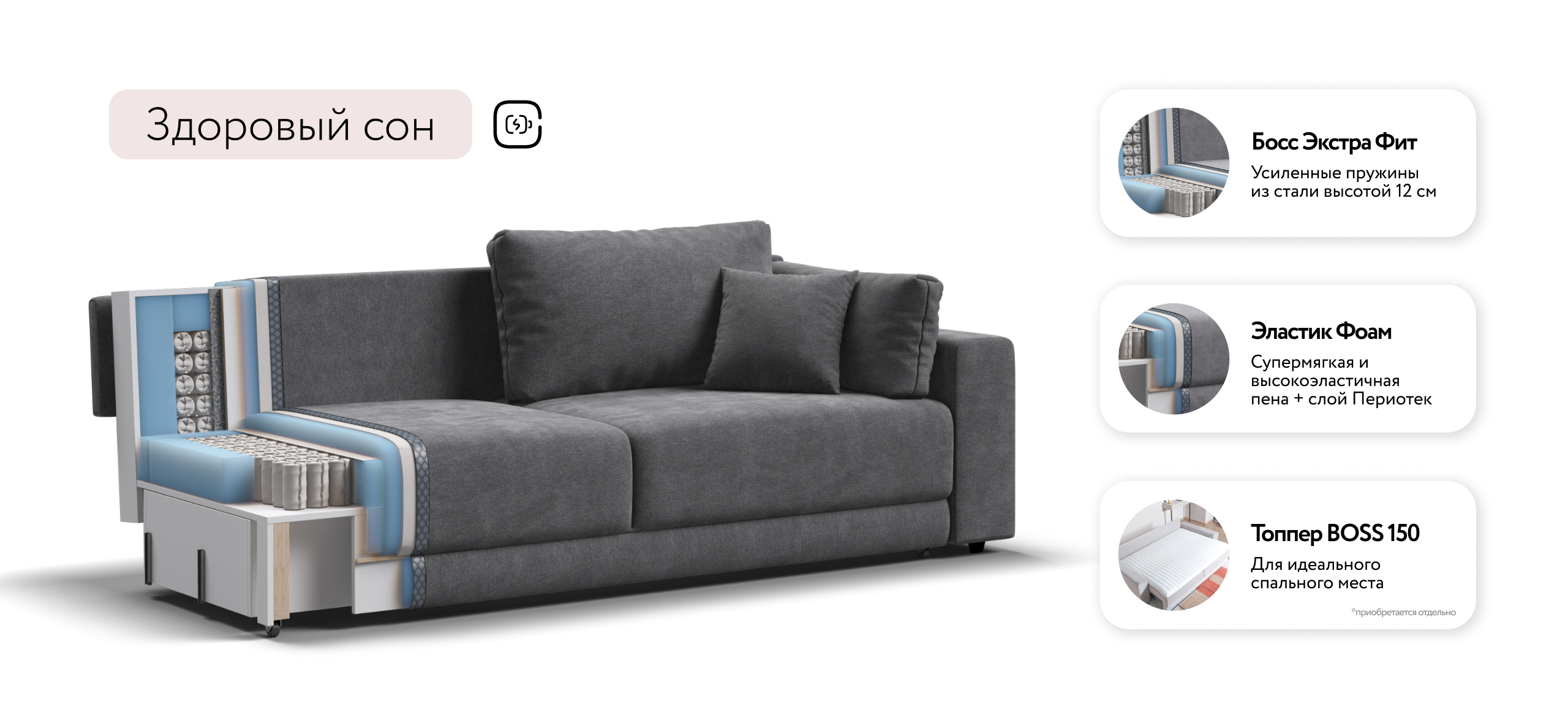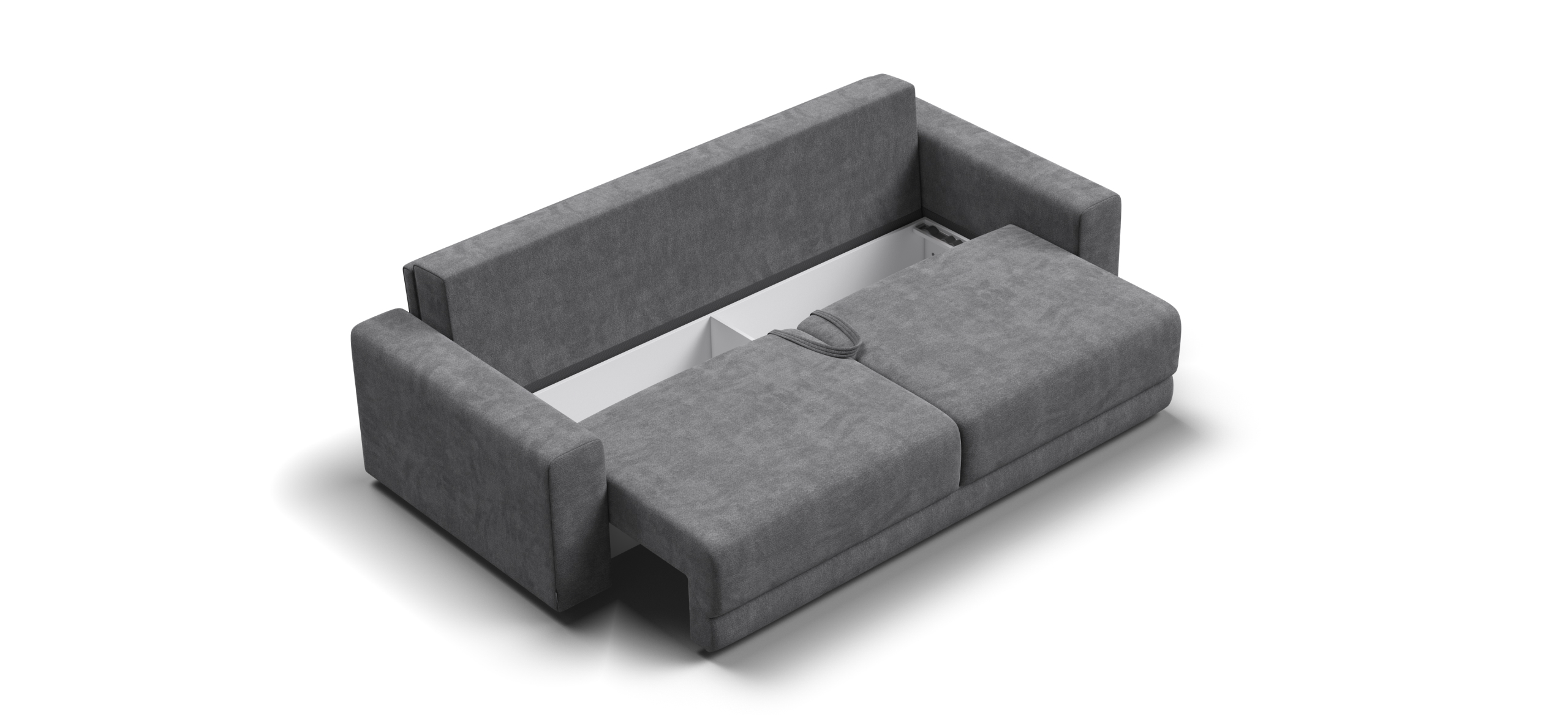 Оснащённый независимым пружинным блоком и высокоэластичной пеной Эластик Фоам с дополнительным слоем периотека, диван гарантирует анатомическую поддержку и комфортный сон. Простой и надёжный механизм трансформации «еврокнижка» позволяет легко преобразовать диван в просторное спальное место.