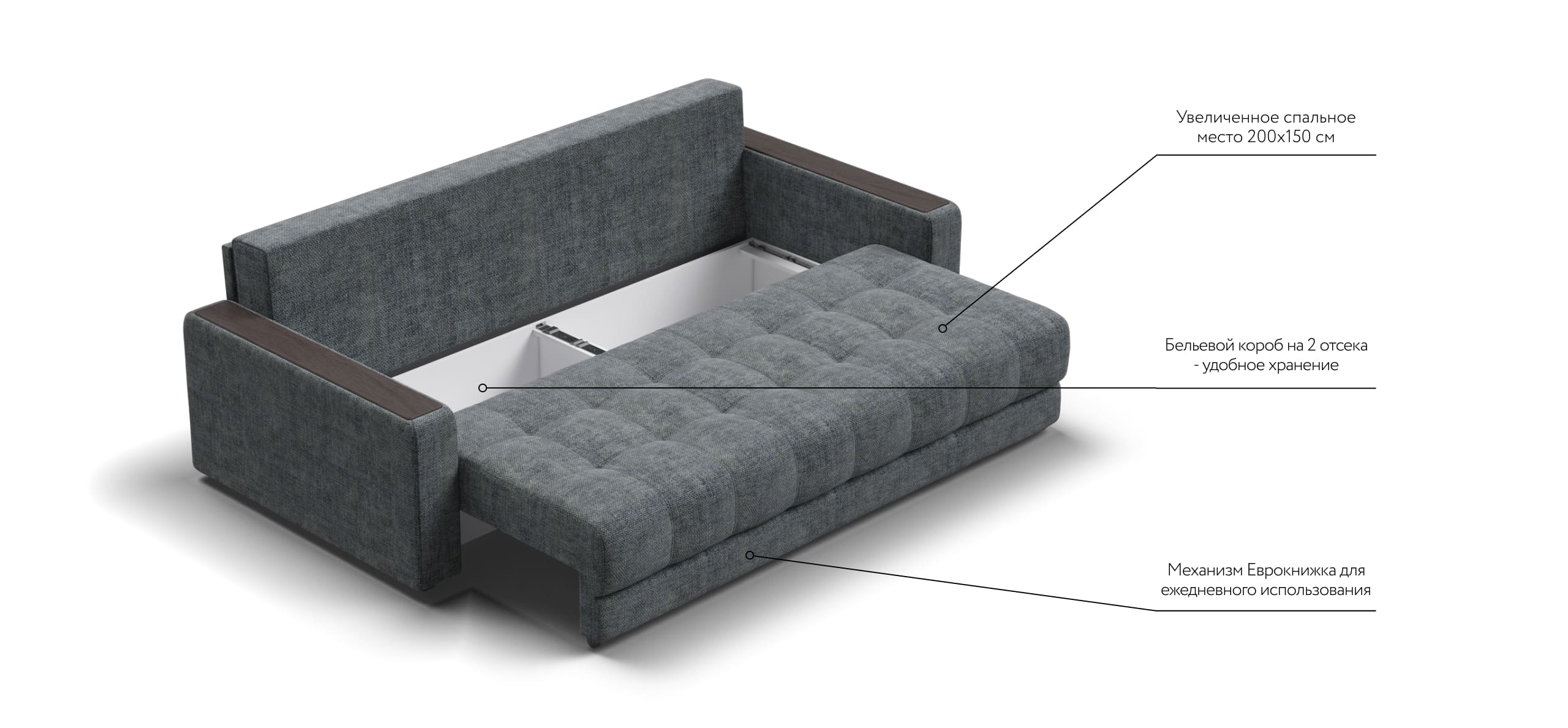 Легкая трансформация в три положения создаст для Вас максимально комфортный отдых, а улучшенное анатомическое основание в диване обеспечит Вам здоровый сон. Спинка защищает от соприкосновения со стеной во время сна.