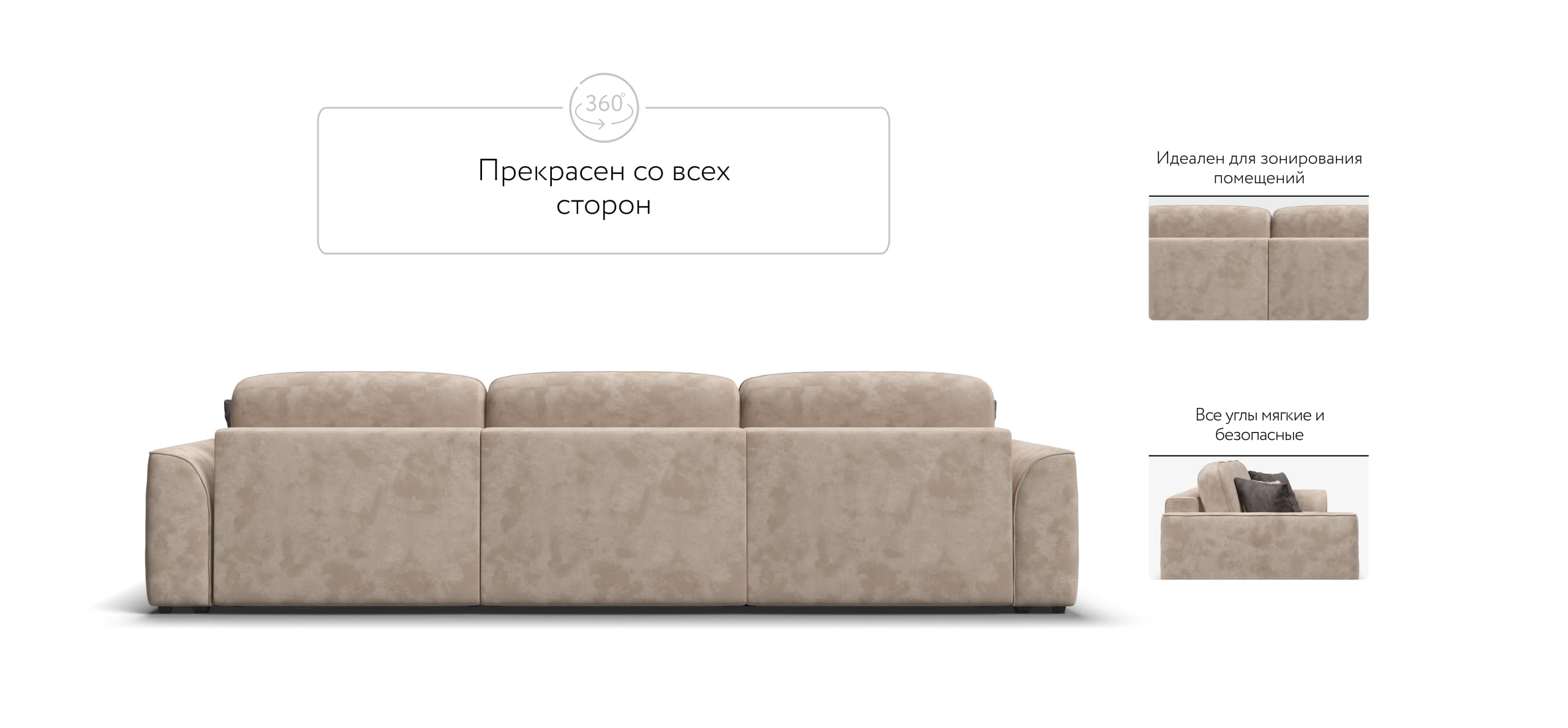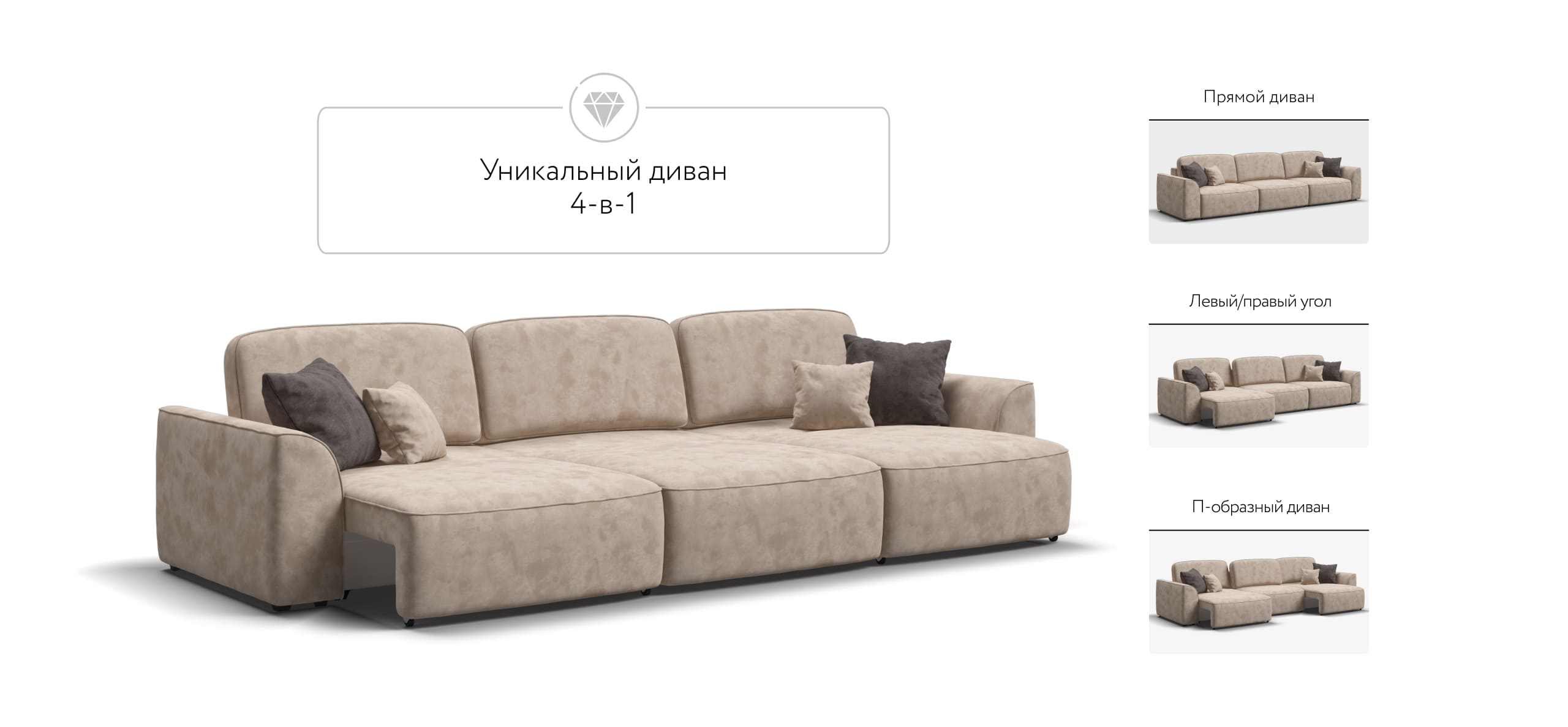 Приглашайте в гости большую компанию - диван вместит всех! Каждое посадочное место можно выдвинуть вперед и получить диван с правым или левым углом, а также получить П-образную форму дивана. А в разложенном виде диван превращается в огромное спальное место.