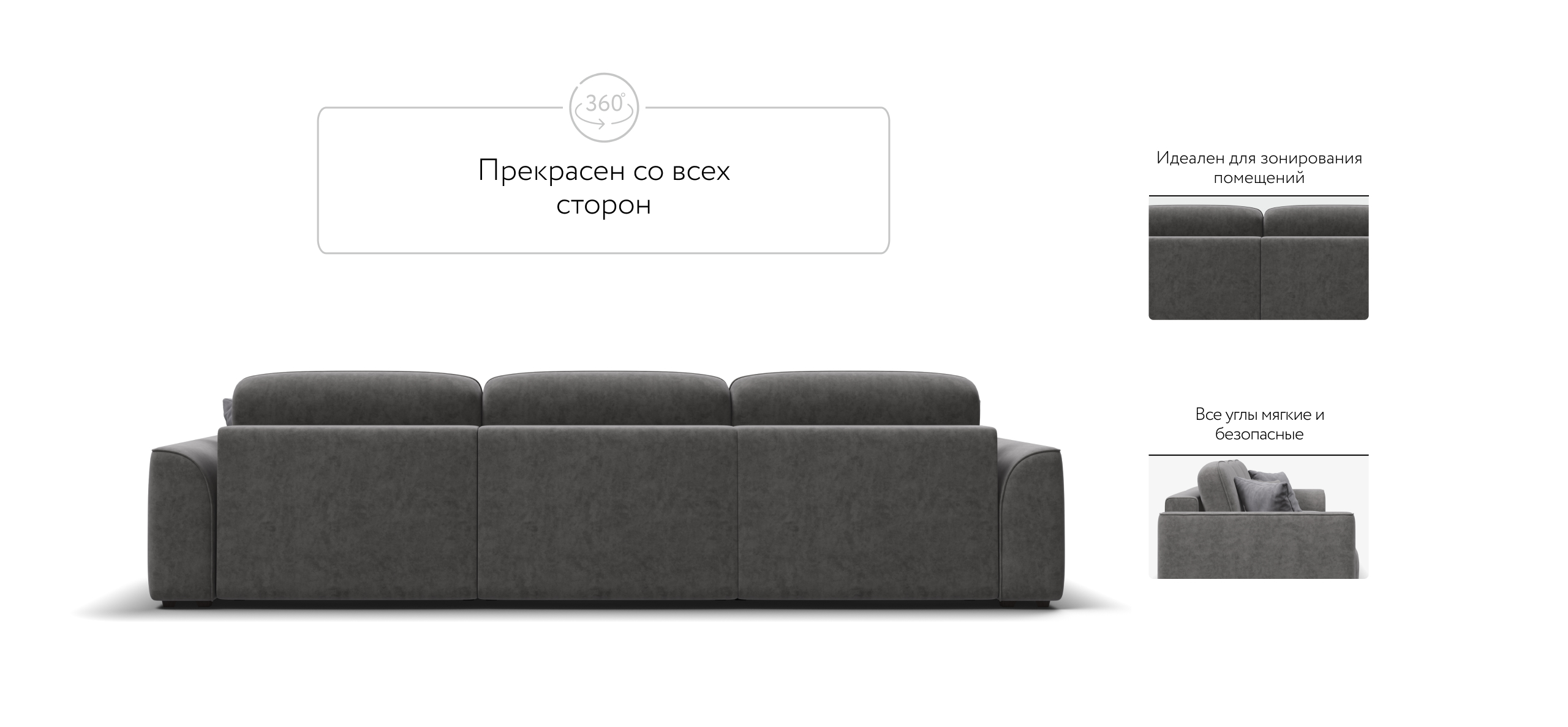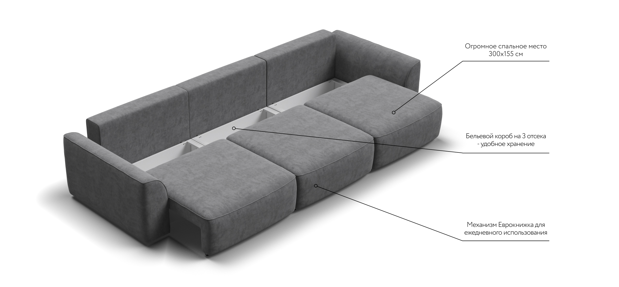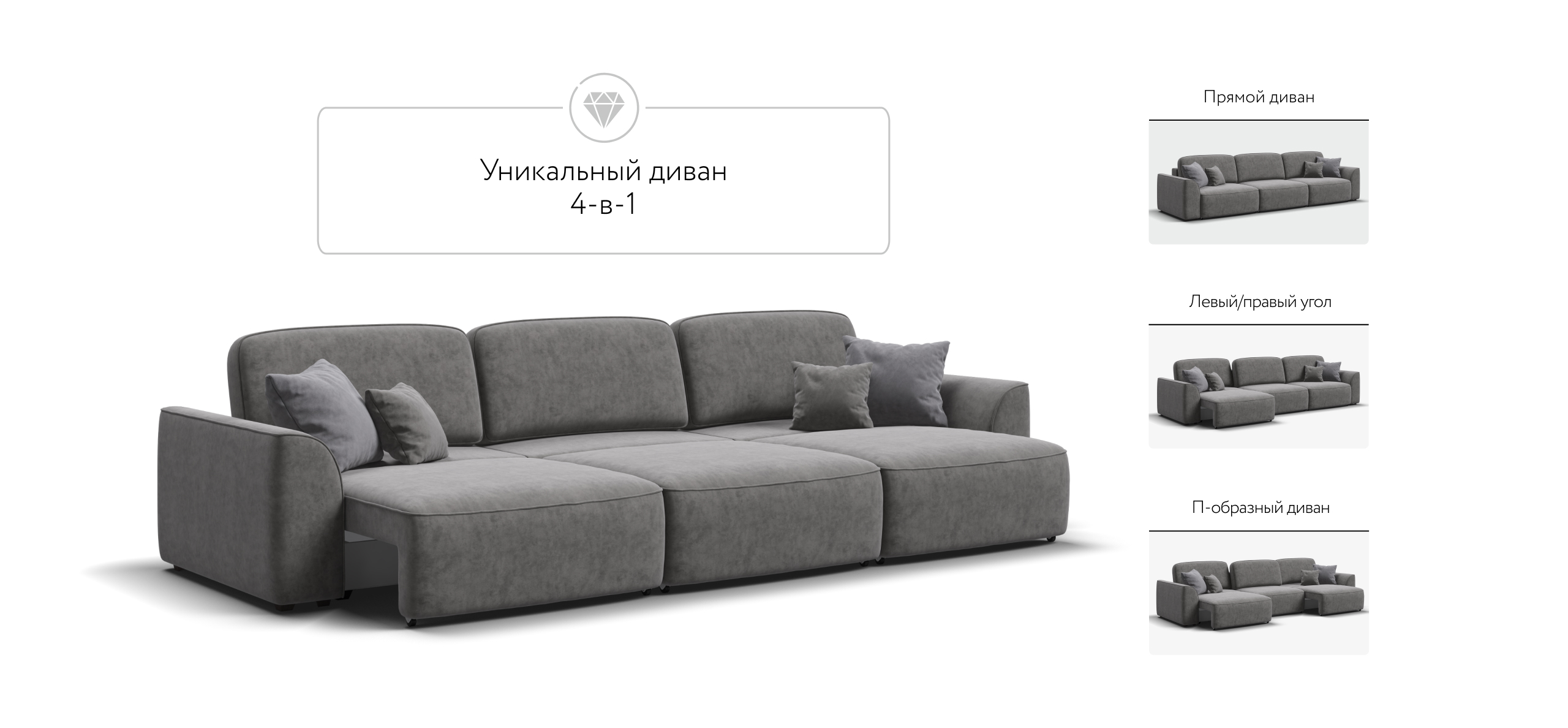 Приглашайте в гости большую компанию - диван вместит всех! Каждое посадочное место можно выдвинуть вперед и получить диван с правым или левым углом, а также получить П-образную форму дивана. А в разложенном виде диван превращается в огромное спальное место.