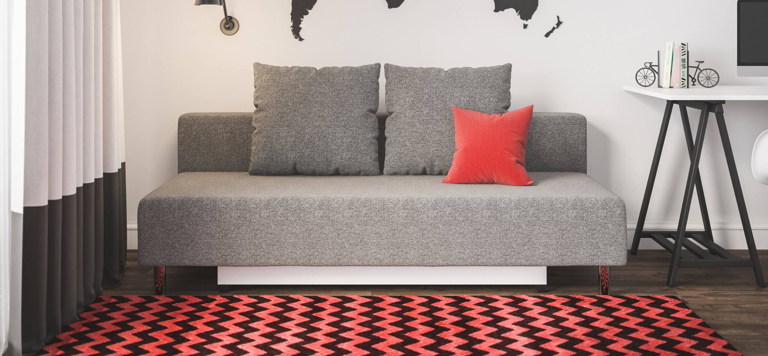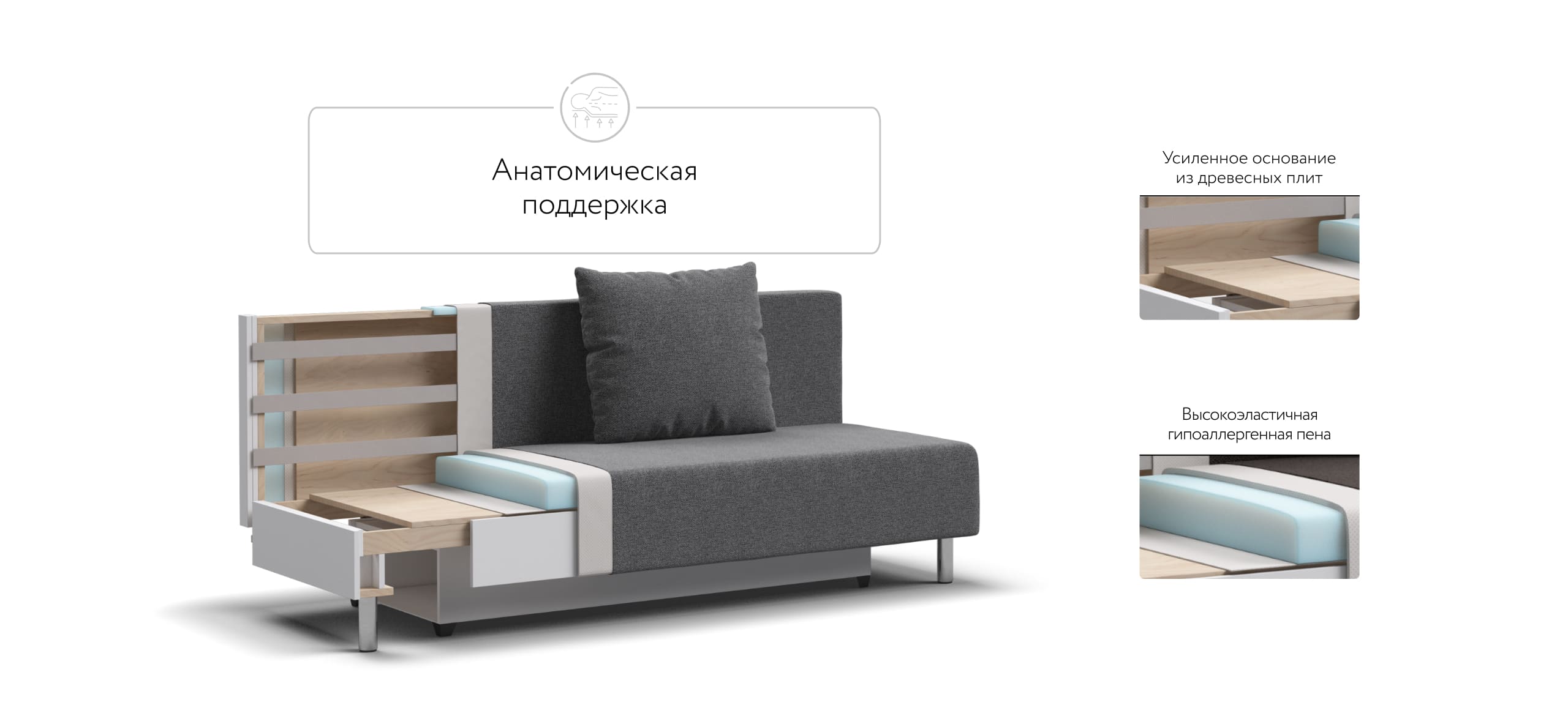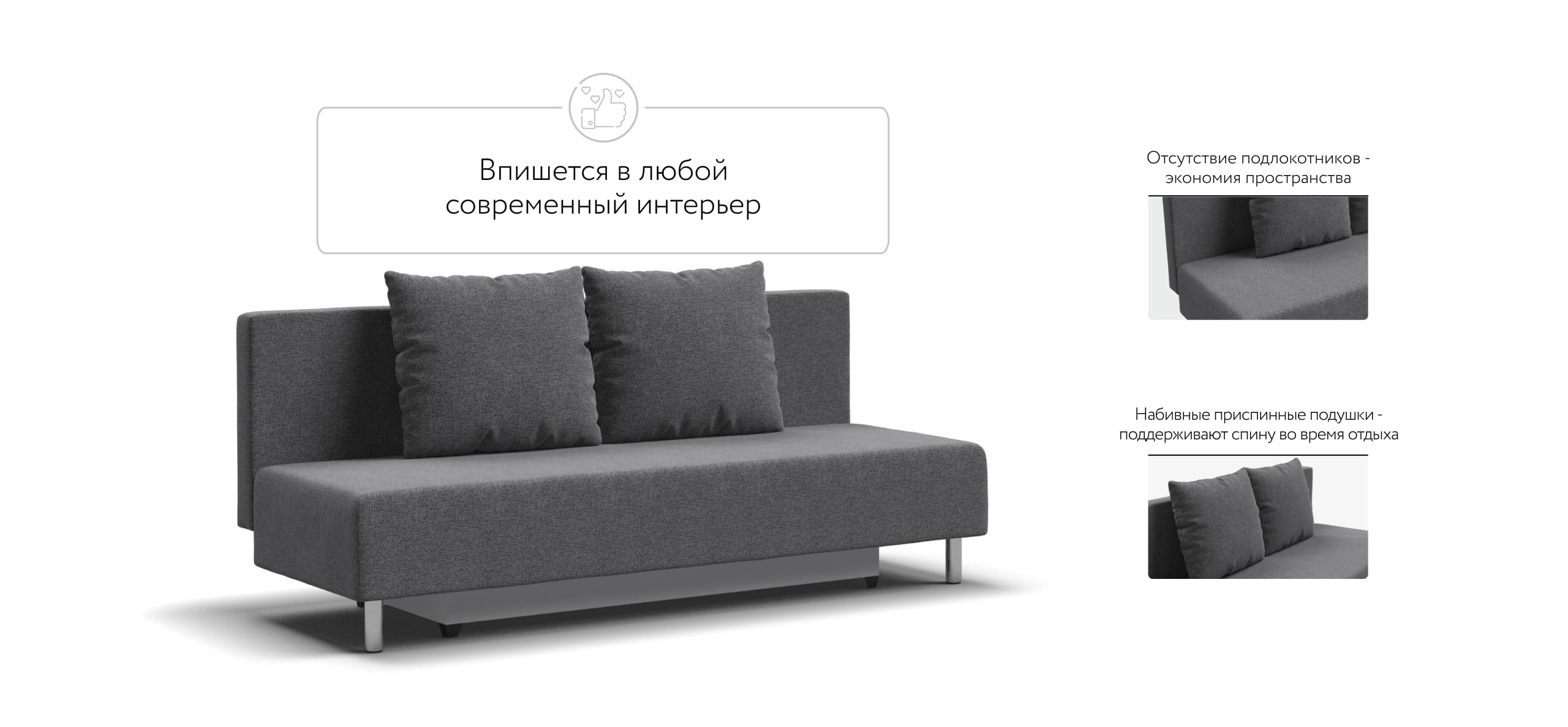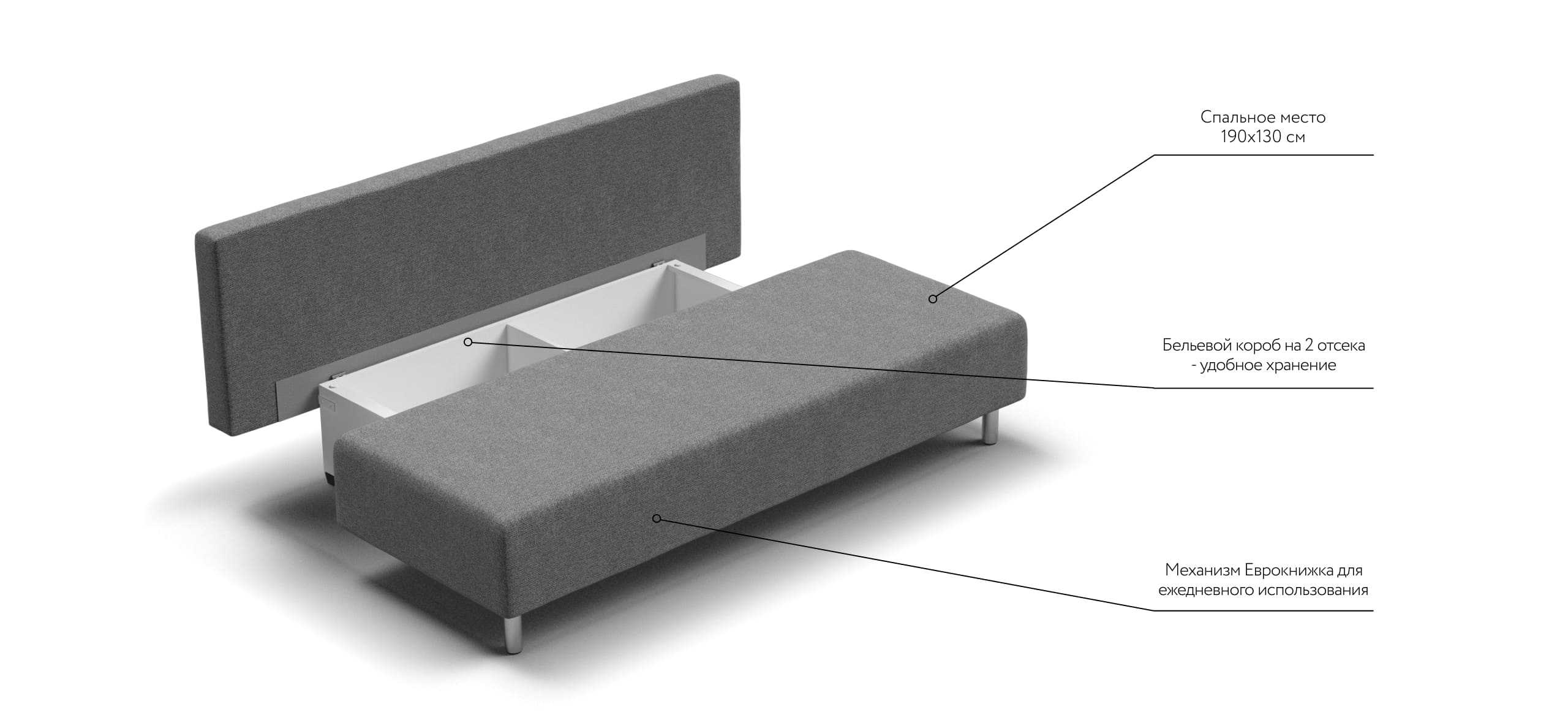 Надежный механизм еврокнижка и опоры на роликах сделают легким ежедневное использование дивана в качестве спального места и обезопасят от повреждения напольное покрытие. В основании дивана находятся два вместительных бельевых ящика.