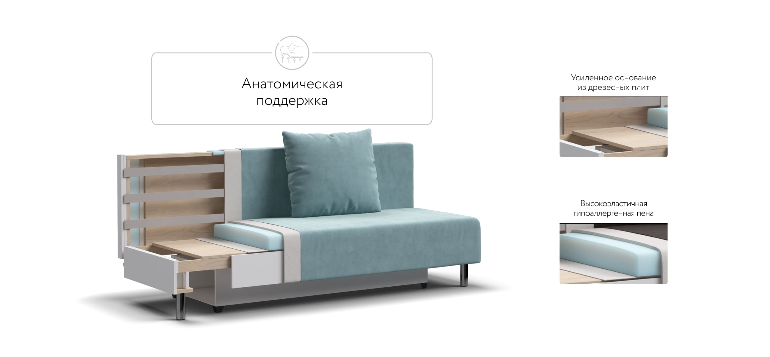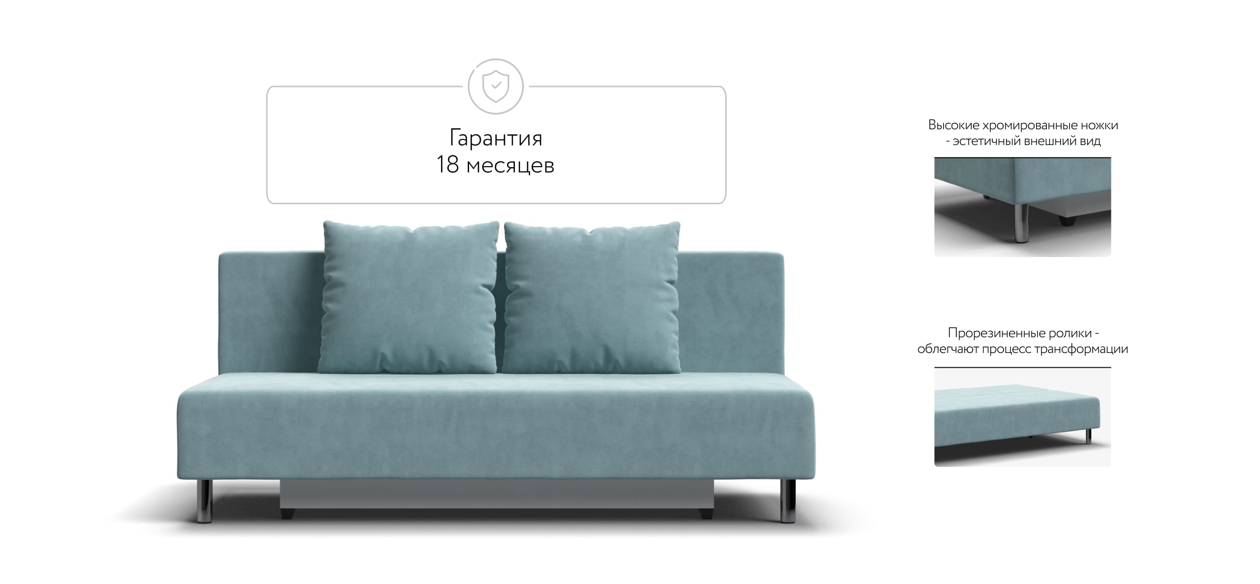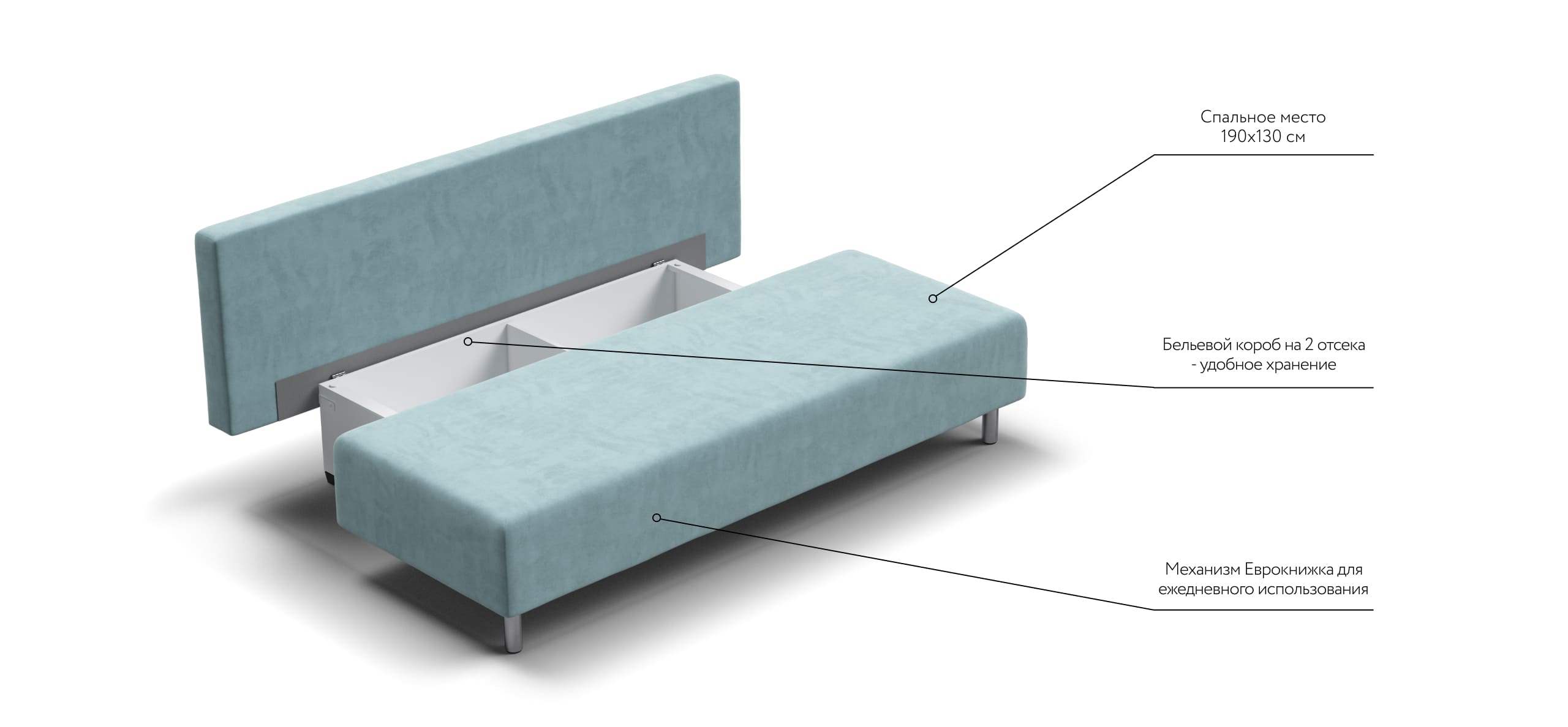 Надежный механизм еврокнижка и опоры на роликах сделают легким ежедневное использование дивана в качестве спального места и обезопасят от повреждения напольное покрытие. В основании дивана находятся два вместительных бельевых ящика.