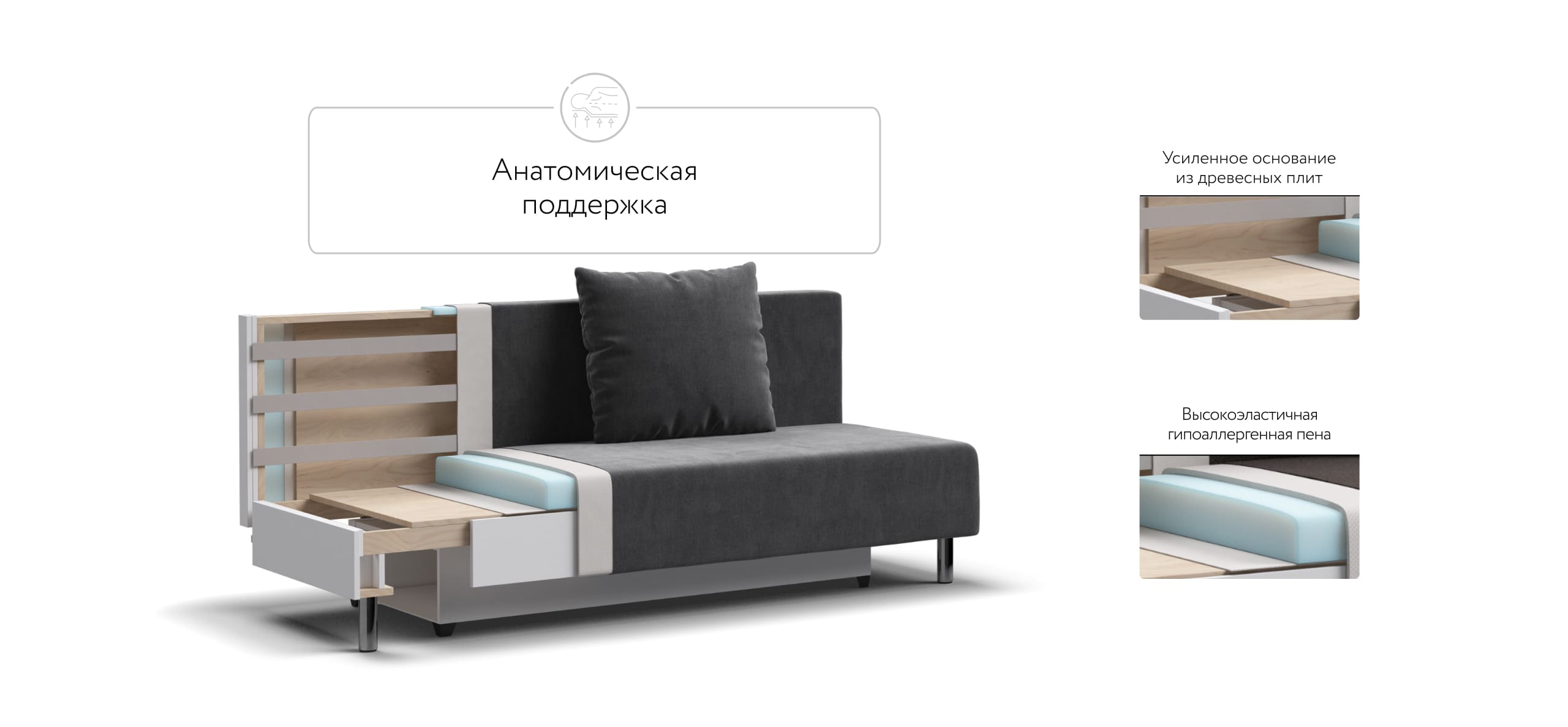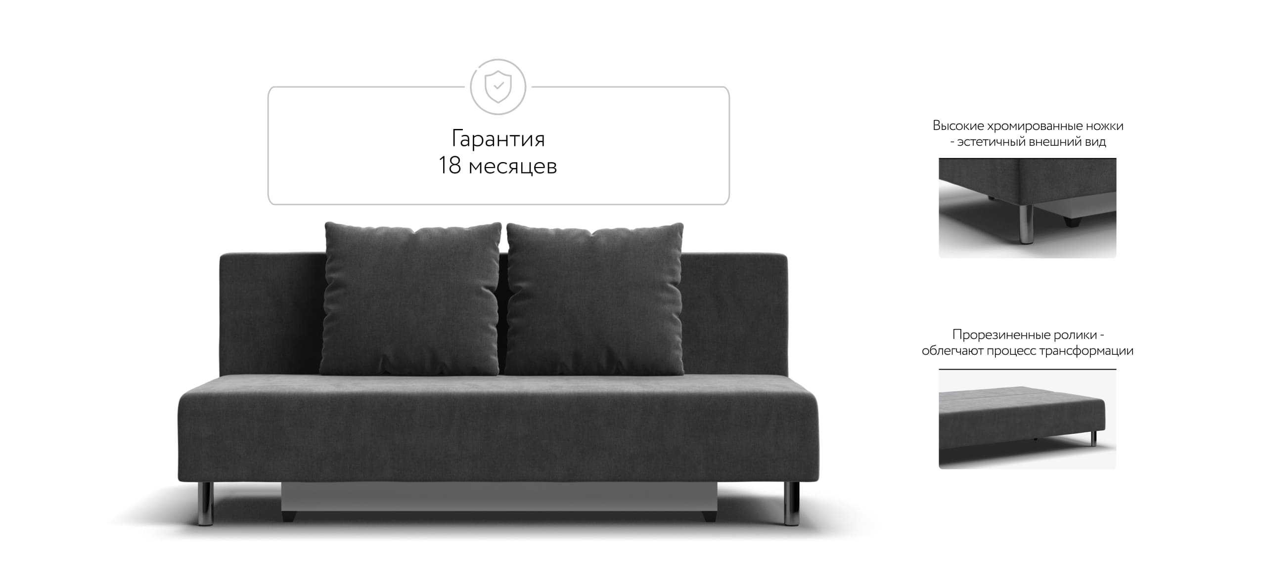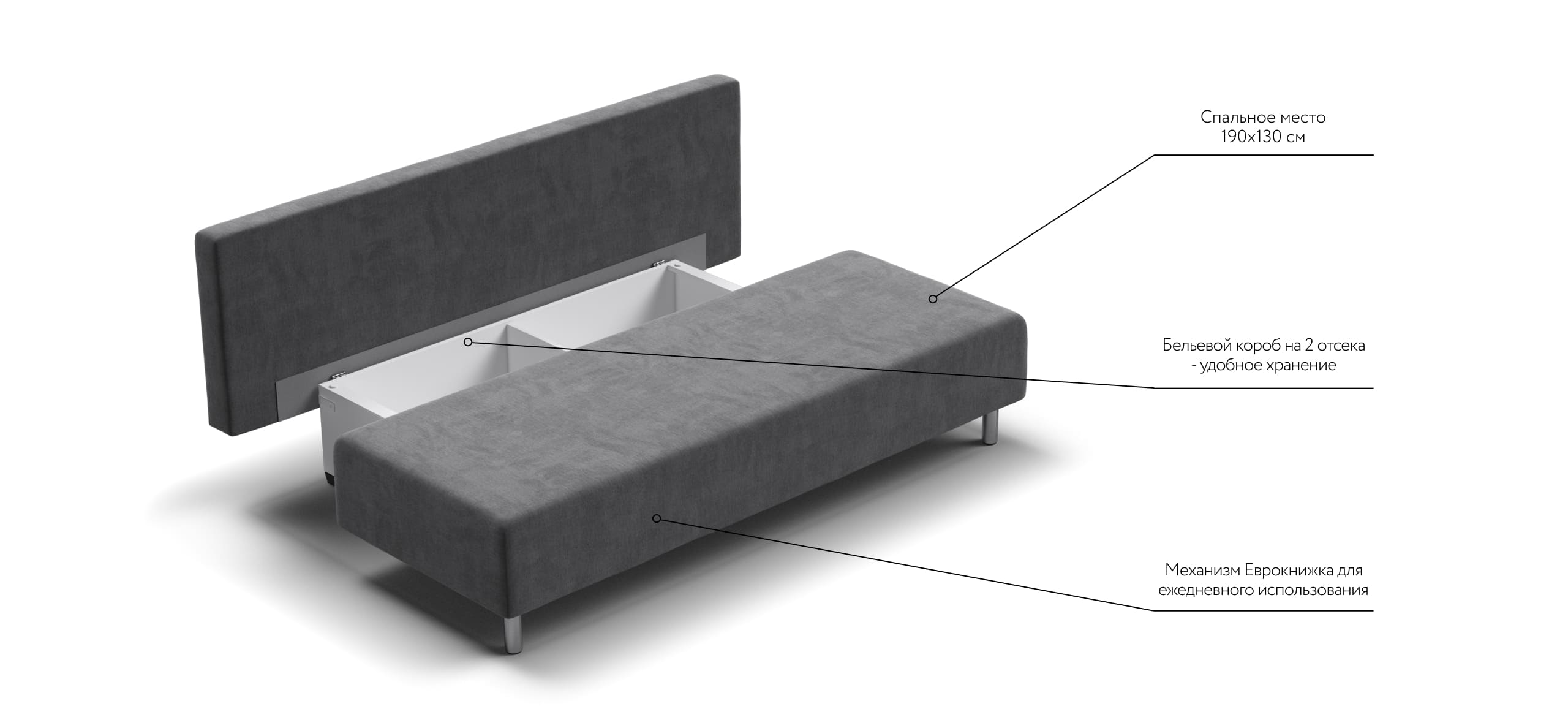 Надежный механизм еврокнижка и опоры на роликах сделают легким ежедневное использование дивана в качестве спального места и обезопасят от повреждения напольное покрытие. В основании дивана находятся два вместительных бельевых ящика.