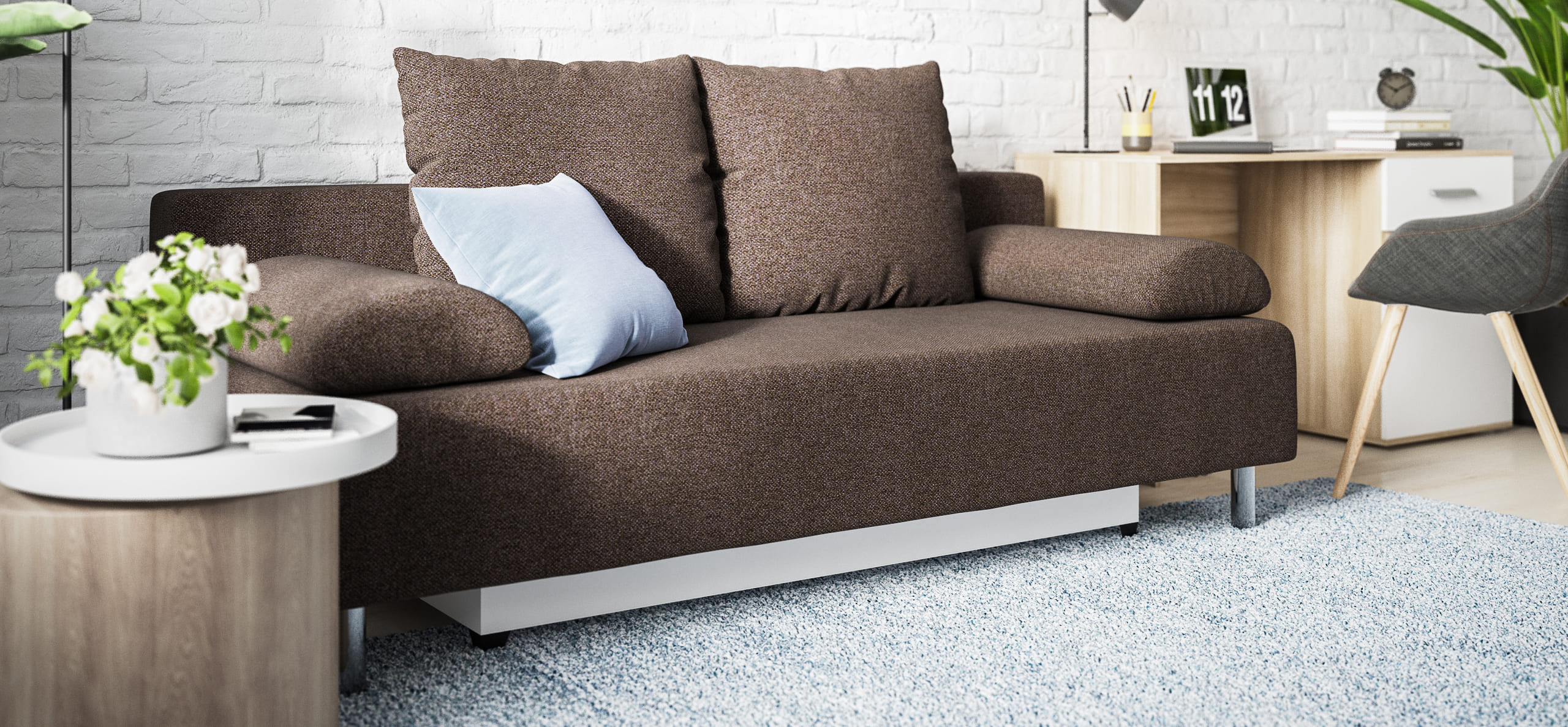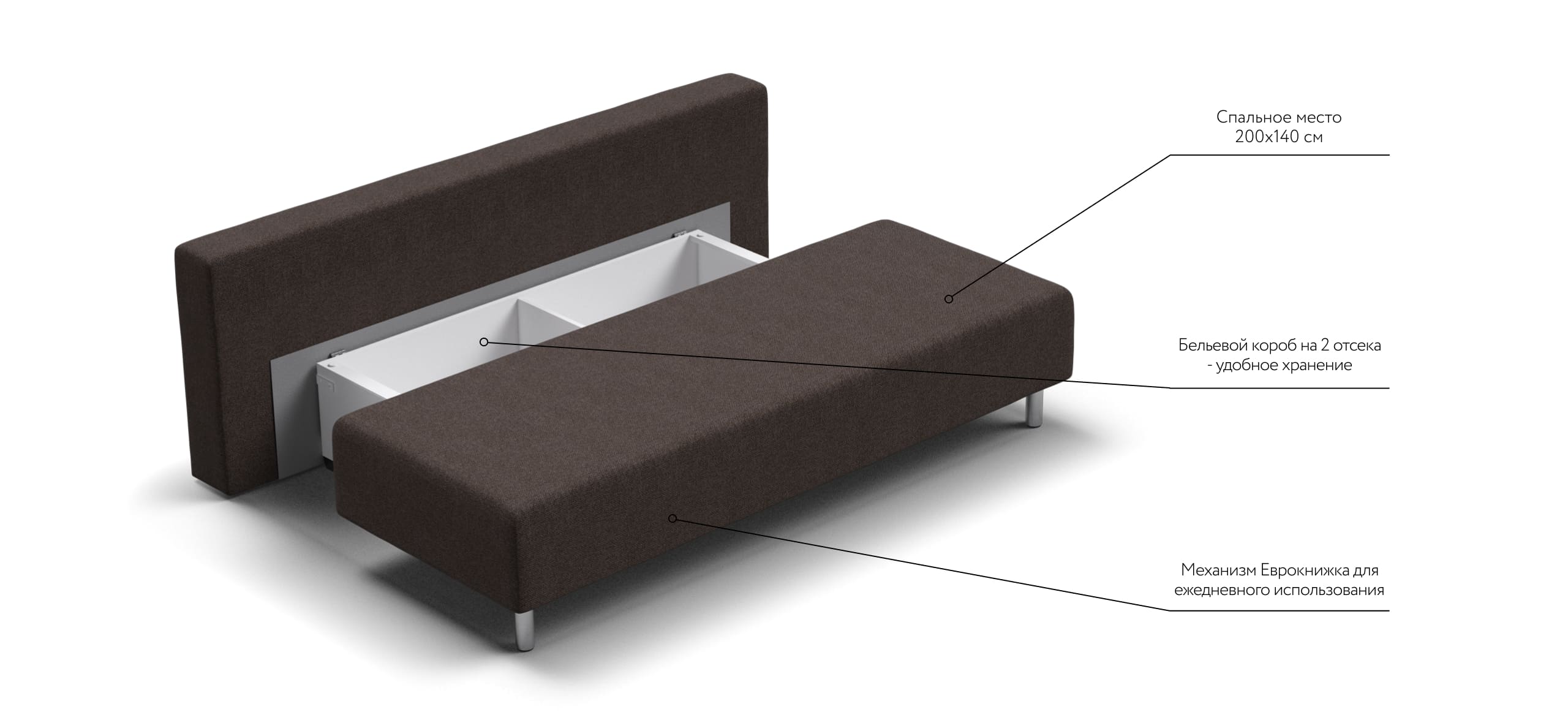 Надежный механизм еврокнижка и опоры на роликах сделают легким ежедневное использование дивана в качестве спального места и обезопасят от повреждения напольное покрытие. В основании дивана находятся два вместительных бельевых ящика.