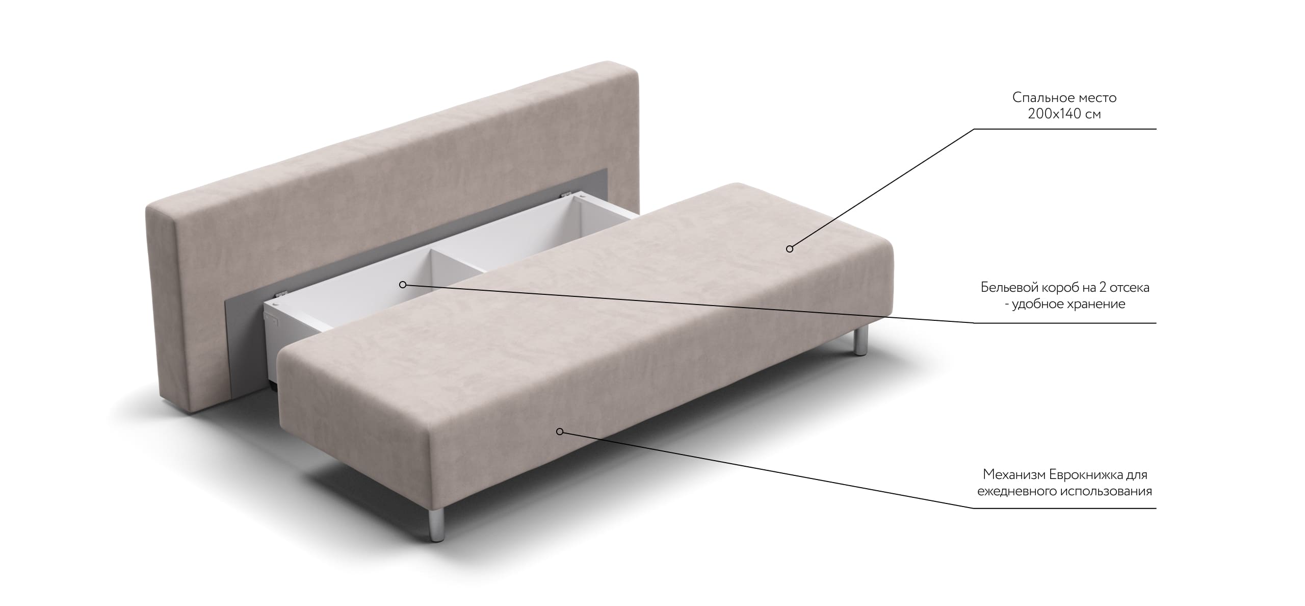 Надежный механизм еврокнижка и опоры на роликах сделают легким ежедневное использование дивана в качестве спального места и обезопасят от повреждения напольное покрытие. В основании дивана находятся два вместительных бельевых ящика.