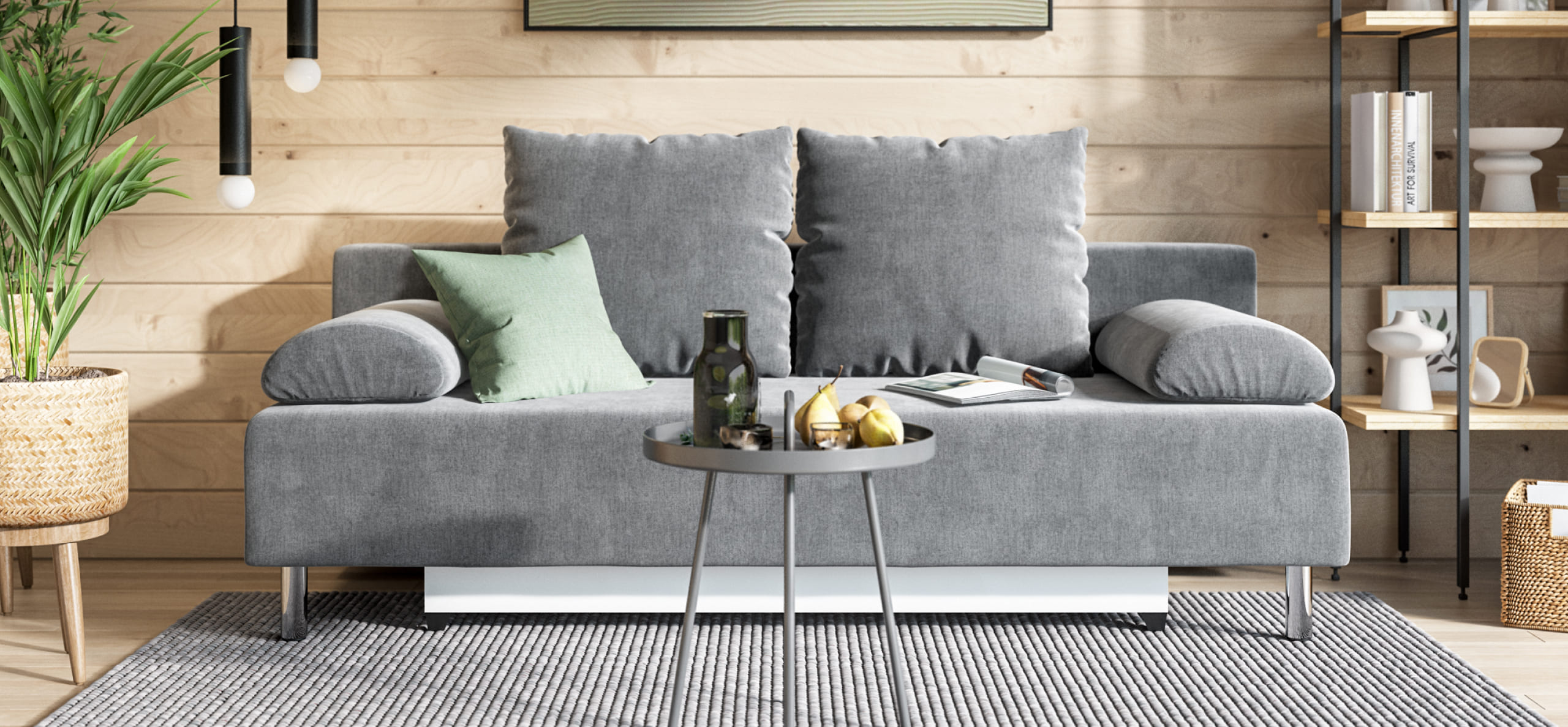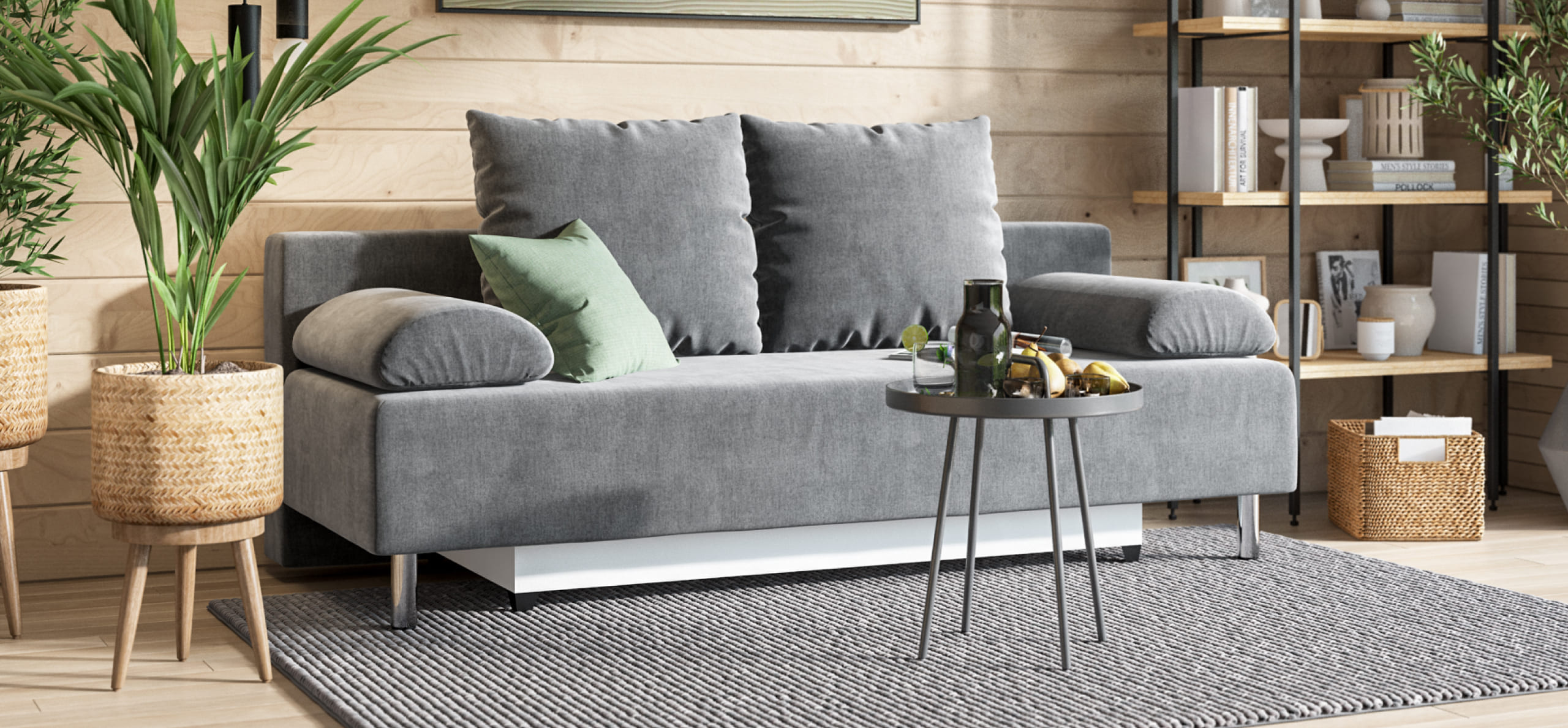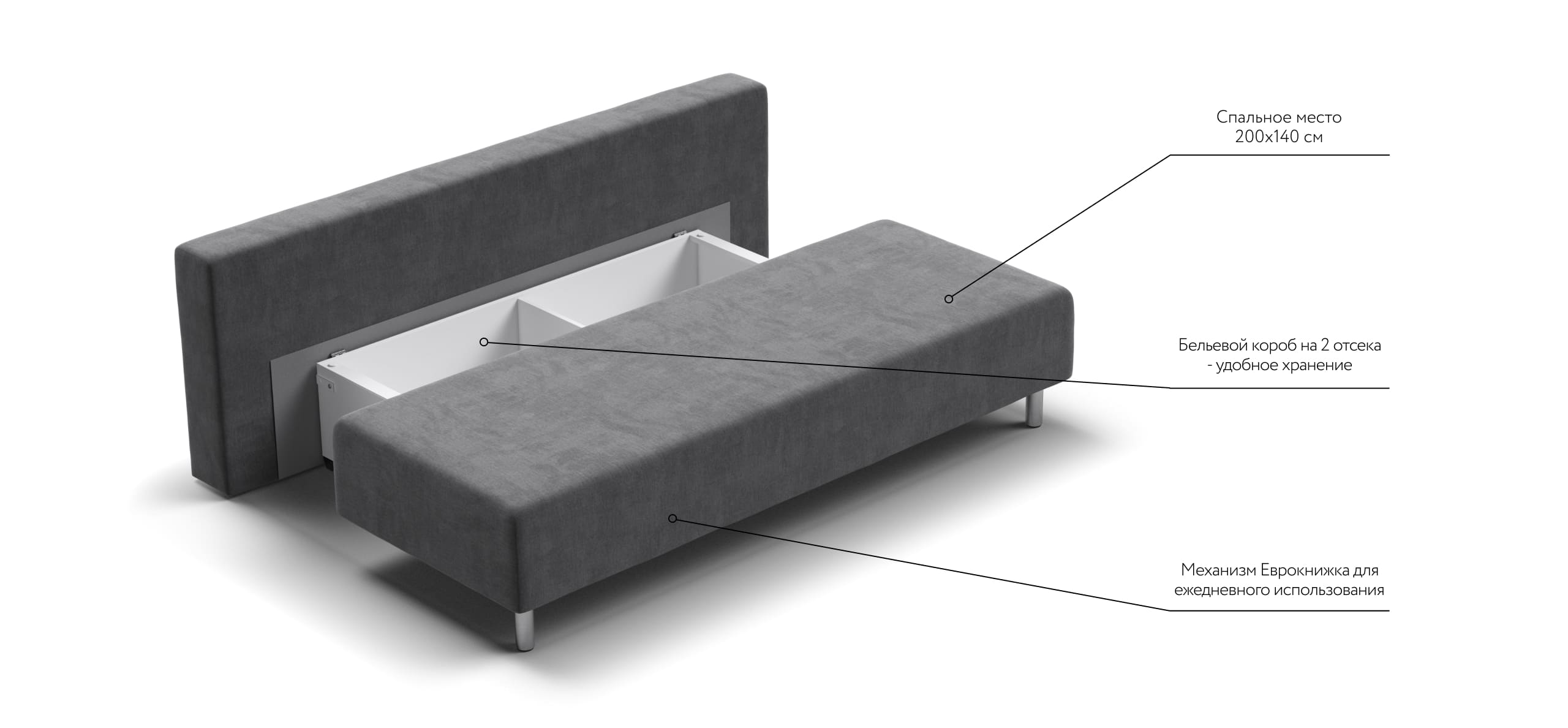 Надежный механизм еврокнижка и опоры на роликах сделают легким ежедневное использование дивана в качестве спального места и обезопасят от повреждения напольное покрытие. В основании дивана находятся два вместительных бельевых ящика.
