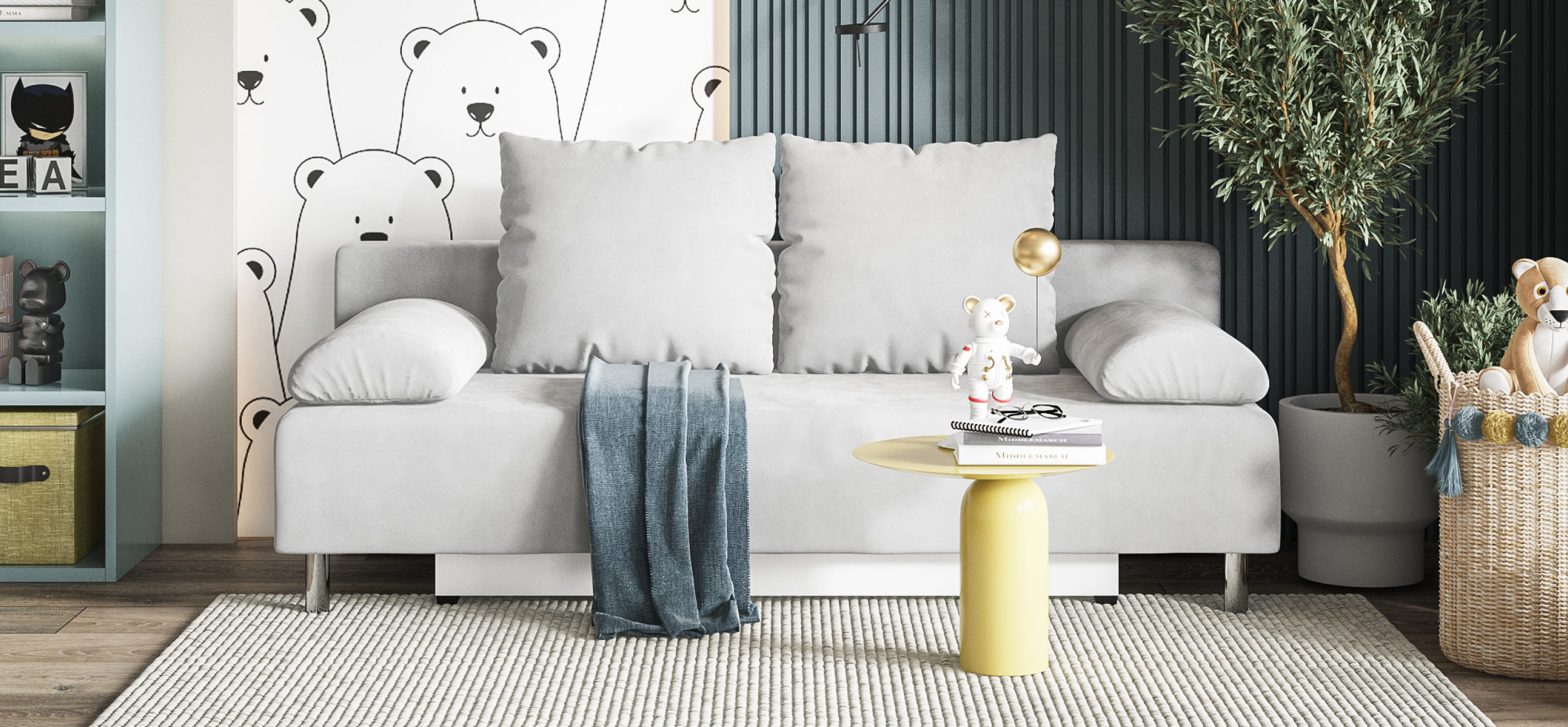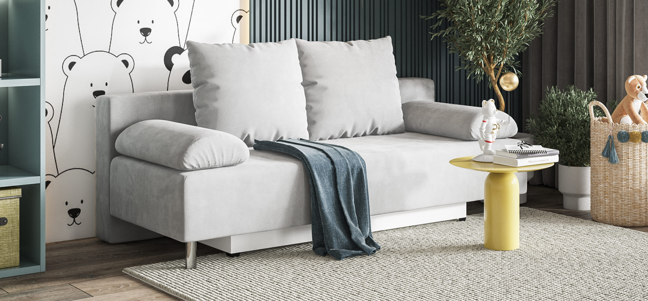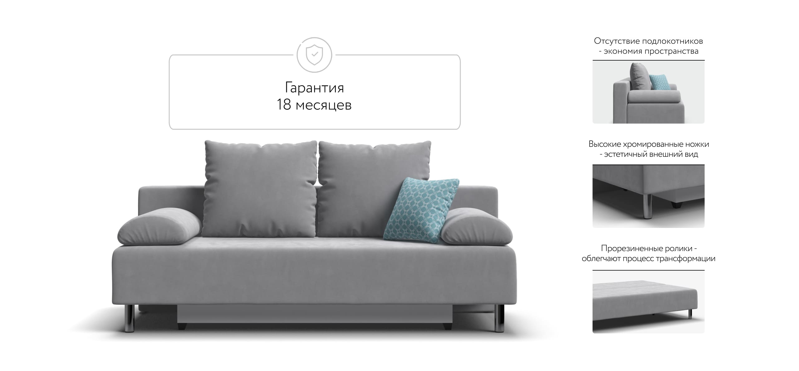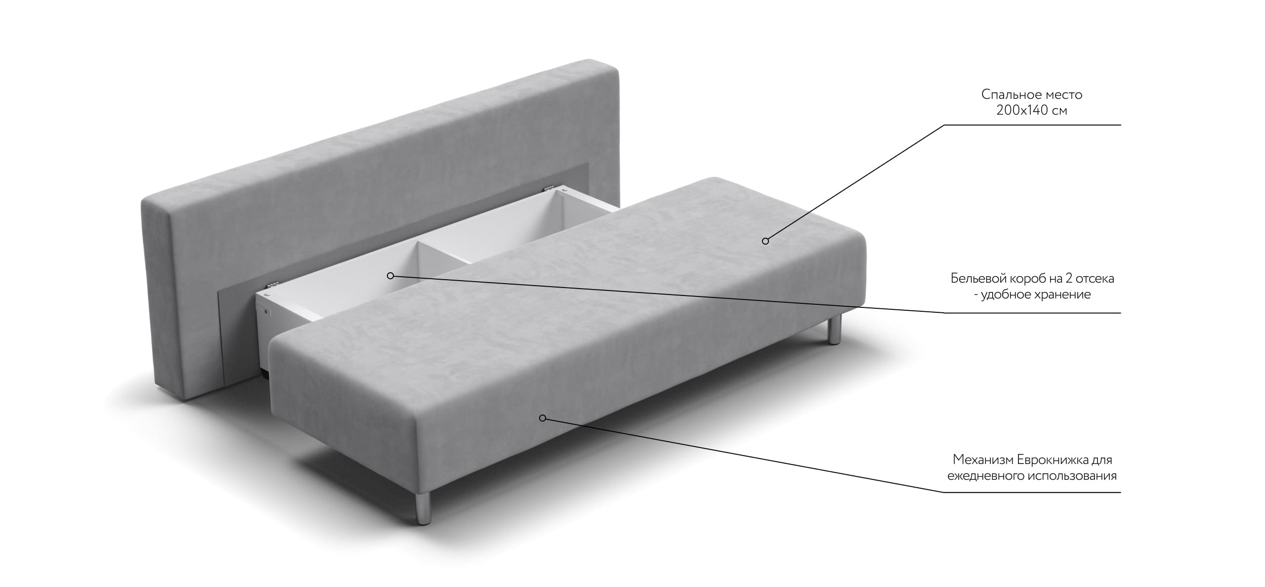 Надежный механизм еврокнижка и опоры на роликах сделают легким ежедневное использование дивана в качестве спального места и обезопасят от повреждения напольное покрытие. В основании дивана находятся два вместительных бельевых ящика.