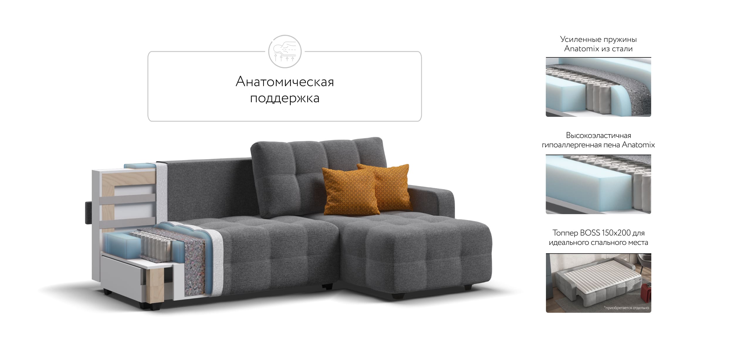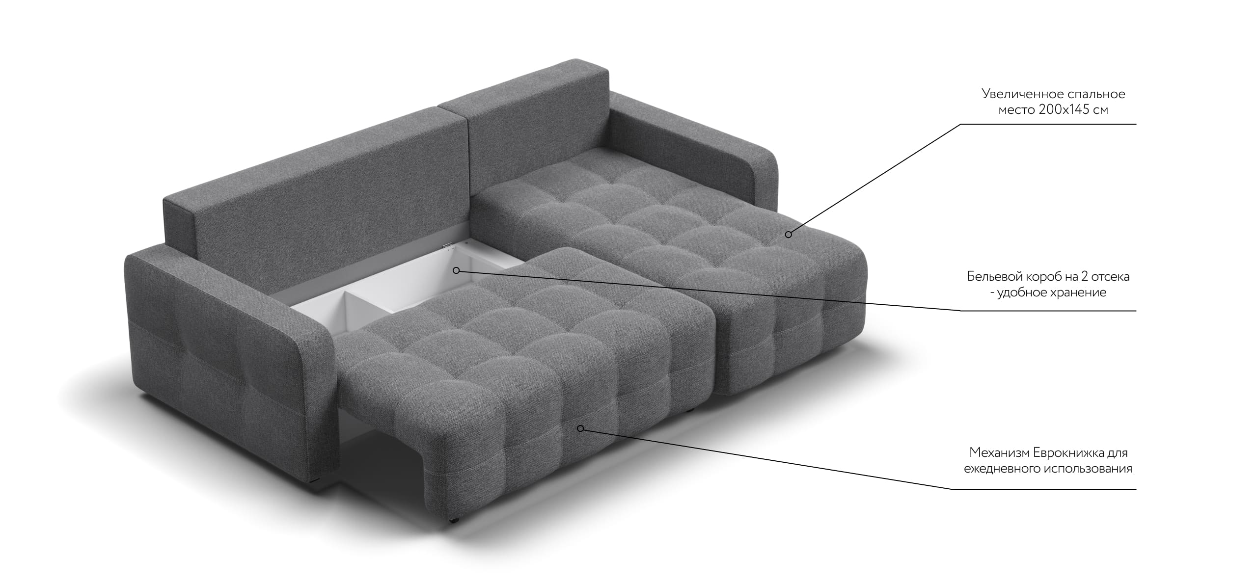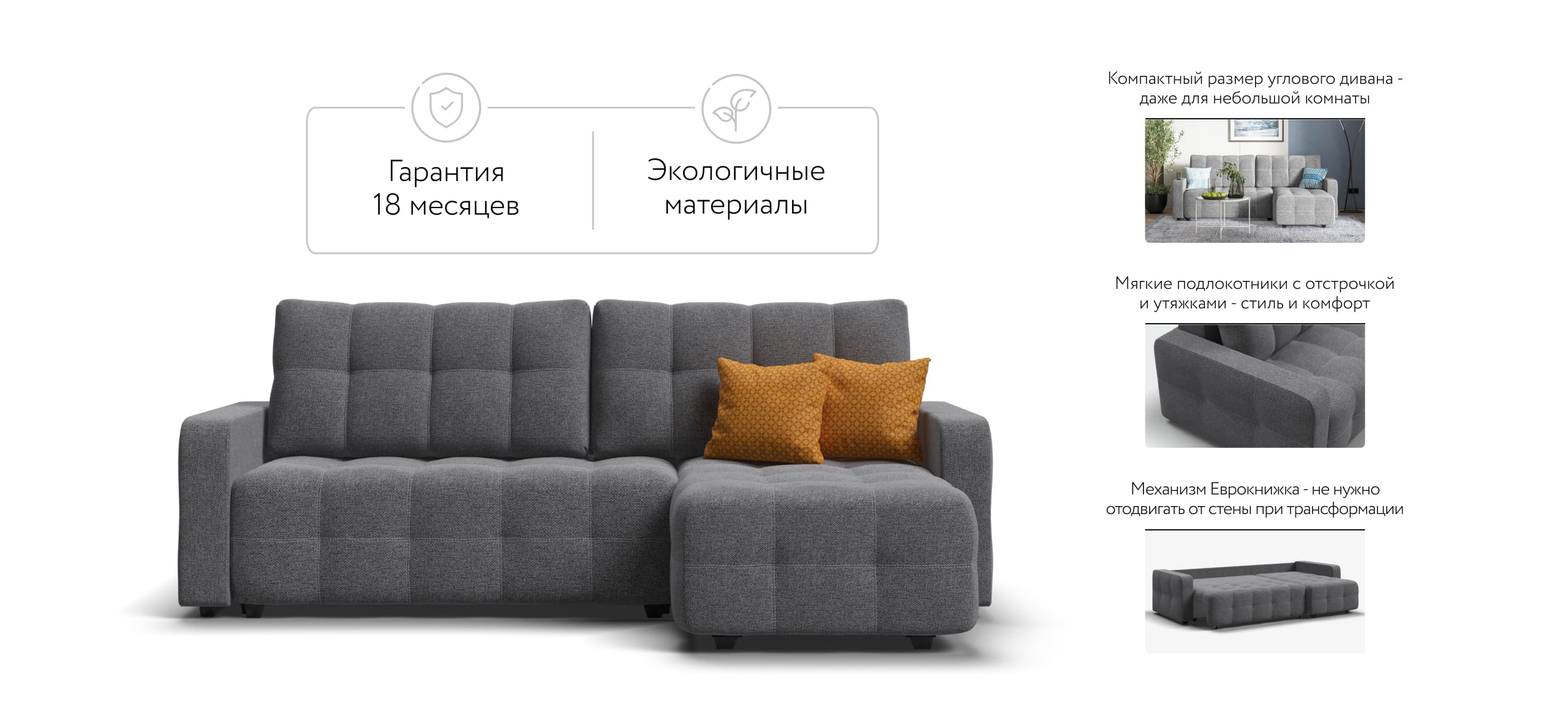 Простой и надежный механизм трансформации еврокнижка позволяет с легкостью раскладывать диван в удобную, полноценную, двуспальную кровать.