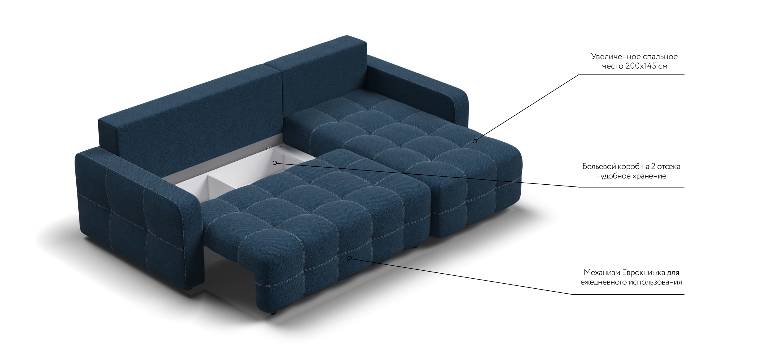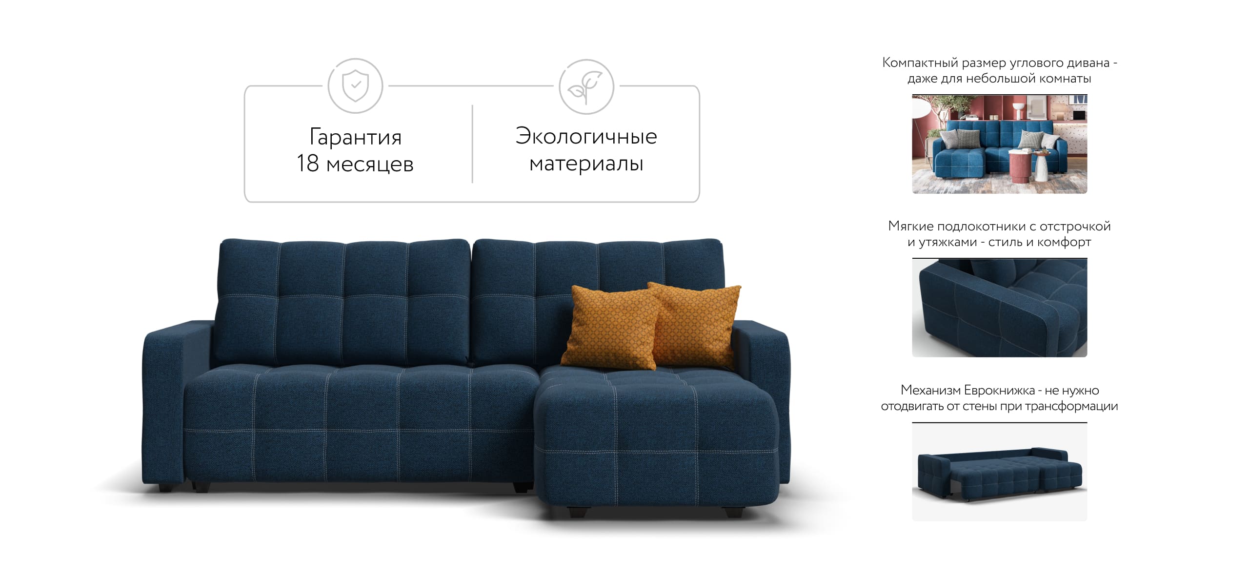 Простой и надежный механизм трансформации еврокнижка позволяет с легкостью раскладывать диван в удобную, полноценную, двуспальную кровать.