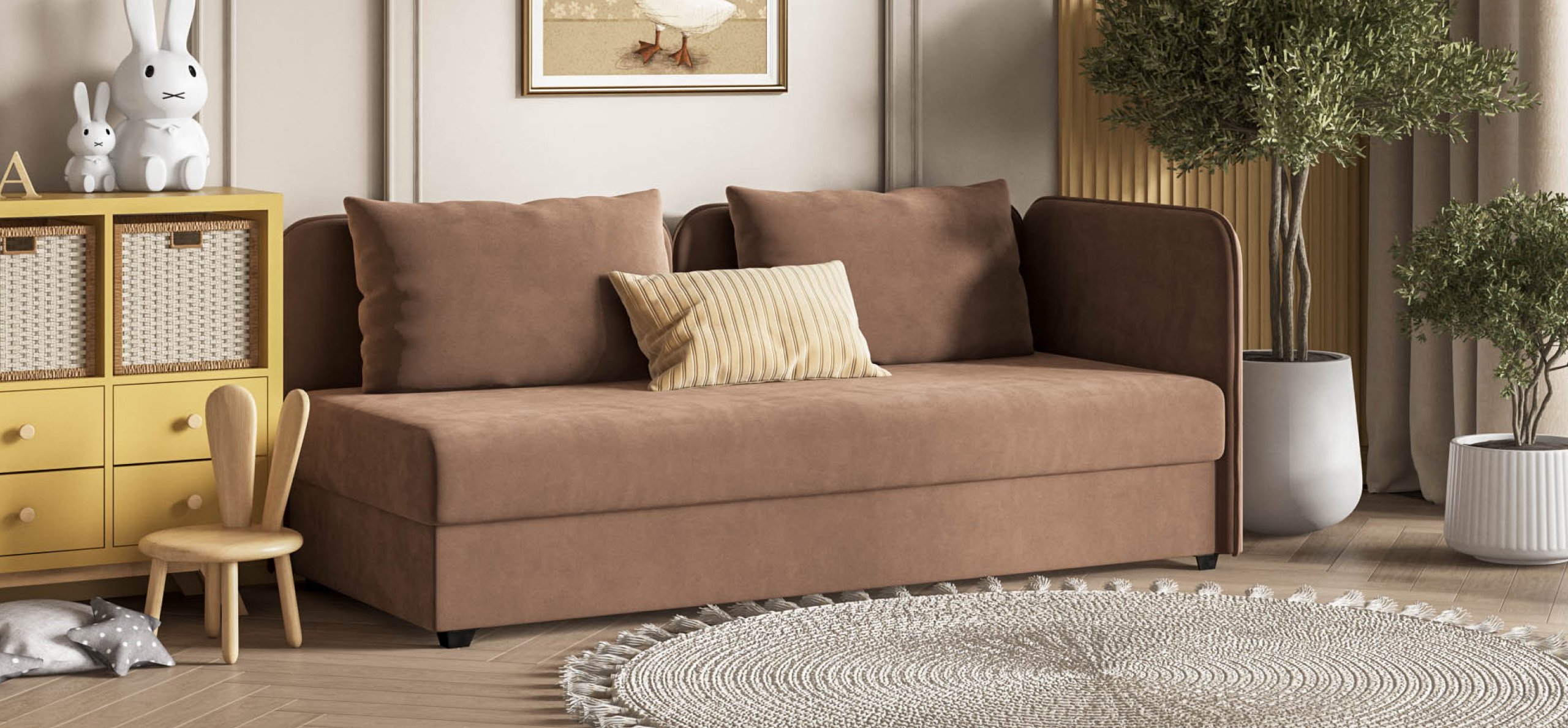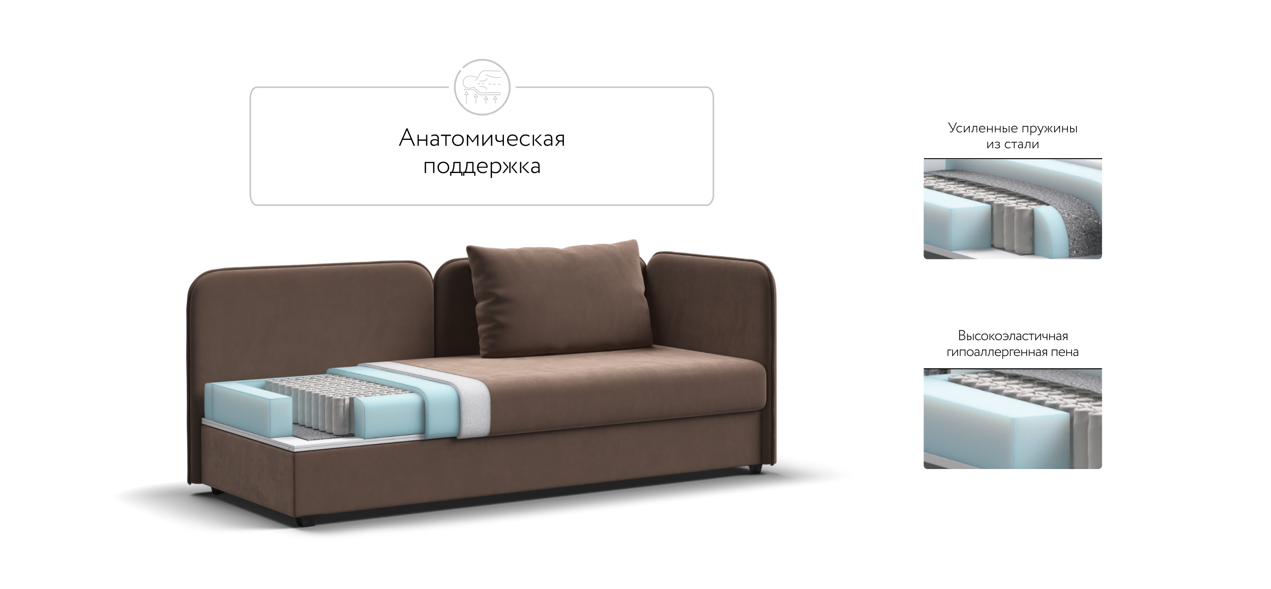 Вместительный бельевой короб в основании позволит Вам убрать на ночь приспинные подушки, а днем хранить постельные принадлежности.