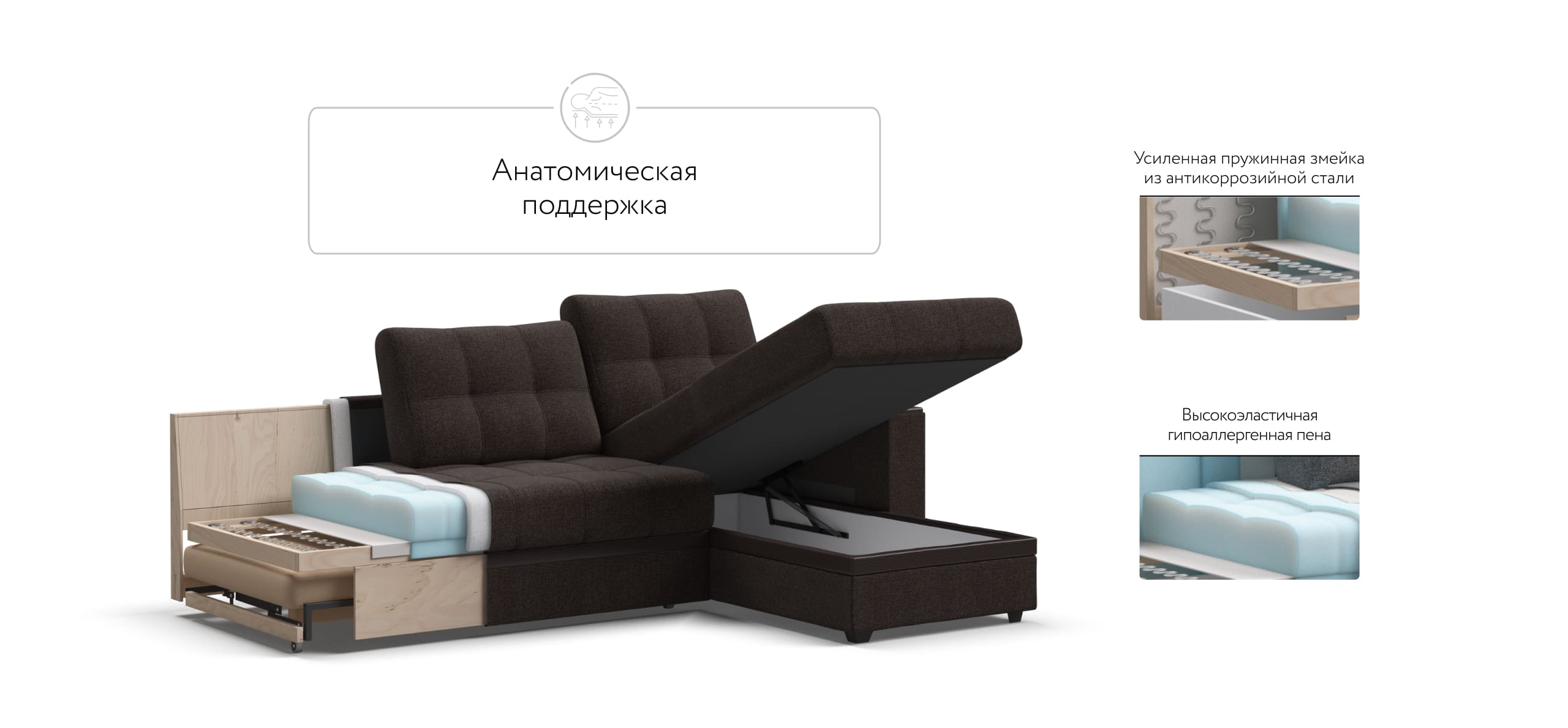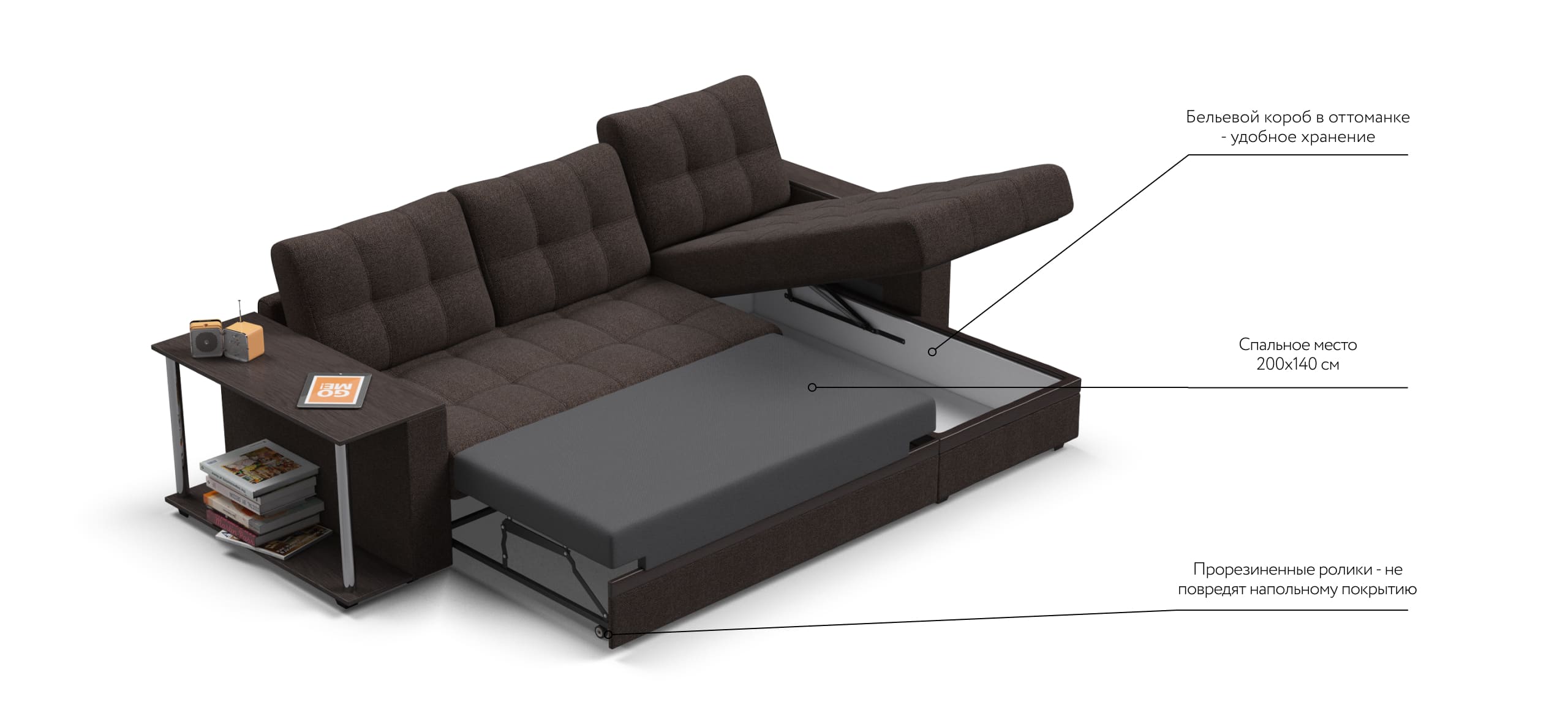 Модель оснащена прорезиненными колесиками, что обеспечит вам легкость раскладки и обезопасит от повреждений напольное покрытие. Не прилагая особых усилий, диван легко превратить в комфортную двуспальную кровать с идеально ровным спальным местом.