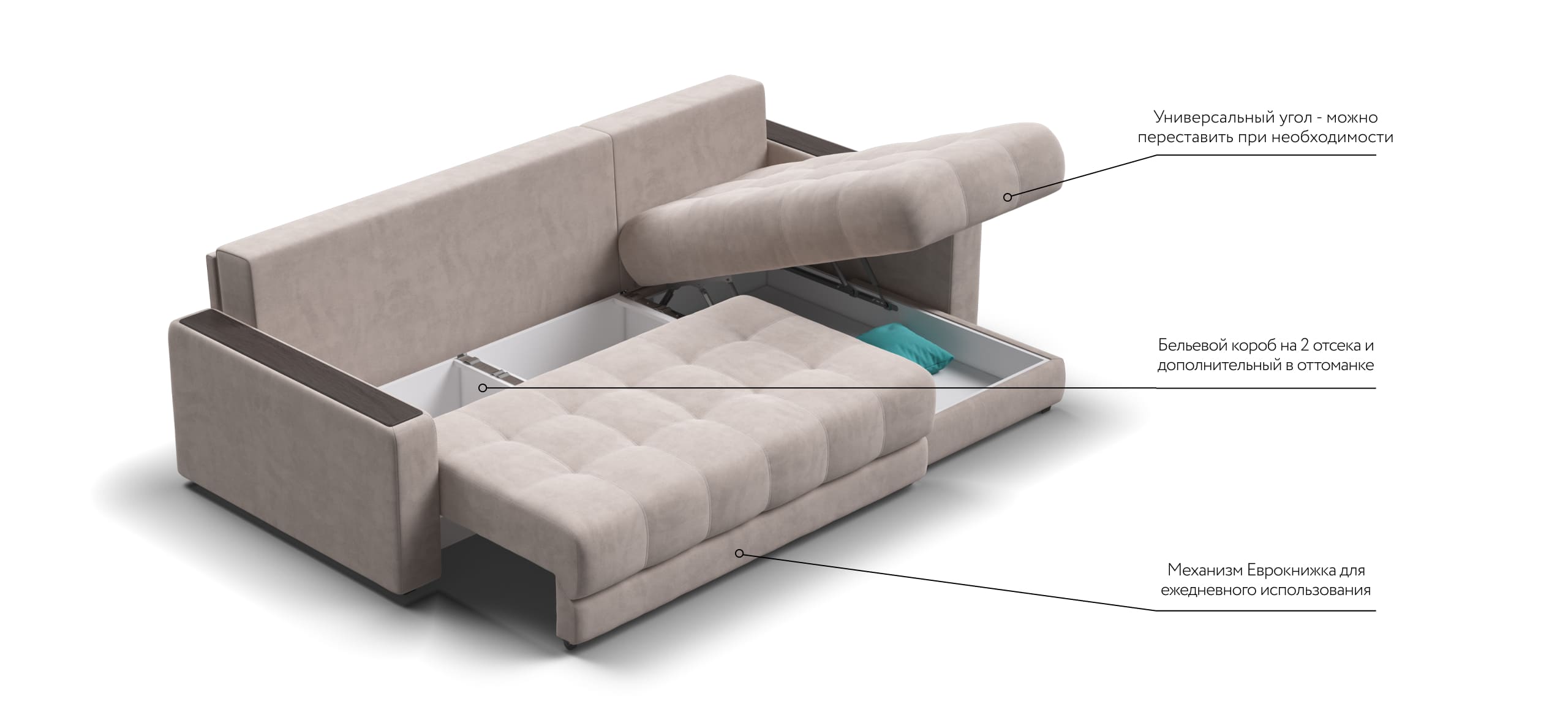 Угловой диван BOSS Classic XL - диван с подъемной оттоманкой и механизмом Еврокнижка.