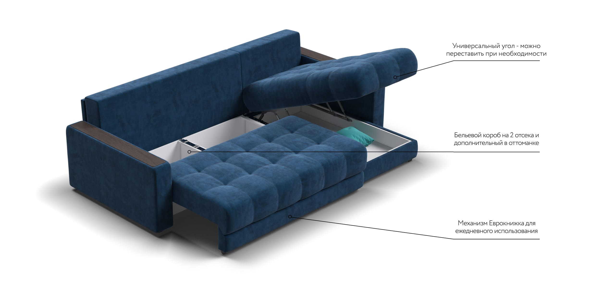 Угловой диван BOSS Classic XL - диван с подъемной оттоманкой и механизмом Еврокнижка.