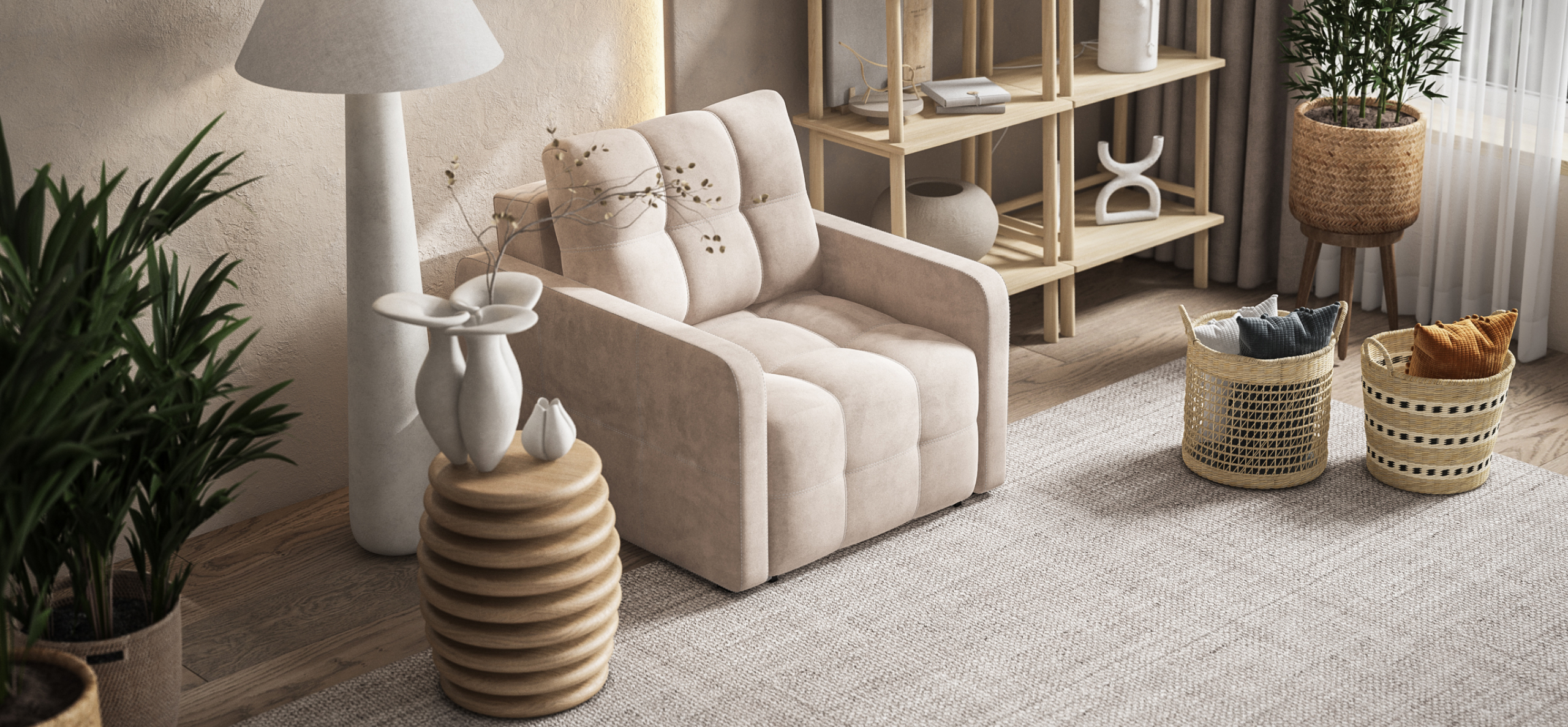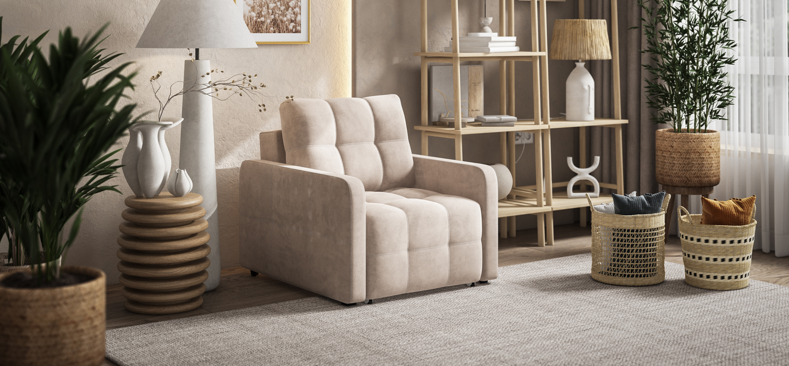 Благодаря современному механизму трансформации EASY-ROLL, кресло легко превращается в удобное спальное место, что делает его отличным вариантом для гостей или для уютных вечеров с книгой. С этим креслом-кроватью вы сможете создать атмосферу уюта и стиля в вашем доме, не жертвуя при этом свободным пространством.