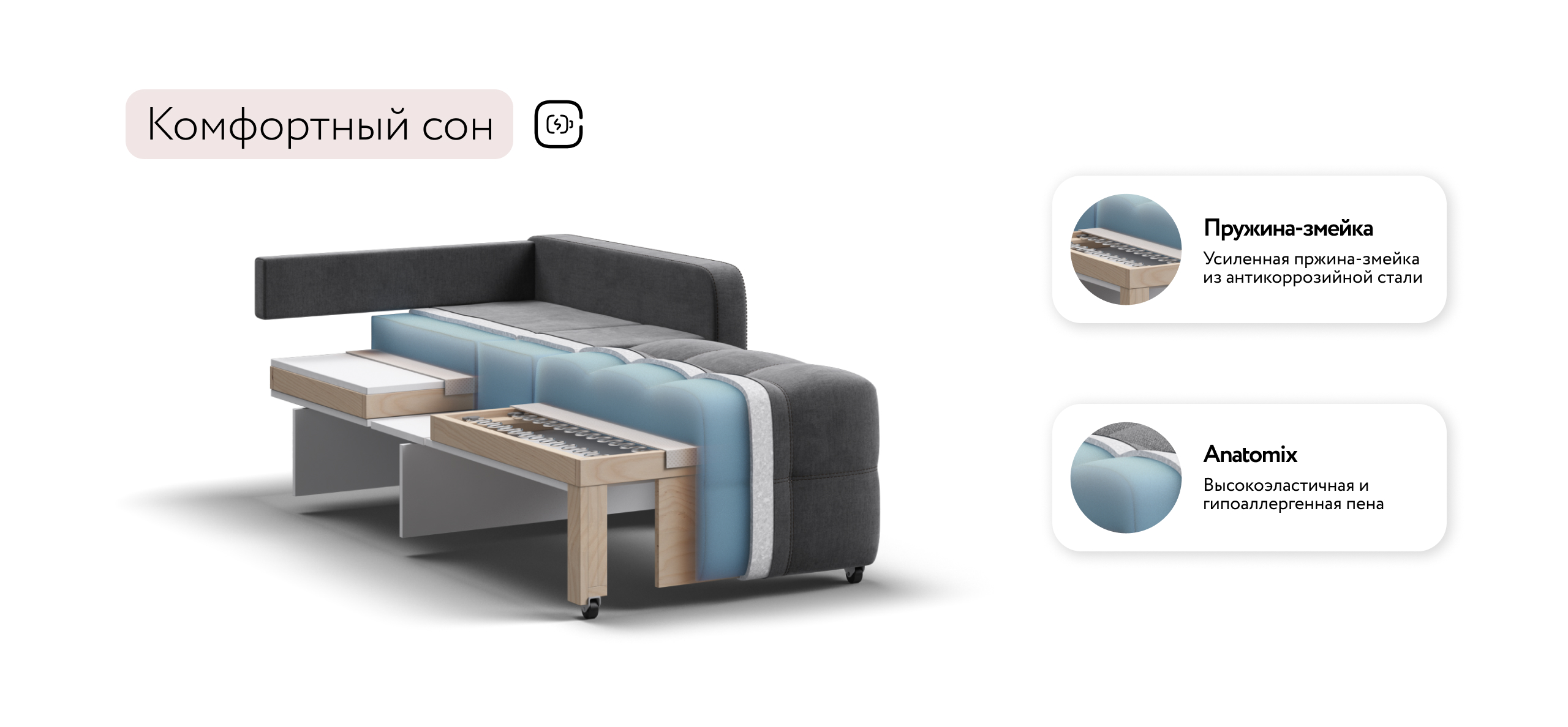 Ваш комфорт обеспечит матрас выполненный из высокоэластичного ППУ, в сочетании со стальной пружинной змейкой в основании