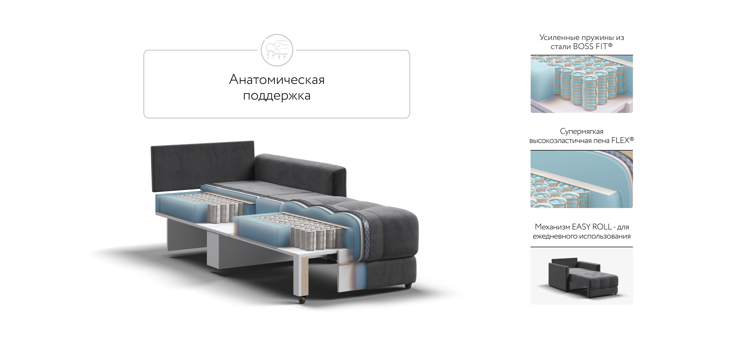 BOSS LOFT кресло-кровать - идеальное дополнение к дивану BOSS LOFT, отлично сочетает в себе две функции: подарит комфортный отдых днем и даст полноценное спальное место для гостя, который решил остаться у вас на ночь. Тонкие подлокотники идеальны для тех, кто ищет не классическое решение для своего интерьера.