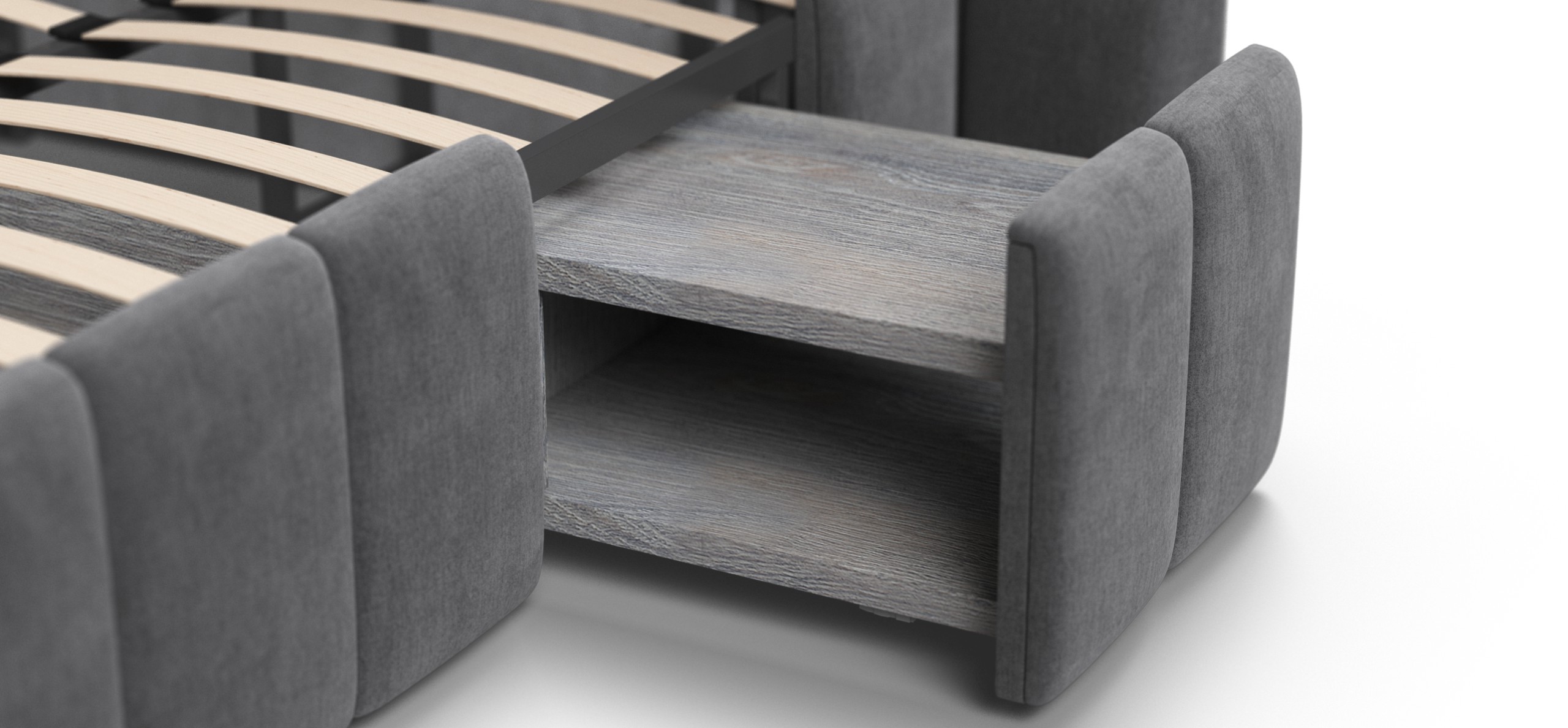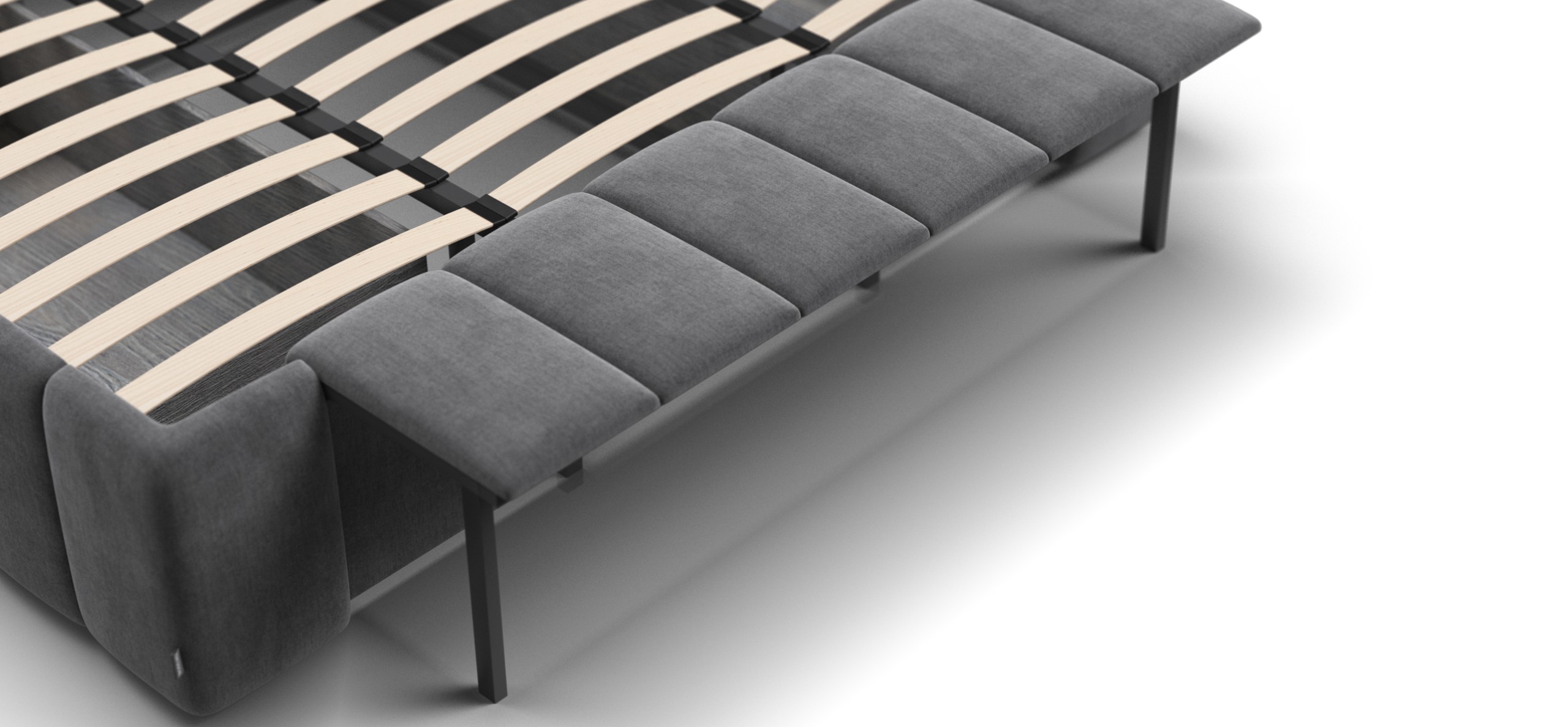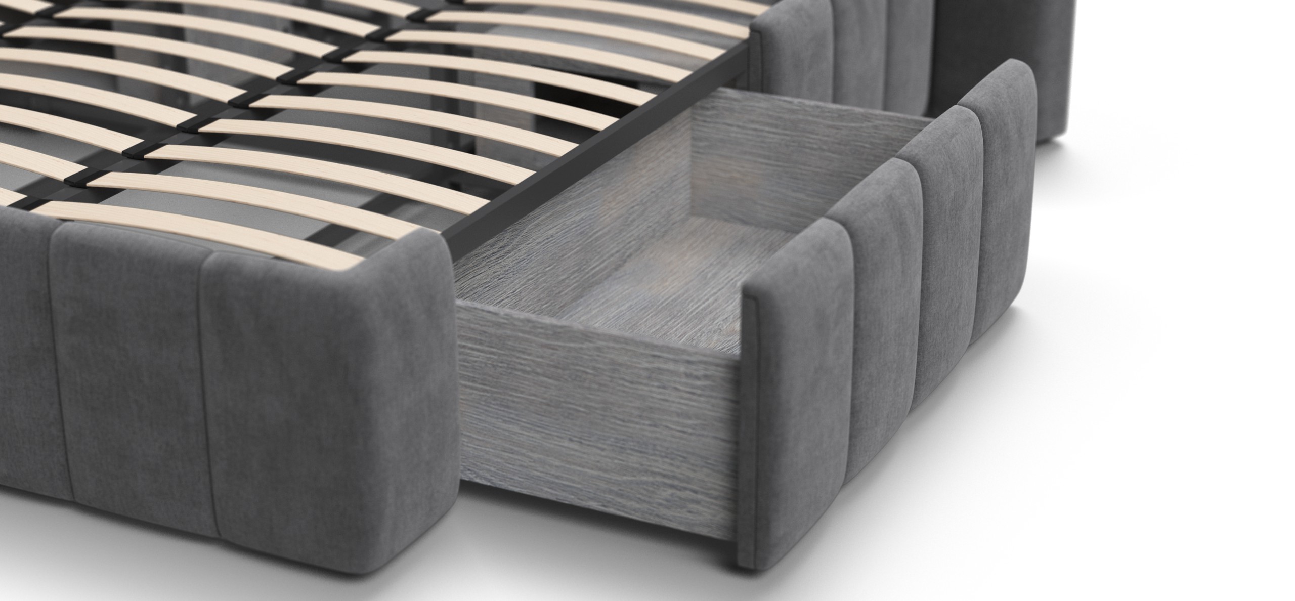 Каждая деталь очень качественно изготовлена. При сборке обратили внимание что в целом кровать очень продуманна, например при выдвижении тумбы, ящиков и банкетки не образуется пустое пространство куда например могут залезть домашние питомцы, все эти зоны продуманы перегородками.