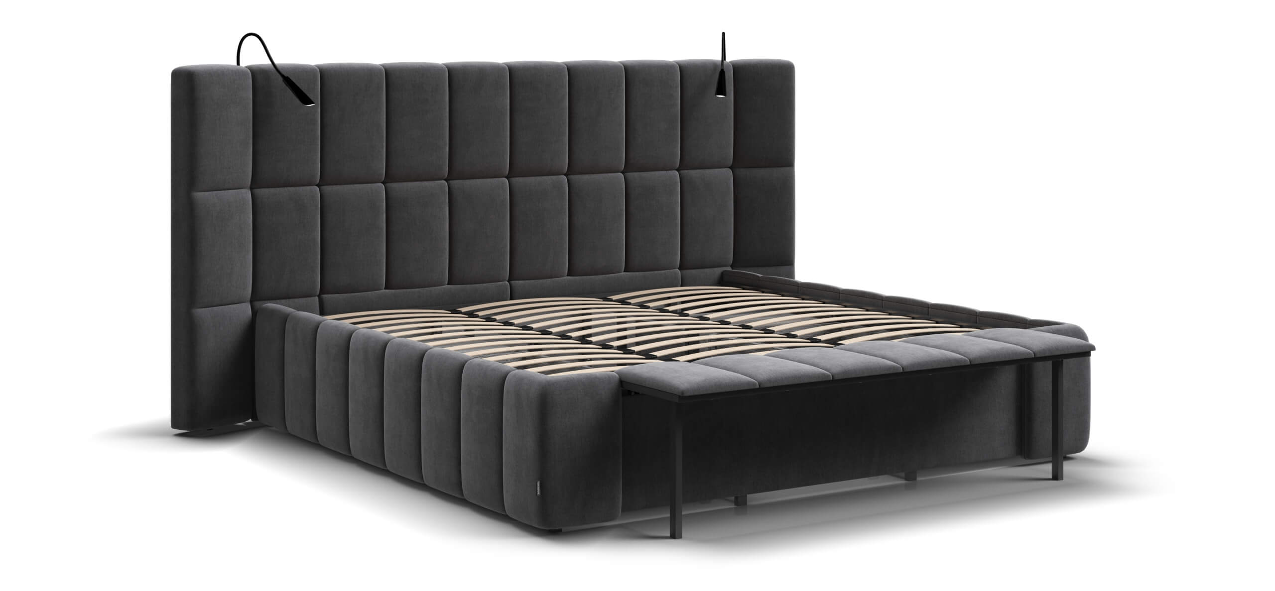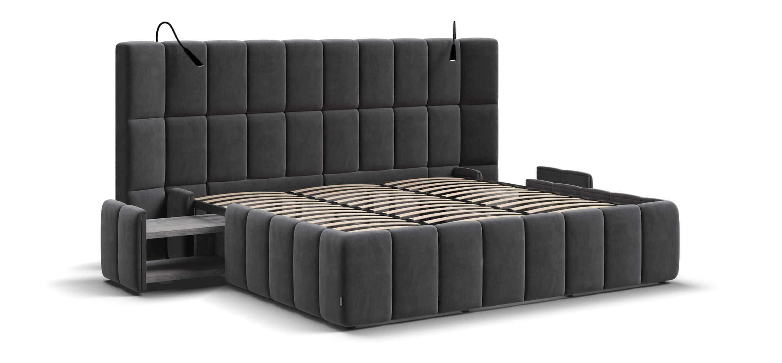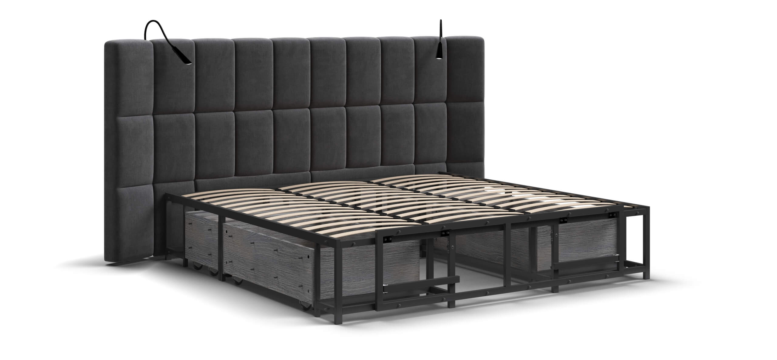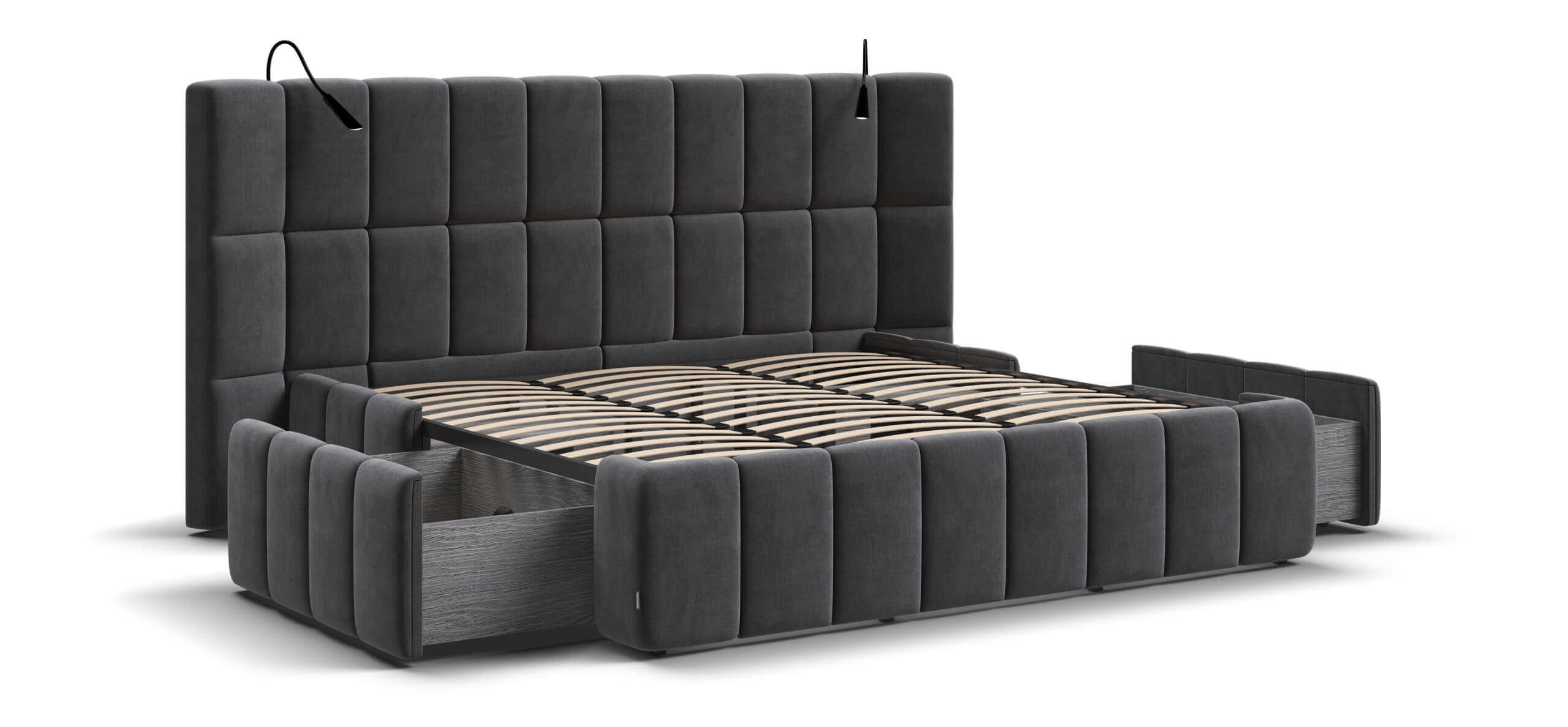 Каждая деталь очень качественно изготовлена. При сборке обратили внимание что в целом кровать очень продуманна, например при выдвижении тумбы, ящиков и банкетки не образуется пустое пространство куда например могут залезть домашние питомцы, все эти зоны продуманы перегородками.