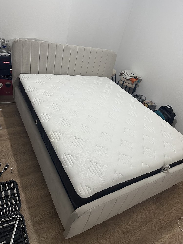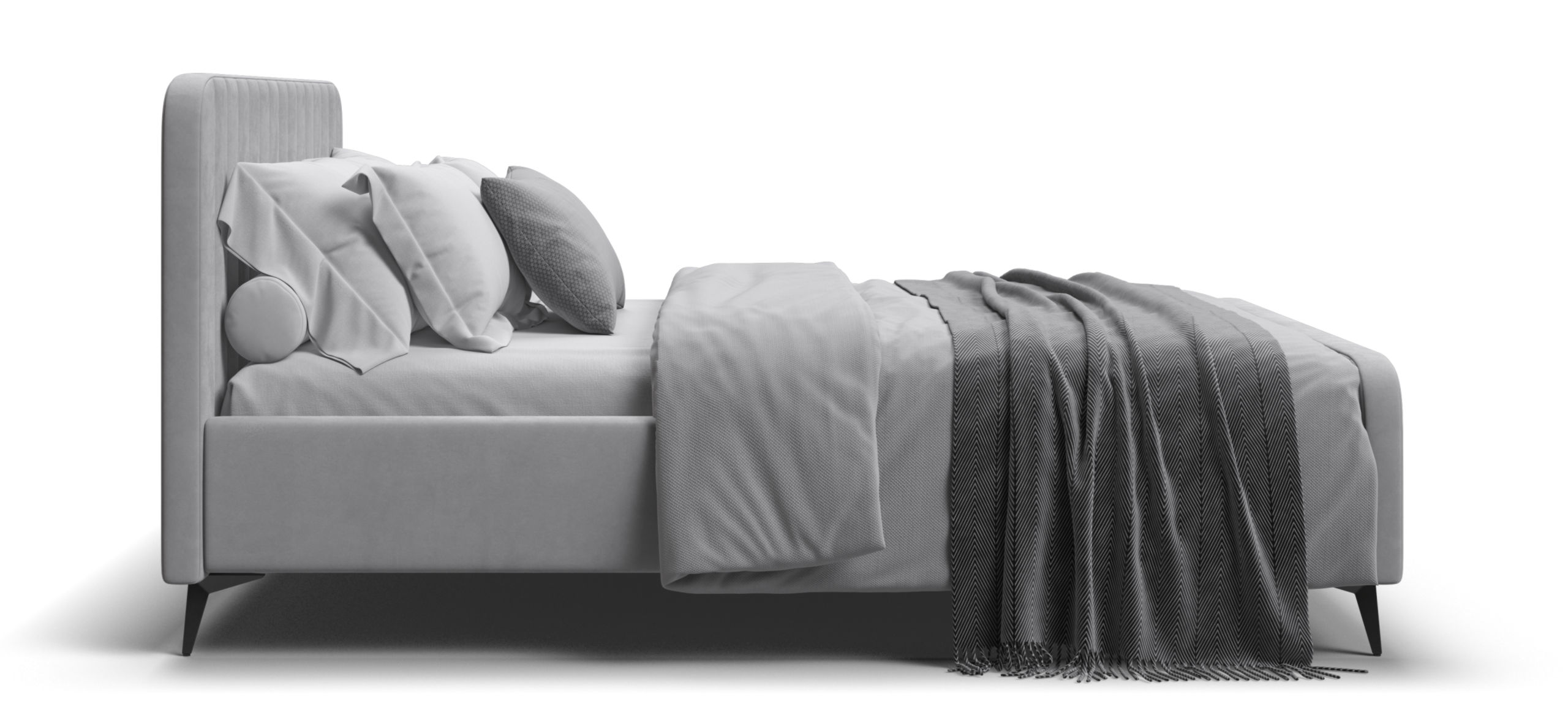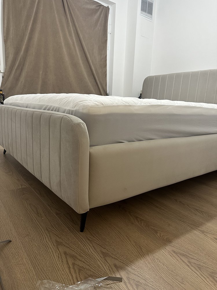 Изножье кровати также не уступает в пухлости и визуальной привлекательности, обеспечивая безопасность и эстетику. Высокие ножки из черного металла придают легкость внешнему виду и упрощают уборку, позволяя роботу-пылесосу свободно передвигаться под кроватью.