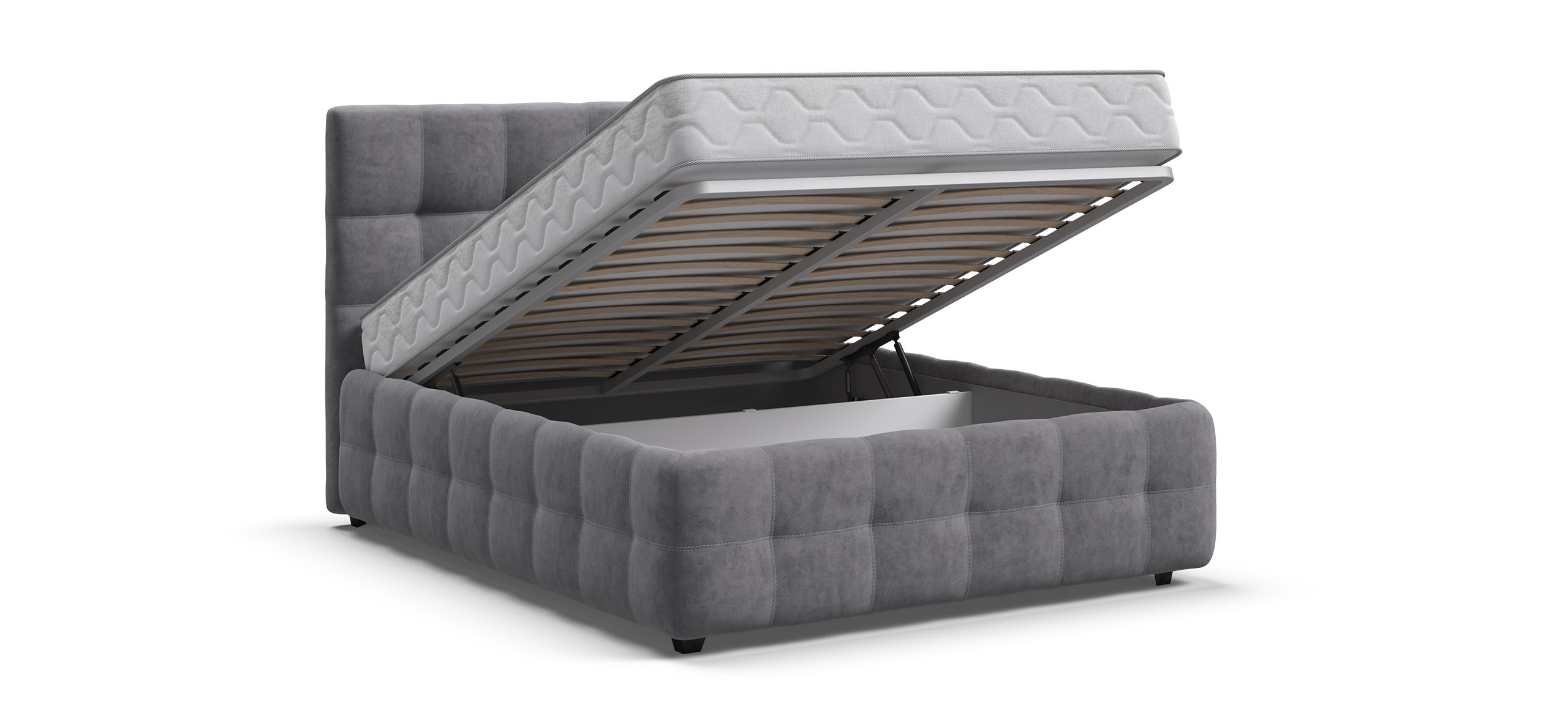 Особое внимание заслуживают газовые лифты SpaceLift, изготовленные из авиационного алюминия. Они обеспечивают лёгкое и плавное поднятие матраса, что делает доступ к отсеку для хранения быстрым и удобным. Дизайн 360 предполагает, что задняя часть спинки кровати также выполнена из основной ткани, что позволяет размещать кровать не только у стены, но и в центре комнаты, сохраняя при этом её эстетическую привлекательность.