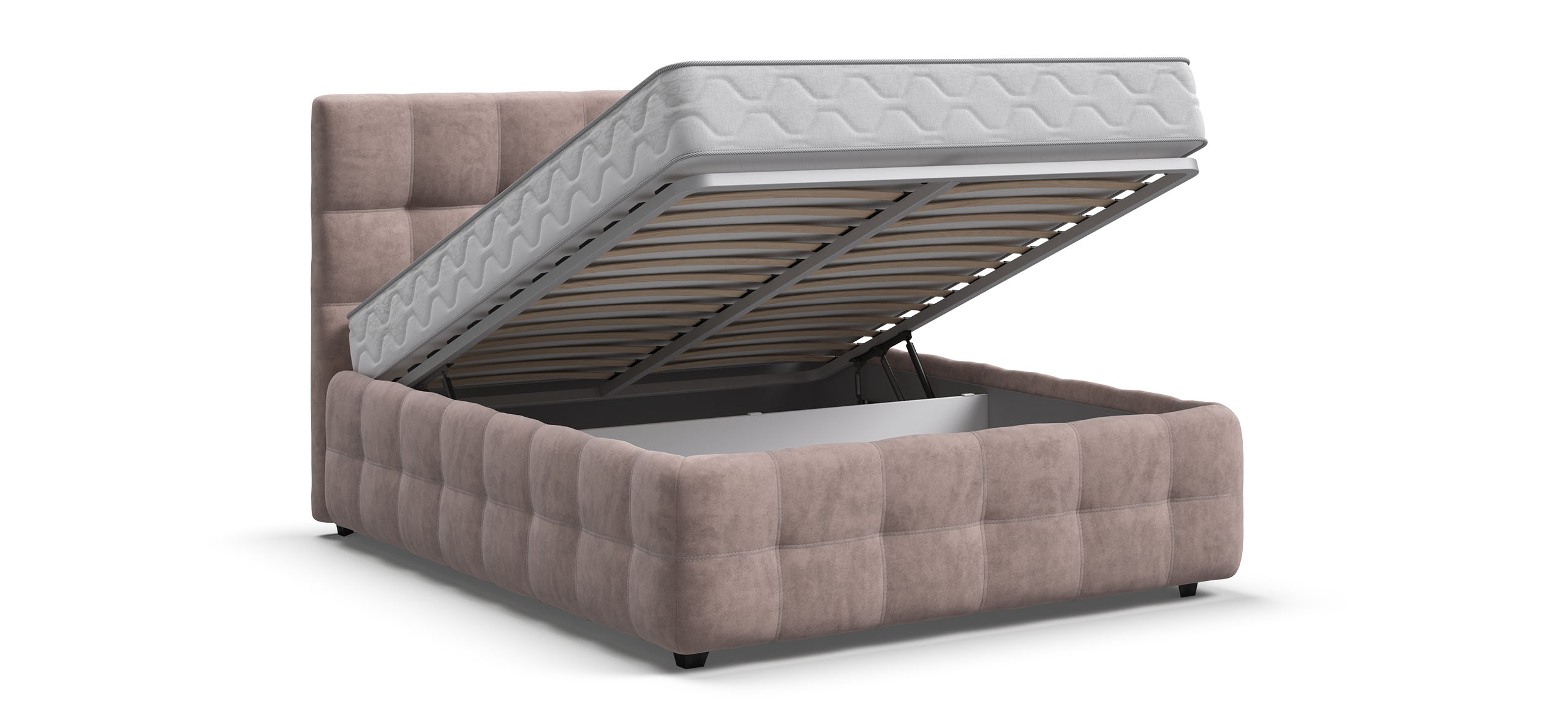 Особое внимание заслуживают газовые лифты SpaceLift, изготовленные из авиационного алюминия. Они обеспечивают лёгкое и плавное поднятие матраса, что делает доступ к отсеку для хранения быстрым и удобным. Дизайн 360 предполагает, что задняя часть спинки кровати также выполнена из основной ткани, что позволяет размещать кровать не только у стены, но и в центре комнаты, сохраняя при этом её эстетическую привлекательность.