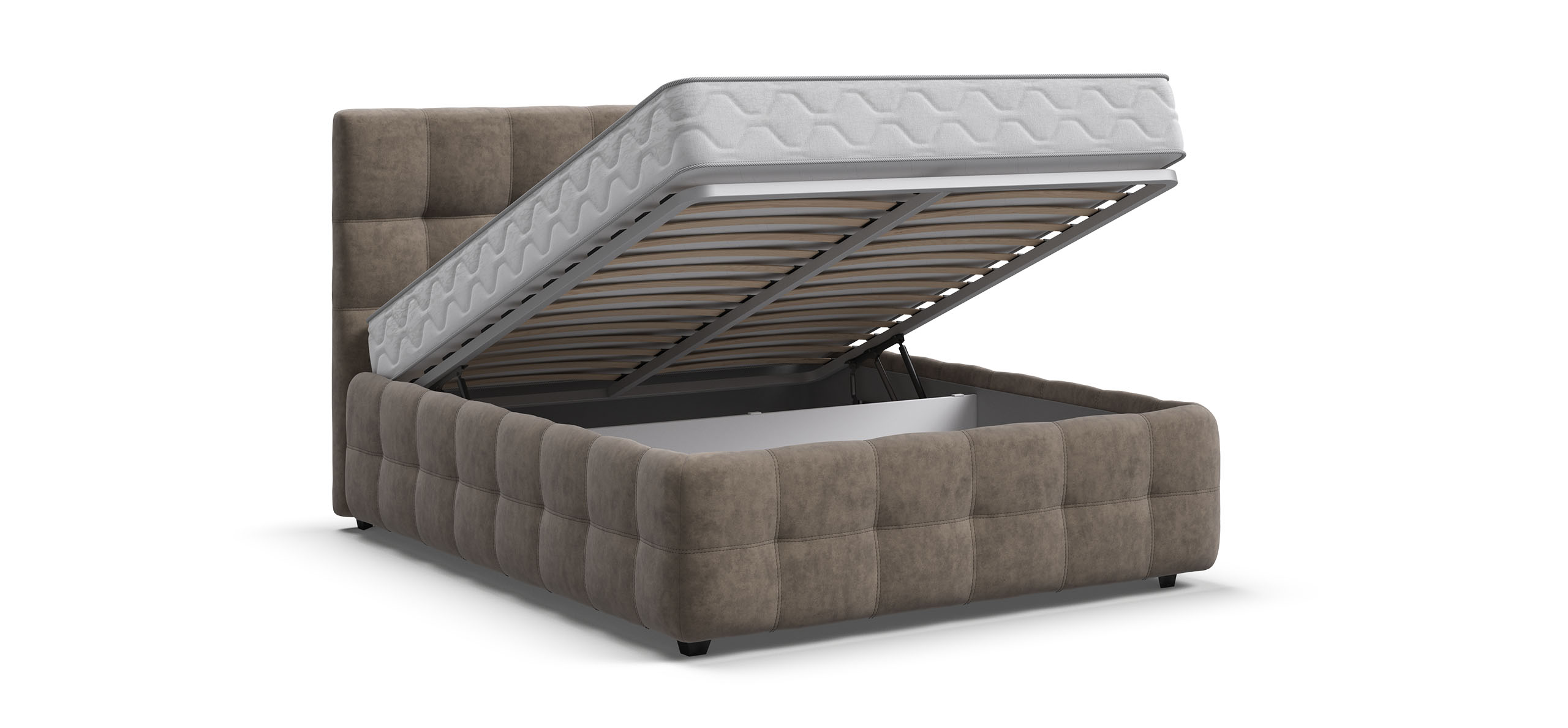 Особое внимание заслуживают газовые лифты SpaceLift, изготовленные из авиационного алюминия. Они обеспечивают лёгкое и плавное поднятие матраса, что делает доступ к отсеку для хранения быстрым и удобным. Дизайн 360 предполагает, что задняя часть спинки кровати также выполнена из основной ткани, что позволяет размещать кровать не только у стены, но и в центре комнаты, сохраняя при этом её эстетическую привлекательность.