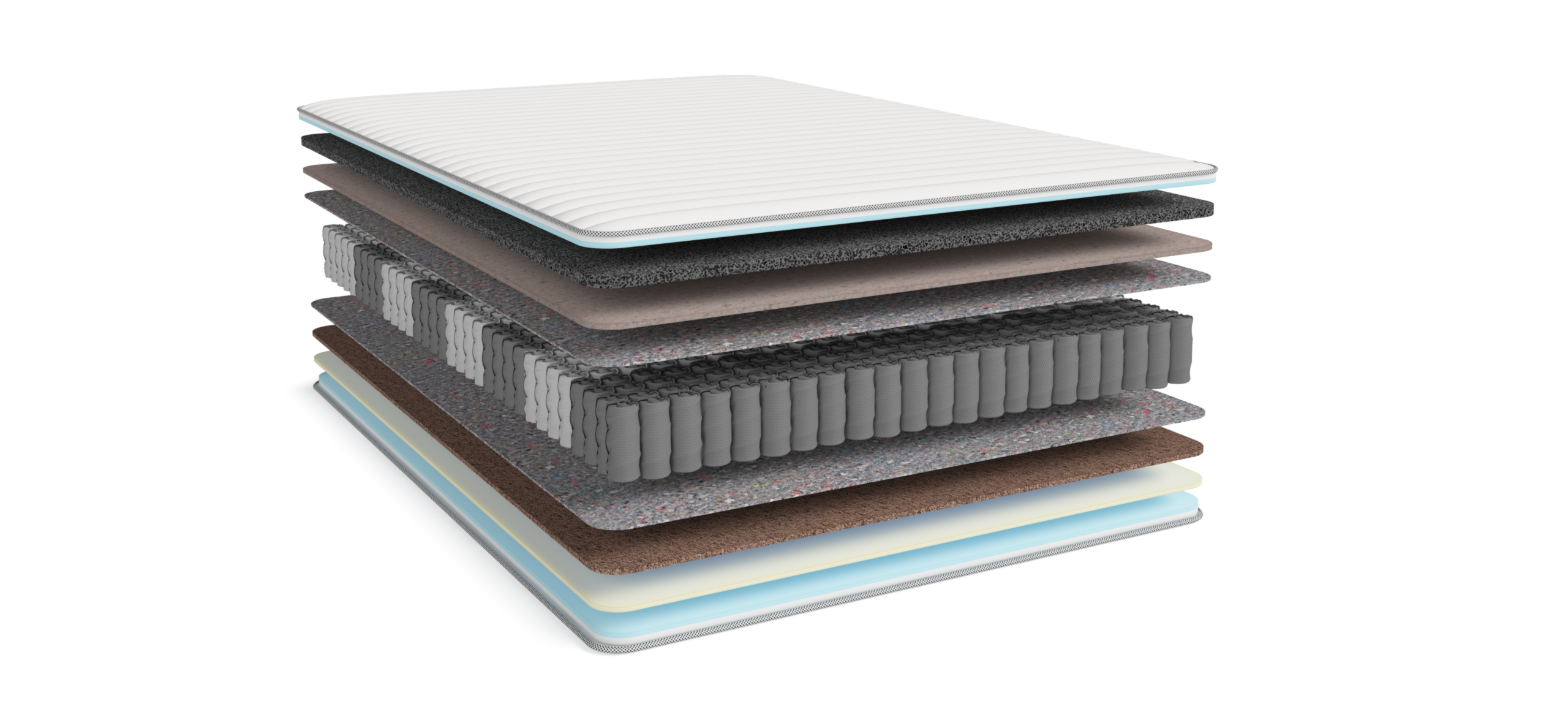 Угольная пена CARBONE FOAM, слой BOSS SKIN, термовойлок, НПБ COMFY SPRING 750, латексированная кокосовая койра, искусственный латекс