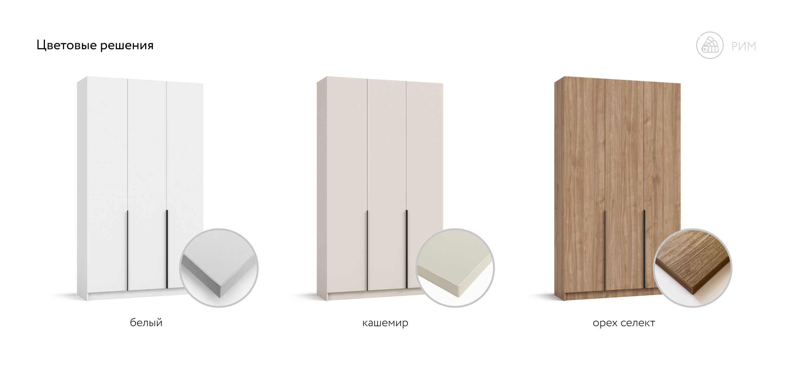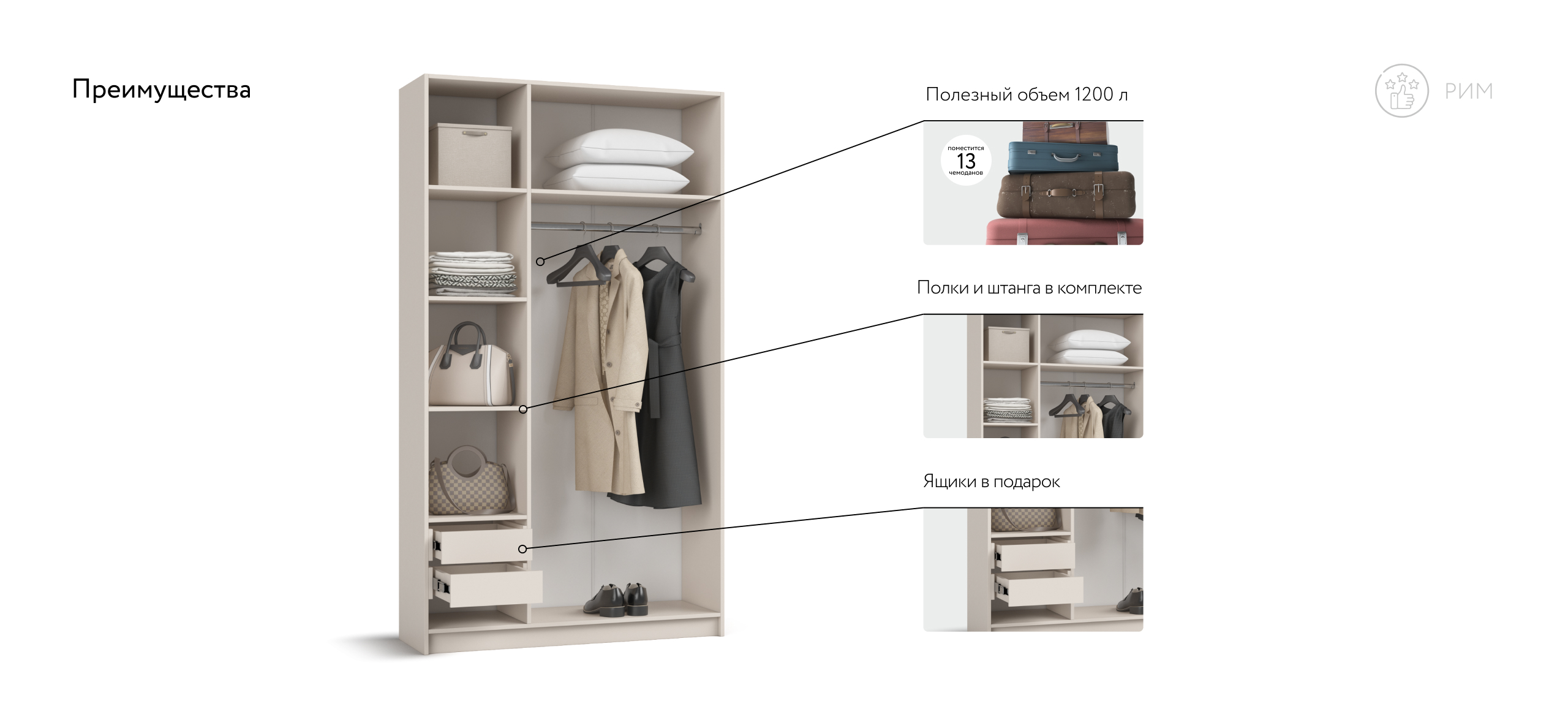 Гибкая компоновка превращает Рим 120 в личный конструктор хранения. Полки и два выдвижных ящика можно установить либо справа, либо слева — под планировку комнаты и ваши привычки. Ящики на шариковых направляющих выдвигаются плавно и бесшумно, а створки открываются лёгким движением, не отвлекая от утренней рутины.