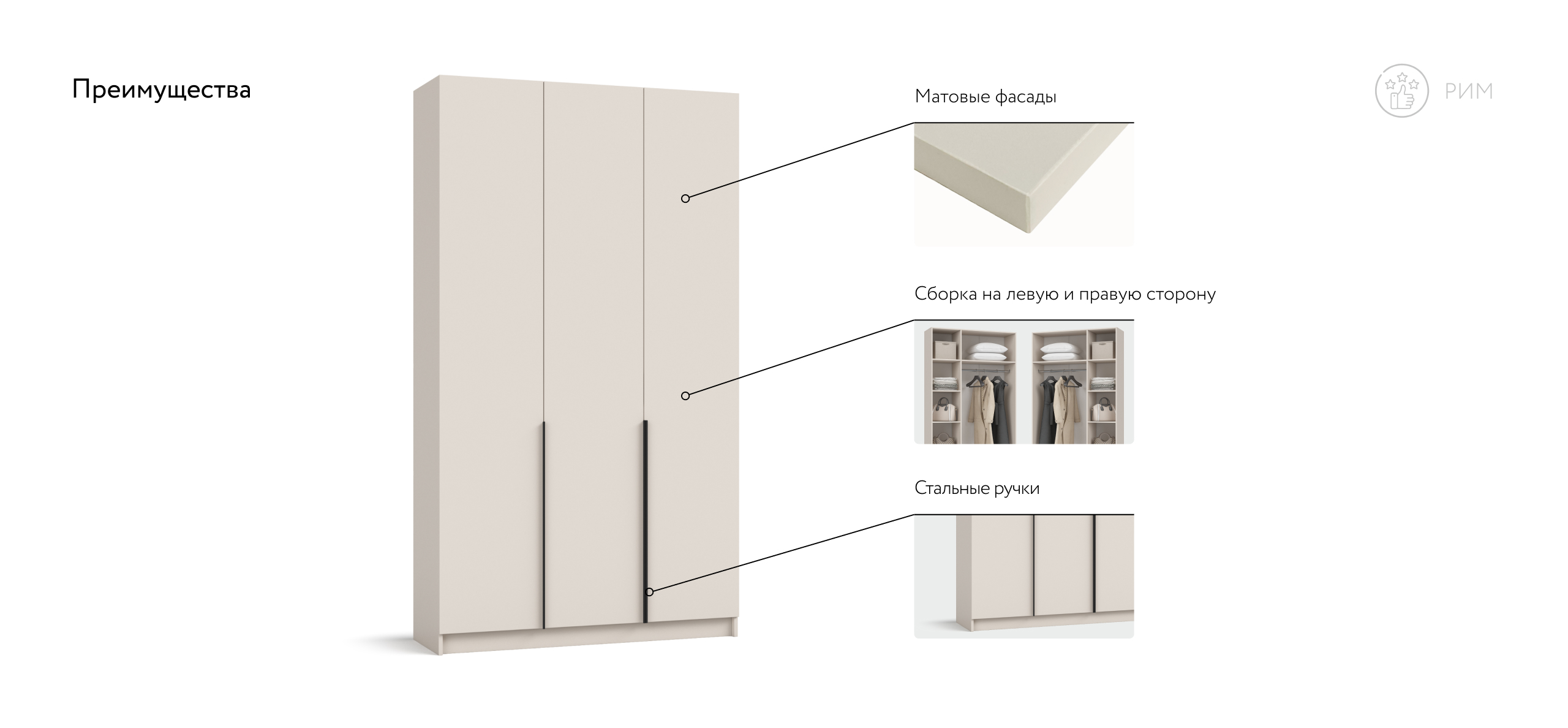 Шкаф Рим 120 — современный ответ на главный запрос городской квартиры: хранить много, занимая мало. Лаконичный фасад с удлинёнными чёрными ручками отсылает к актуальной эстетике 2025 года и делает шкаф ярким акцентом в любом интерьере — от сканди до неоклассики. Внутри продуман каждый сантиметр: просторное отделение легко принимает сезонный гардероб, коробки с обувью и постельное бельё, сохраняя порядок и освобождая комнату от лишних вещей.