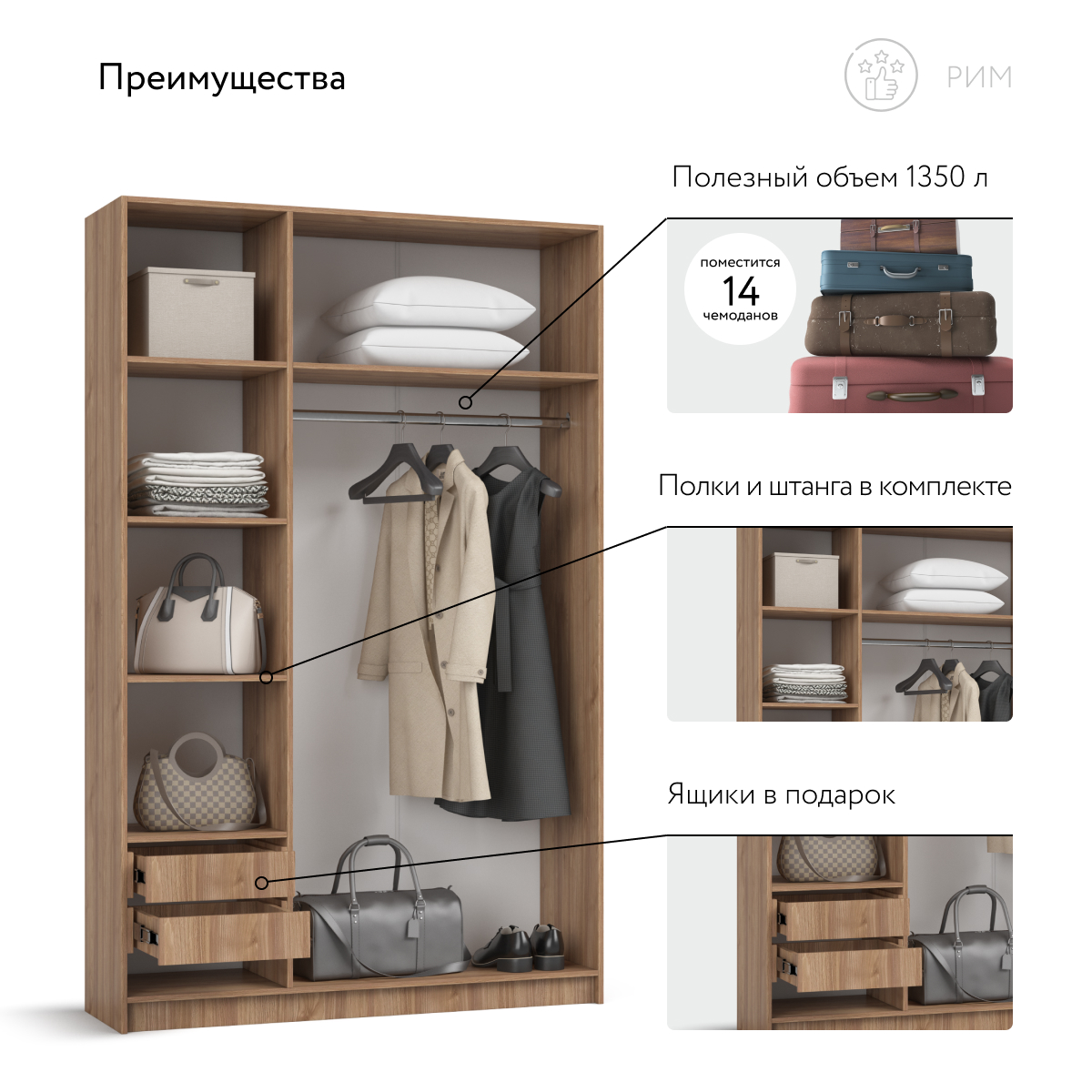 Корпус выполнен из безопасной ЛДСП класса Е1 с устойчивым к истиранию покрытием, чтобы цвет и текстура радовали долгие годы. Рим 135 создаёт ощущение простора и упорядоченности, превращая спальню или гостевую комнату в гармоничное, дышащее пространство. Выберите шкаф, который не просто хранит вещи, а наводит стильный порядок в вашей жизни.