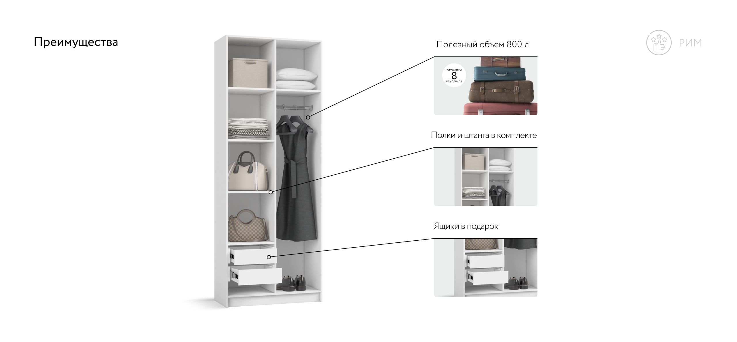 Гибкая компоновка превращает Рим 80 в персональный конструктор хранения. Полки и два выдвижных ящика можно расположить справа или слева — как подсказывает планировка и ваши привычки. Ящики на шариковых направляющих выходят плавно и бесшумно, а створки открываются лёгким движением, не нарушая утренний ритм.