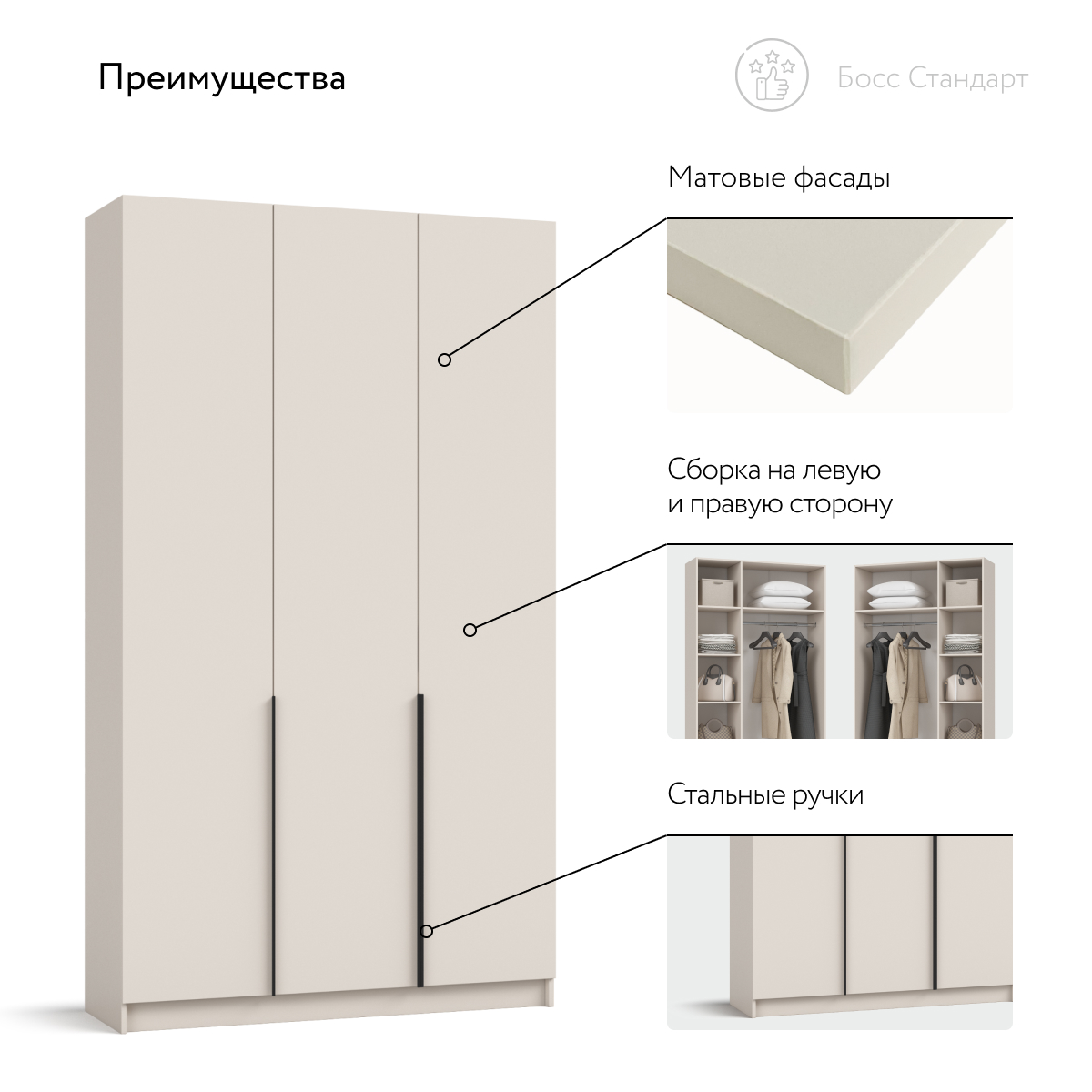Шкаф Босс Стандарт 120 — современное статусное решение для городской квартиры: хранить много, занимая минимум места. Лаконичный фасад с вытянутыми чёрными ручками отражает эстетику 2025 года и становится выразительным акцентом интерьера — от сканди до неоклассики. Каждый сантиметр внутри задействован: просторное отделение легко принимает сезонный гардероб, коробки с обувью и постельное бельё, поддерживая порядок и освобождая комнату от лишнего.