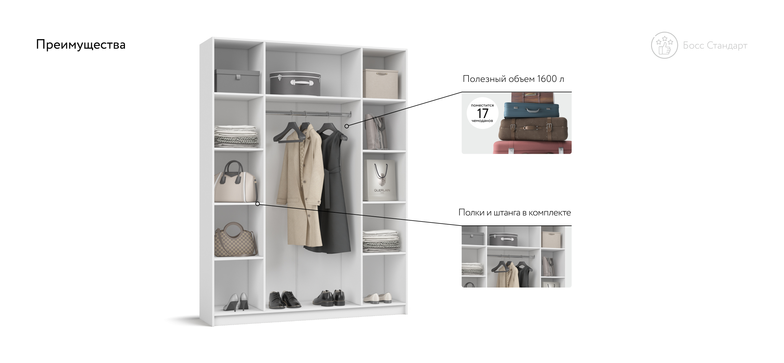 Корпус изготовлен из экологичной ЛДСП Е1 с износостойким покрытием, чтобы фактура и цвет радовали долгие годы. Босс Стандарт 160 дарит ощущение простора и упорядоченности, превращая спальню или гостевую комнату в гармоничное, «дышащее» пространство. Выберите шкаф, который не просто хранит вещи, а подчёркивает статус вашего интерьера.