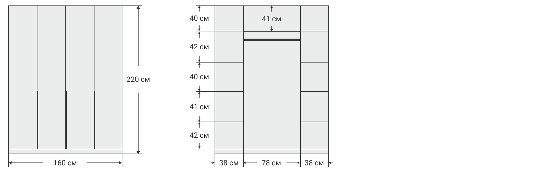 По бокам — две зеркальные секции с полками на всю высоту, в центре — штанга для длинной одежды. Полки выдерживают серьёзную нагрузку, а двери с премиальными доводчиками открываются плавно и бесшумно, поддерживая спокойный утренний ритм и избавляя от споров о «главной» стороне.