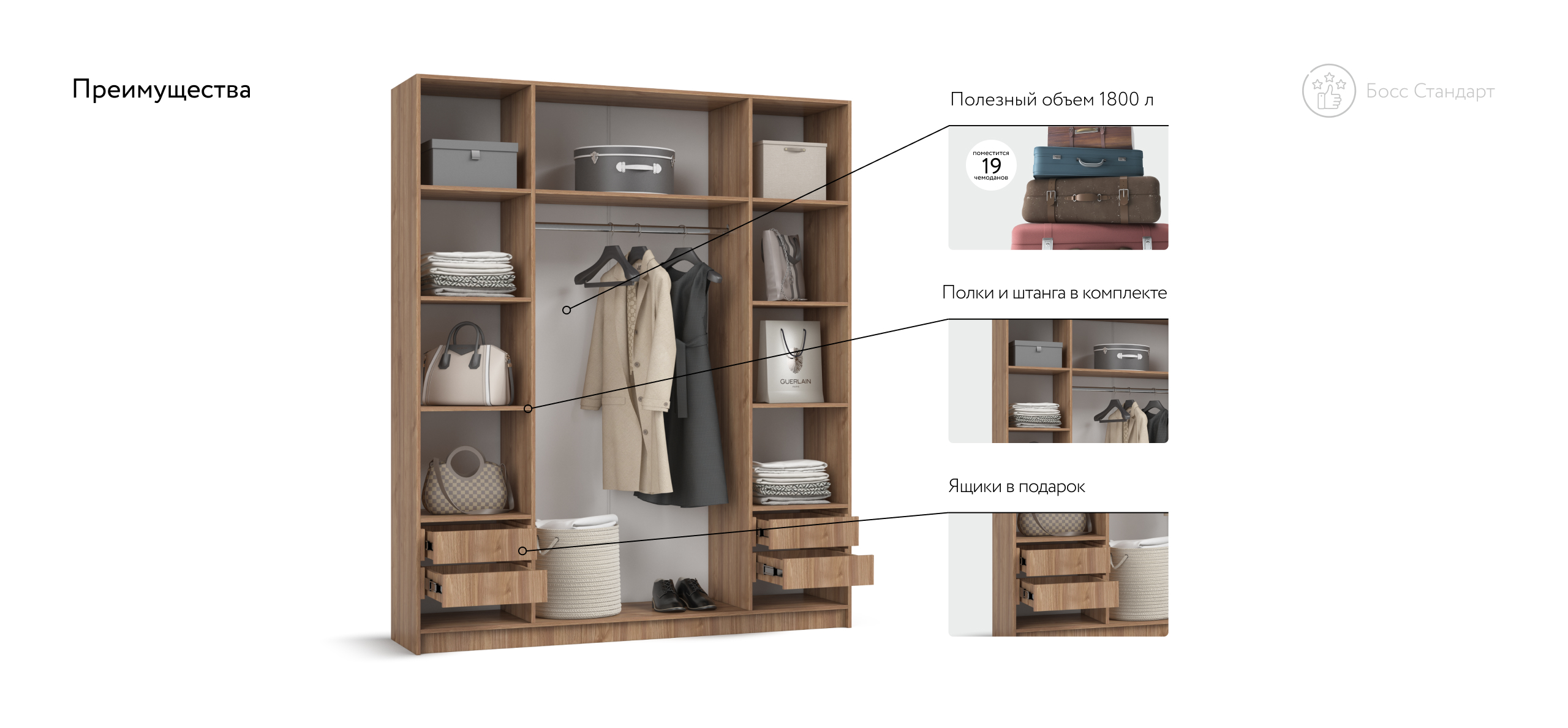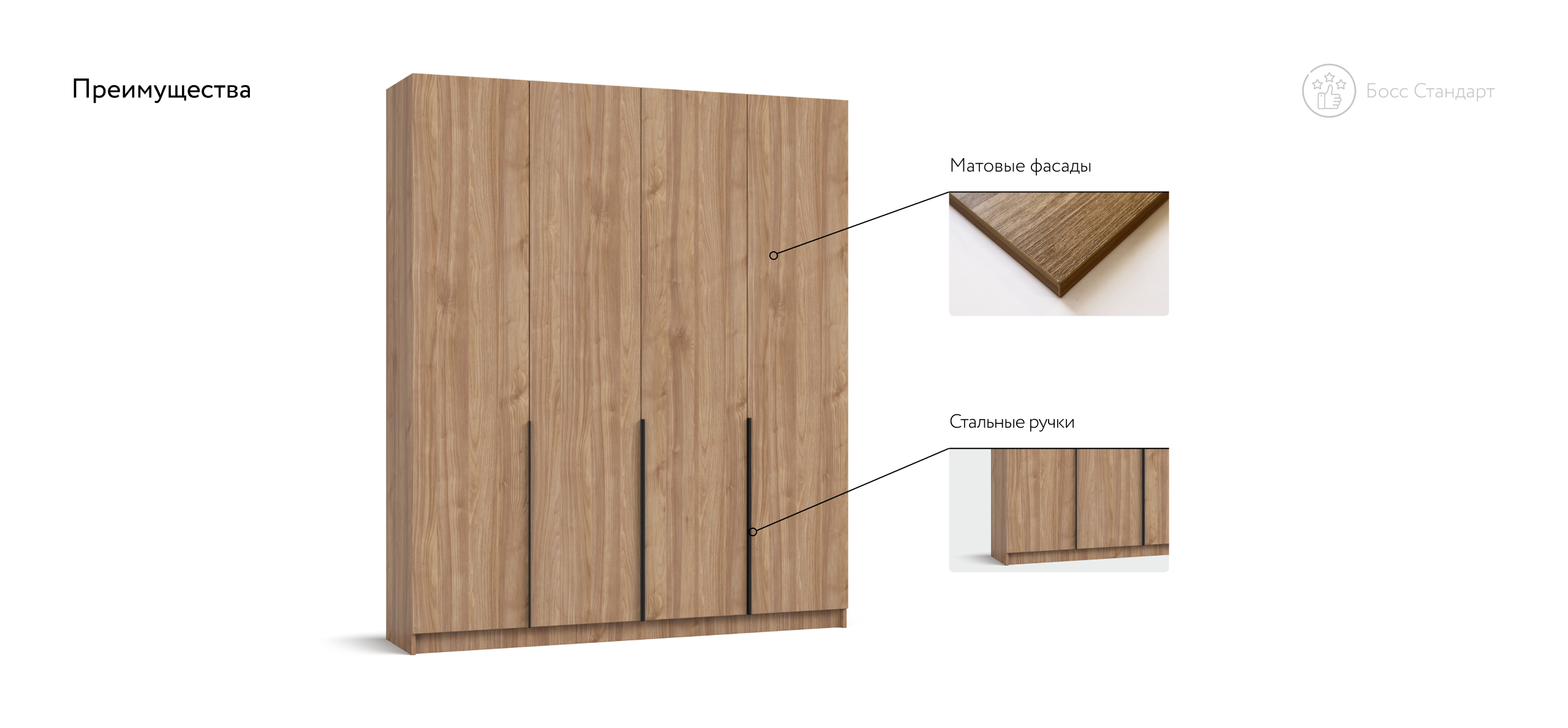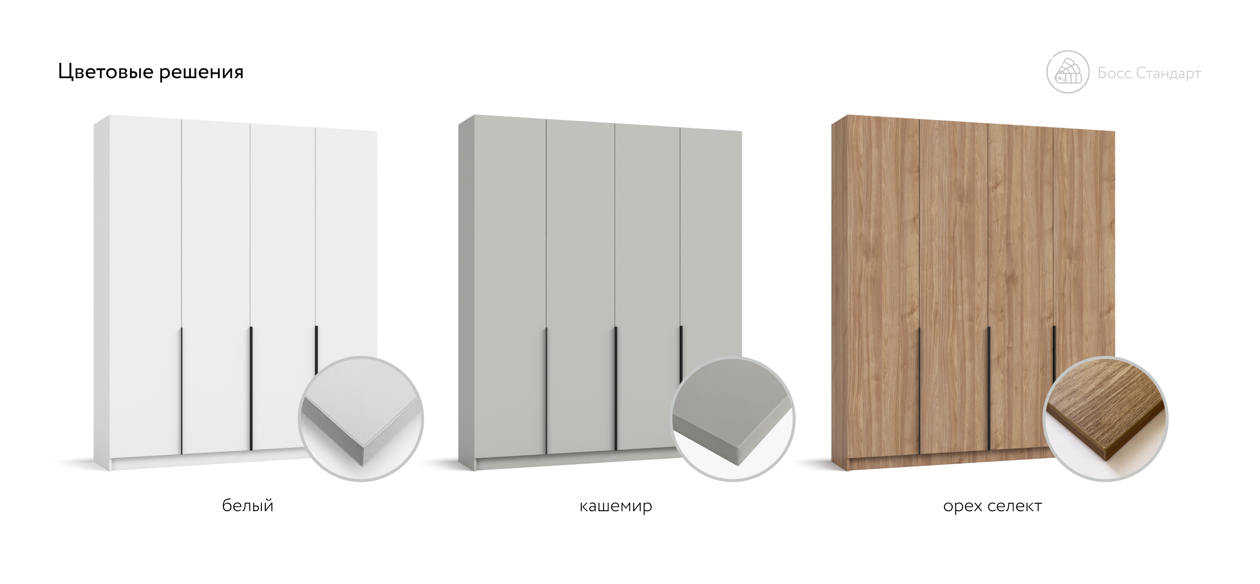 Корпус изготовлен из безопасной ЛДСП Е1 с износостойким покрытием, чтобы фактура и цвет радовали долгие годы. Босс Стандарт 180 дарит ощущение простора и упорядоченности, превращая спальню или гостевую в гармоничное, «дышащее» пространство. Выберите шкаф, который не просто хранит вещи, а подчёркивает статус вашего интерьера.